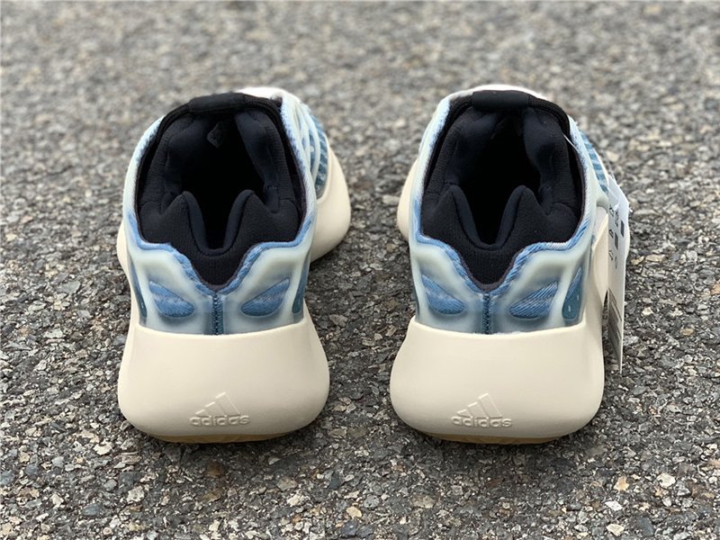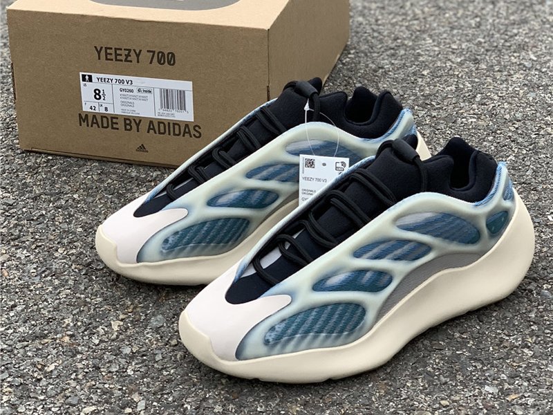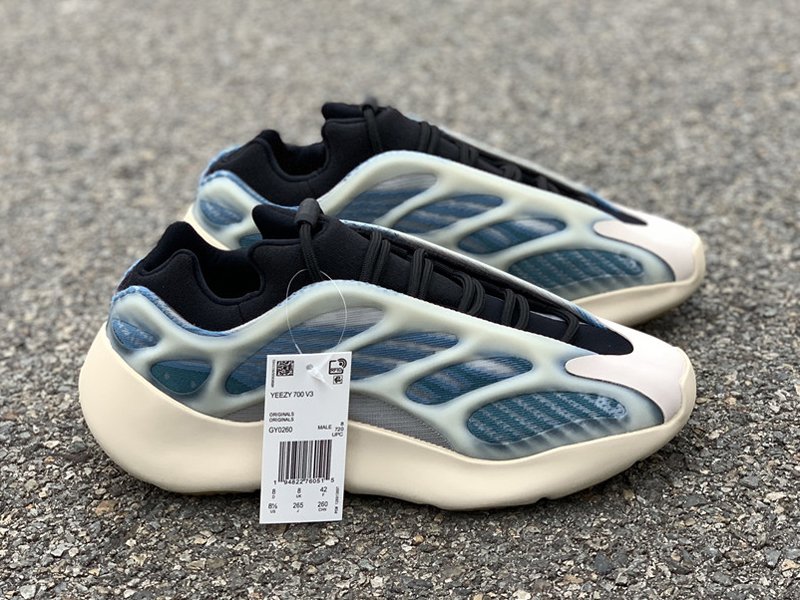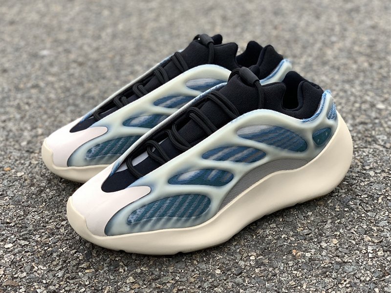 The YEEZY 700 V3 “Kyanite,” named after the sky blue-colored mineral, consists of an eggshell white translucent cage with a matching outsole. Under the cage is an Arzareth-like sky blue pattern interwoven through. The tongue and laces feature a contrasting jet black colorway to round off the design. The shoe is completed by a full EVA foam midsole for everyday comfort.