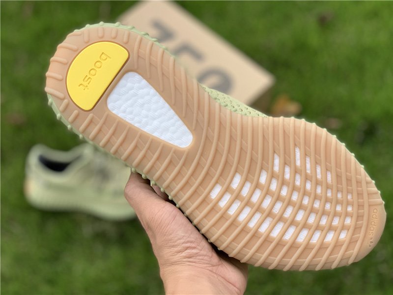 The adidas Yeezy Boost 350 V2 Sulfur utilizes a breathable Primeknit upper in a yellowish tan hue, accented with the sneaker’s signature monofilament side stripe in olive green. A pull tab at the heel complements the sock-like collar to deliver easy on and off. Underneath the foot, a full-length Boost unit provides responsive cushioning. The foam compound is visible through cut-out detailing on the gum rubber outsole.