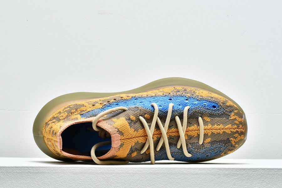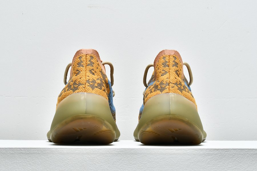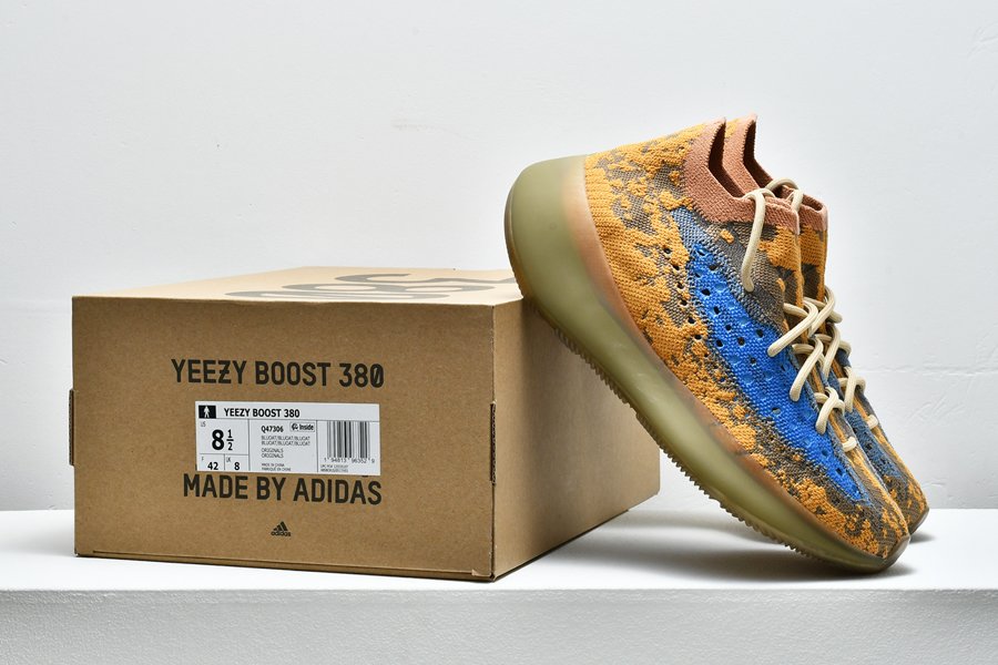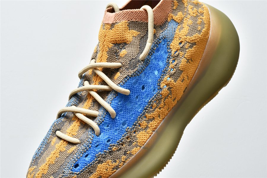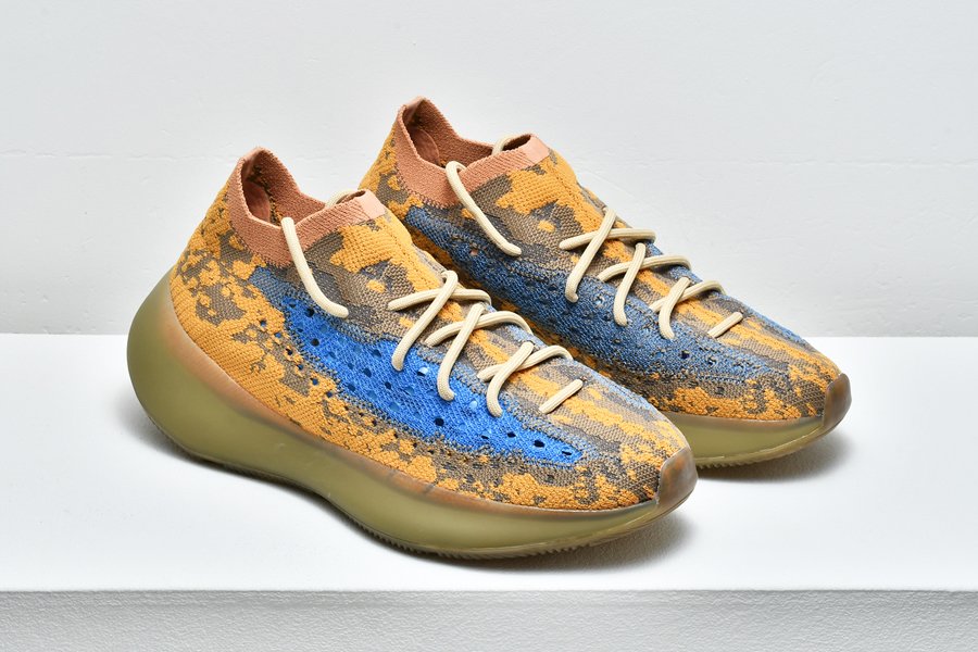The adidas Yeezy Boost 380 “Blue Oat Non-Reflective” utilizes a sock-like Primeknit upper in a complementary blend of beige and orange tones. The sneaker’s signature translucent monofilament window stands out in a contrasting blue finish, complete with perforated detailing for improved breathability. The one-piece build rides on a full-length Boost midsole, surrounded by a semi-translucent cage and reinforced by a gum rubber outsole.