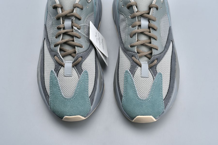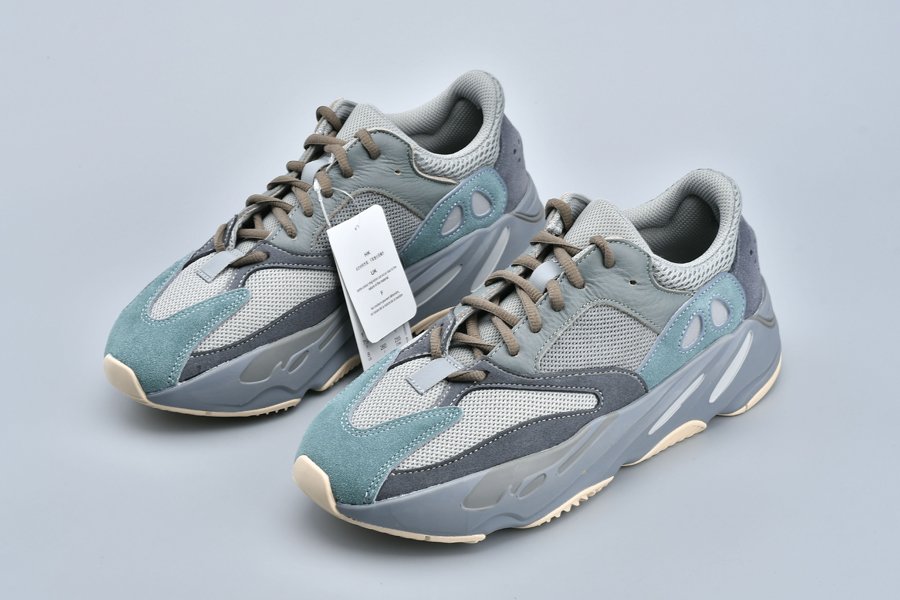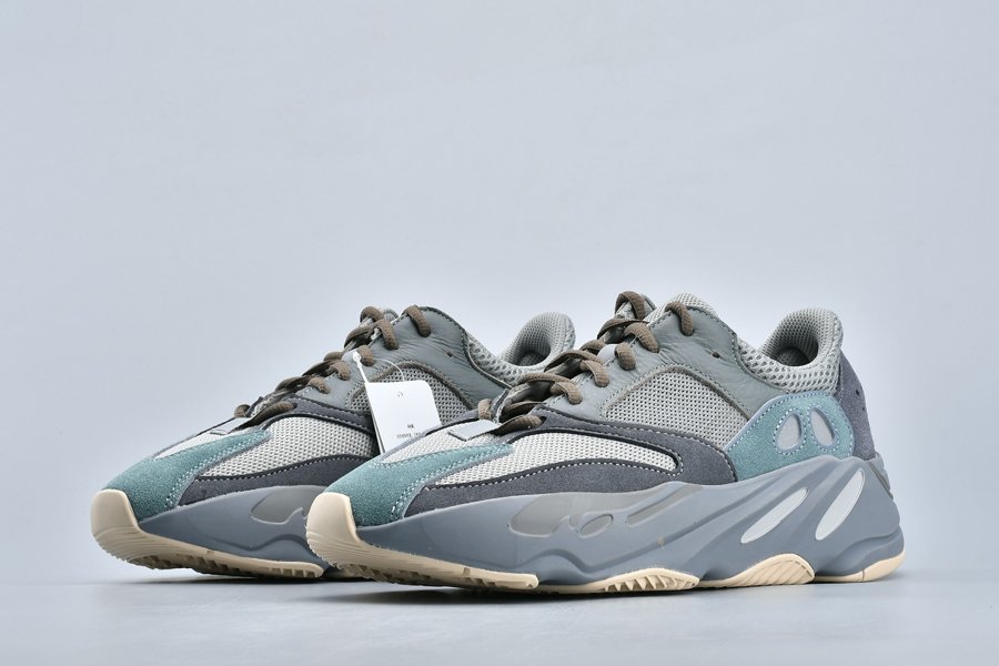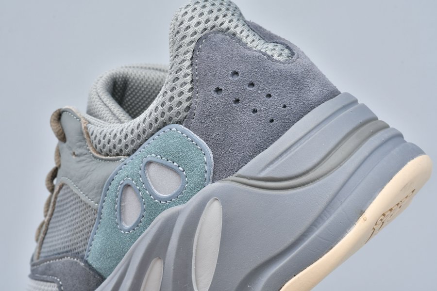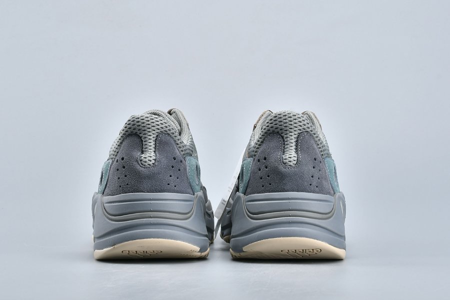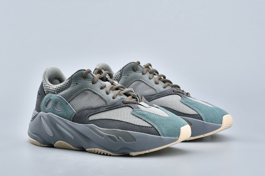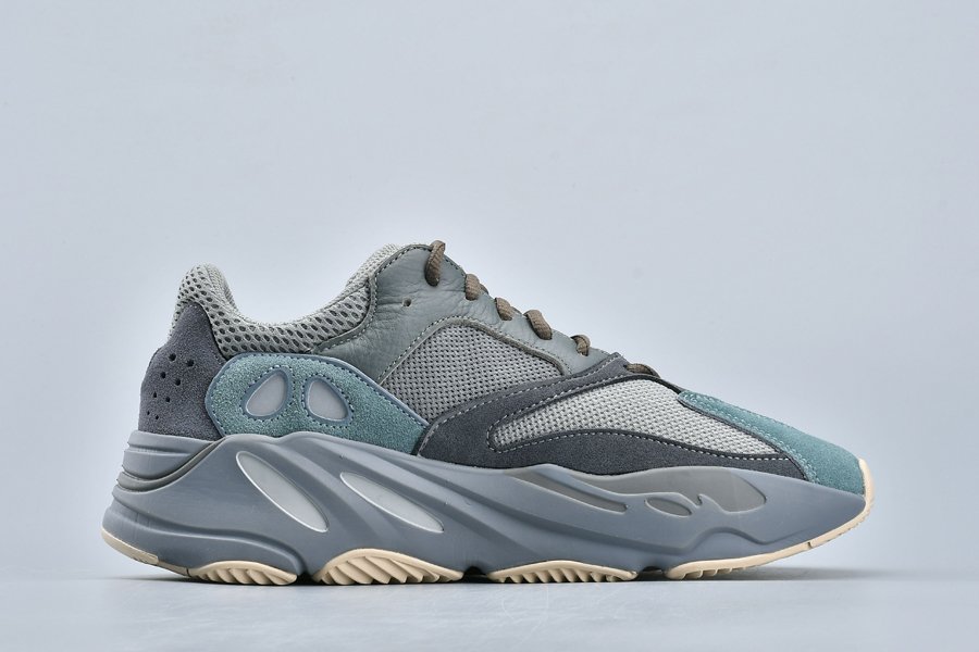 The adidas Yeezy Boost 700 “Teal Blue” boasts its signature mesh and suede construction bearing light, feather grey mesh with a darker shade of grey for the overlays across its forefoot and tongue area. The defining teal hue adorns its suede toe box and heel section, while more varying grey hues are scattered throughout the chunky midsole. Finally, a cream-colored rubber outsole tops off the design.