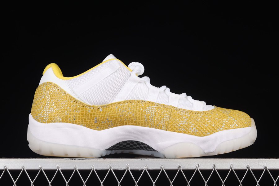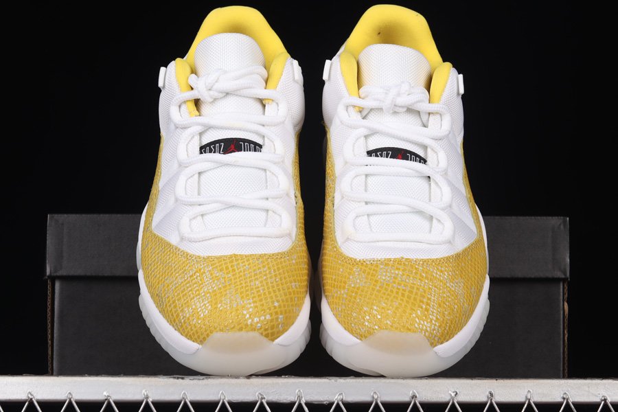 The sneakers feature the same color blocking as previous “Snakeskin” Air Jordan 11 Low models, with a white leather base and white nylon lace overlays. The rand that surrounds the shoe is adorned with a faux yellow snakeskin print. The sneaker’s liner is yellow, and the midfoot of the tongue bears the JUMPMAN JORDAN strip. Finally, a white midsole and icy translucent outsole complete the look of the sneaker.