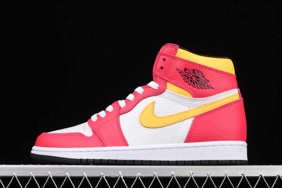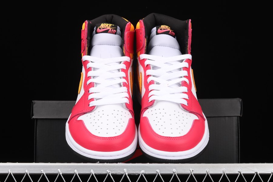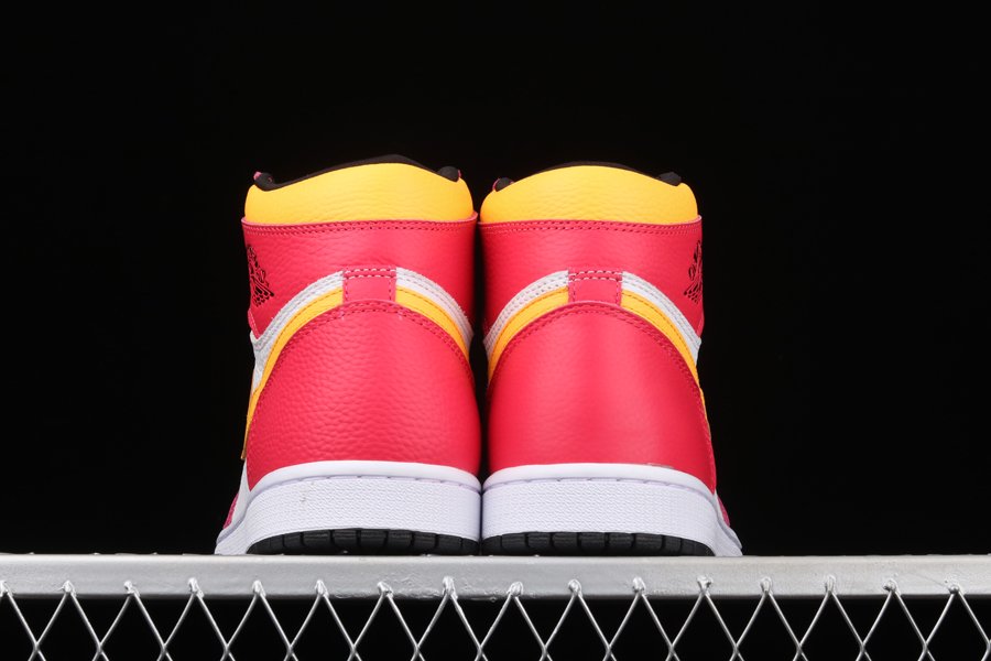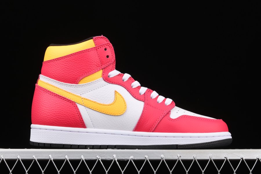 This Air Jordan 1 comes dressed in a Light Fusion Red, White, Laser Orange, and Black color combination. First, the pair comes highlighted with White leather on the base while Light Fusion Red adorns the overlays. Furthermore, it features leather. Next, Laser Orange lands on the ankle and Swoosh. Other details include White on the midsole and Black on the rubber outsole.
