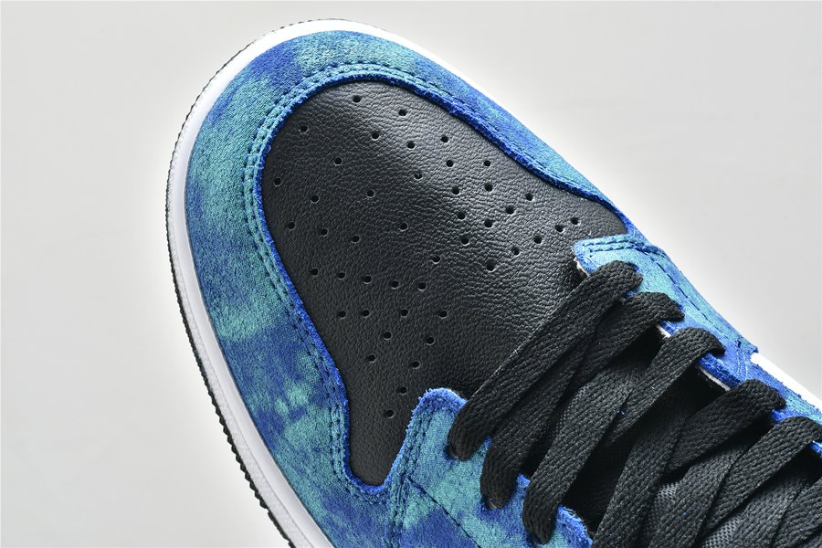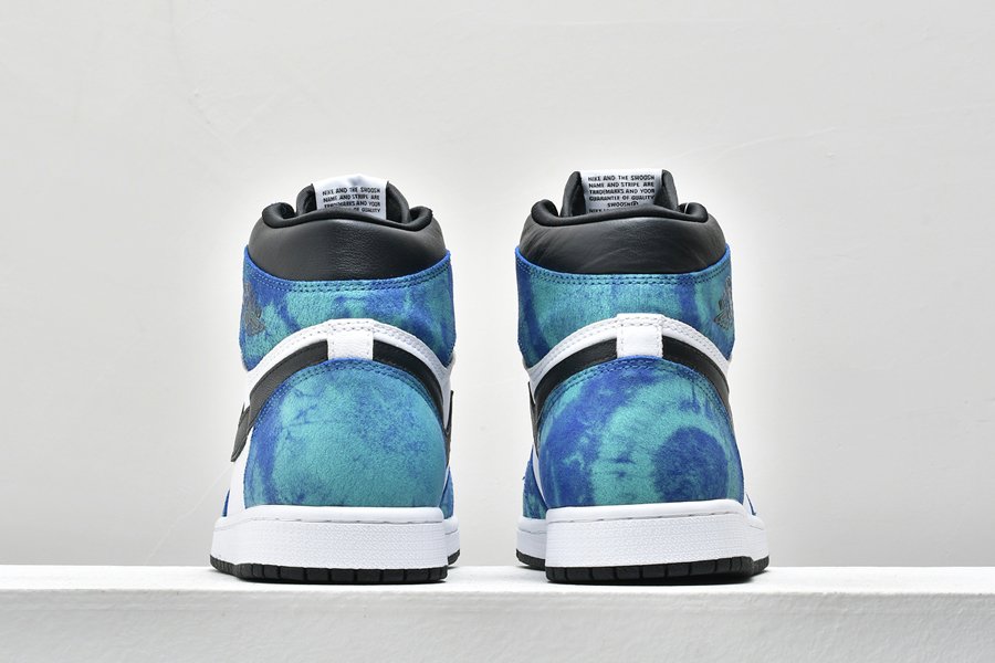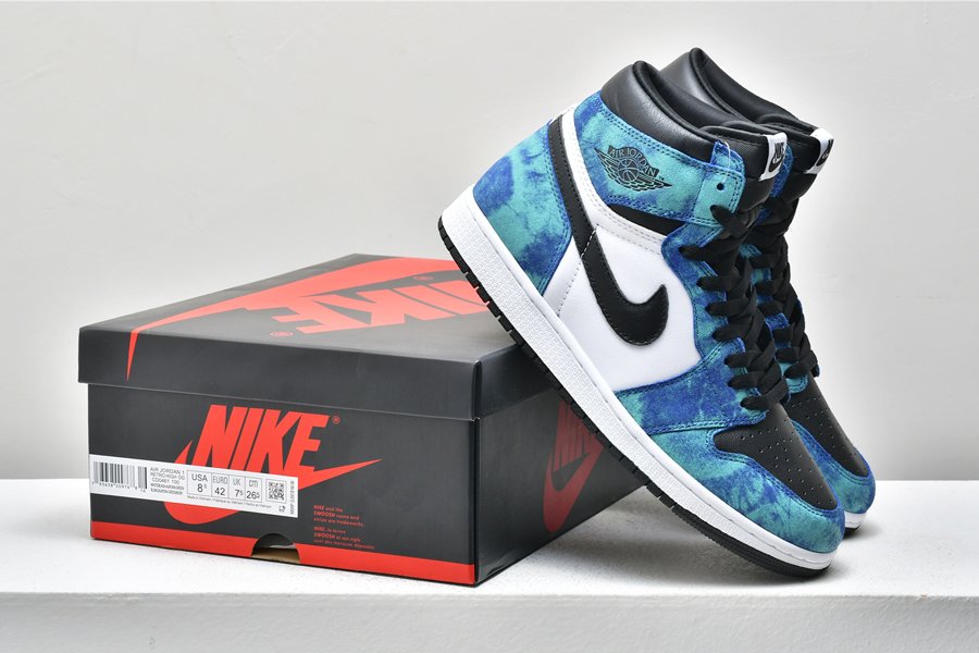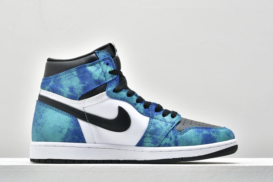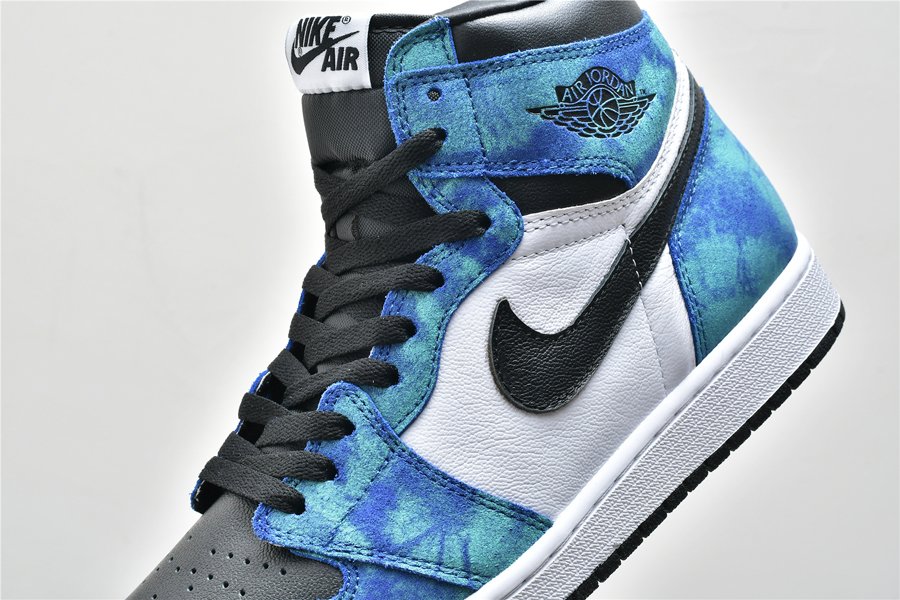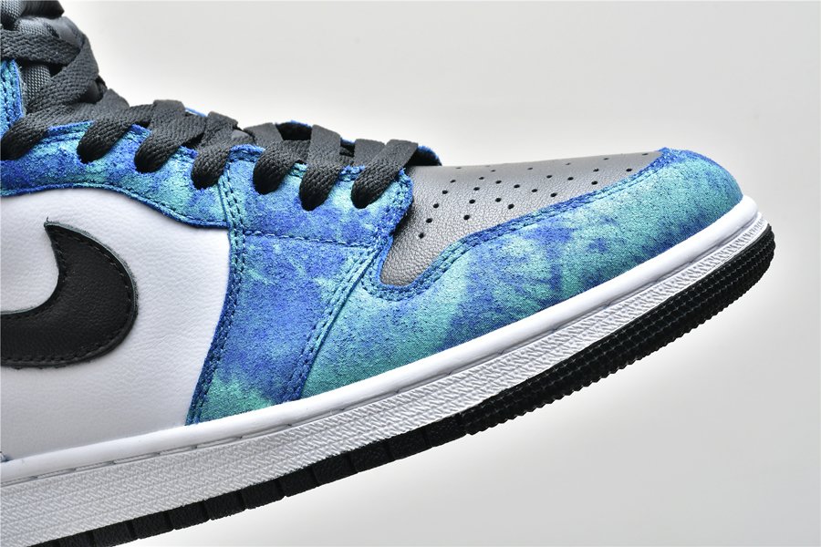 This new color option of the Air Jordan 1 takes on a bright and lively colorway that correlates perfectly with the Spring/Summer seasons. The shoe takes on a leather construction on the upper with white hitting the side panels and black on the toe and ankle/heel areas. The highlight of this Jordan 1 is the blue and green tie-dye print seen all throughout the overlays. More black gets placed on the laces, tongue, inner liner, Swooshes, and rubber outsole along with a white midsole to finish things off.