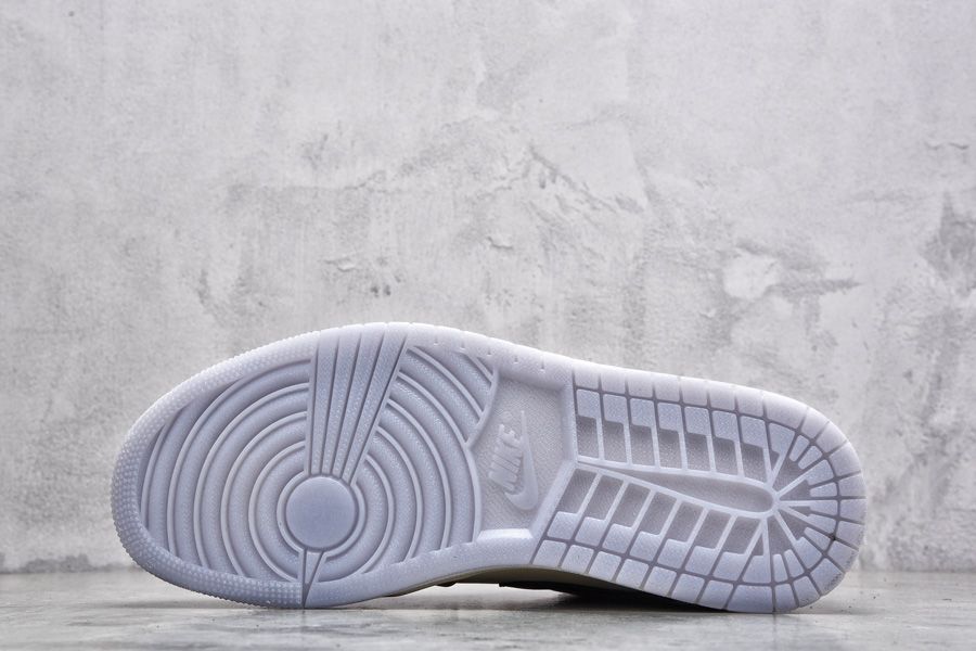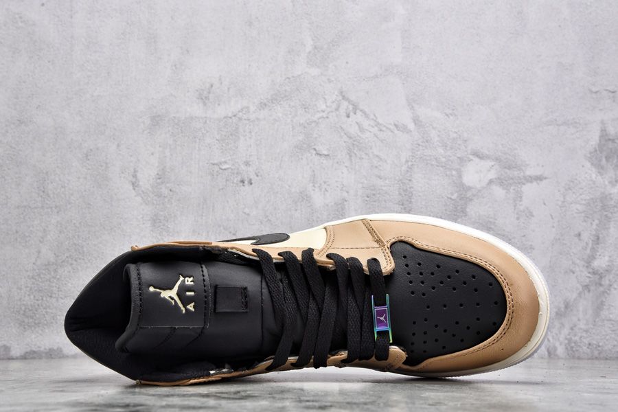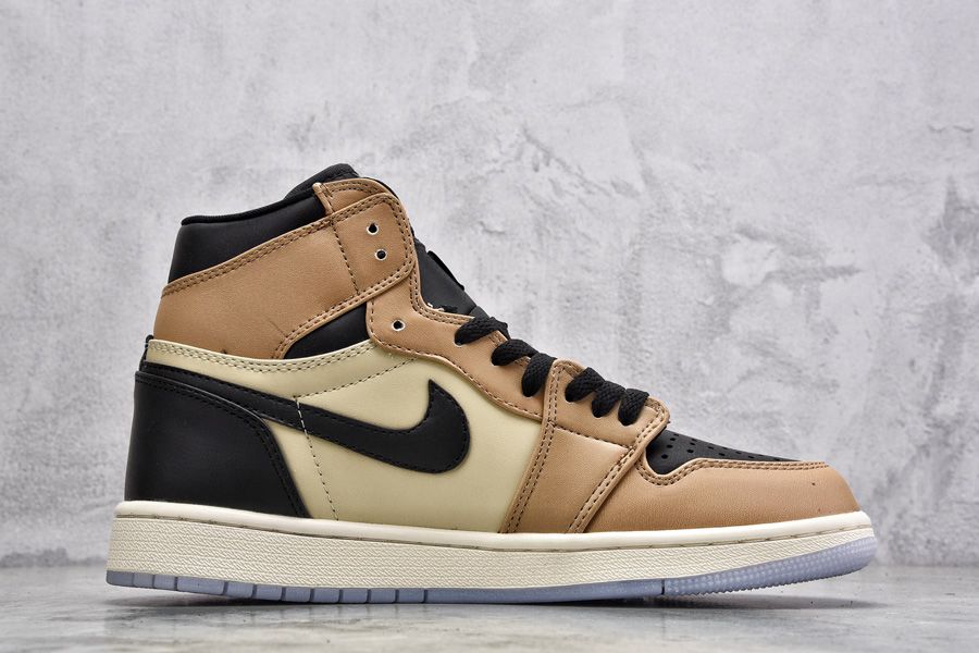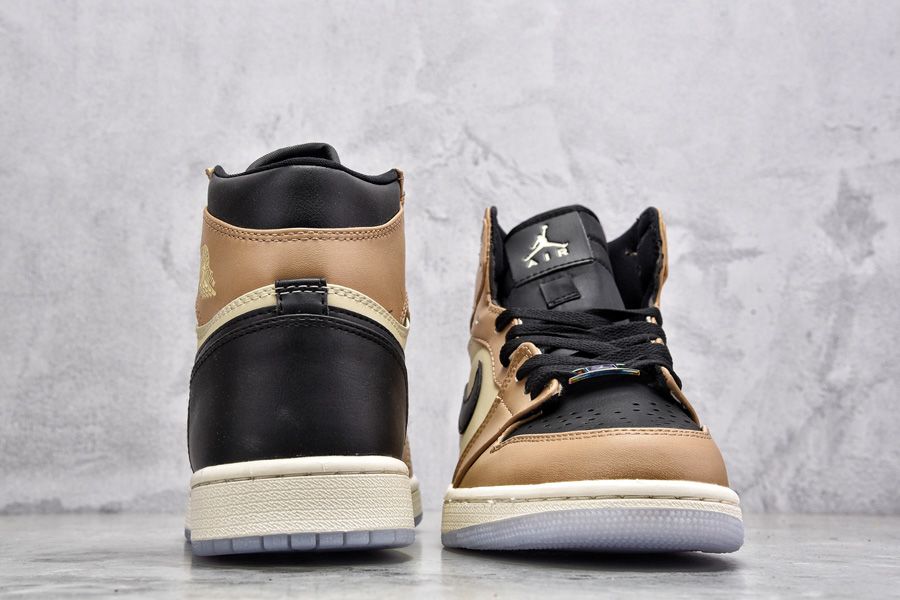 This Air Jordan 1 comes dressed in a Black, Fossil and Pale Ivory color combination. Highlighted with Khaki like shades across the upper while Black lands on the Swoosh, around the heel, ankle, tongue, laces and toe. Ivory then lands on the panels, White runs across the midsole and then we have a translucent outsole. Finishing the look is an iridescent lace jewel.