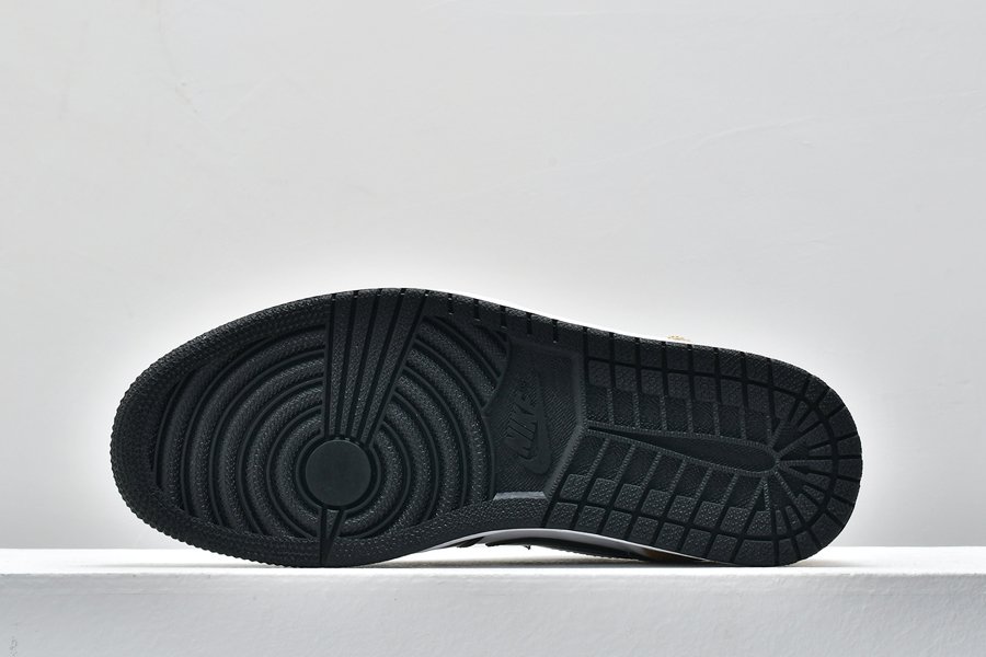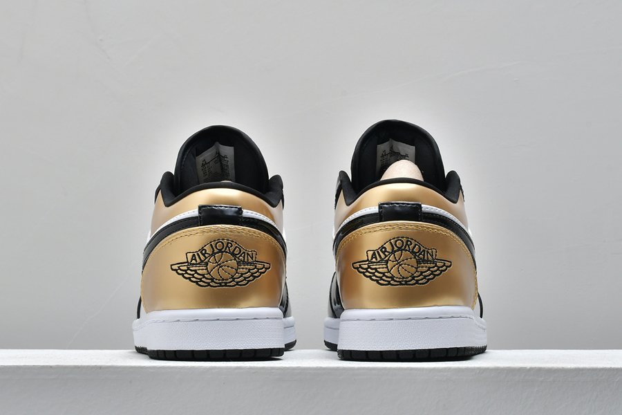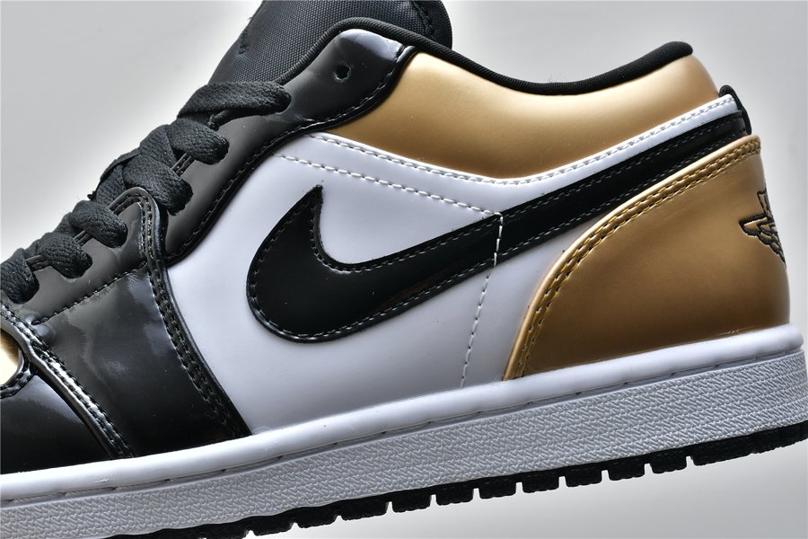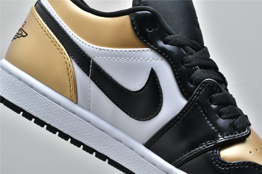 This low-top variation of the iconic silhouette flaunts white leather utilized for its side panels, followed by black patent leather overlays across and the defining gold hue found on the toe box, collar area and heel. Finishing design elements consist of the wings logo on each heel tab, black Jumpman branding stitched on the tongues, a white midsole and black rubber outsole.
