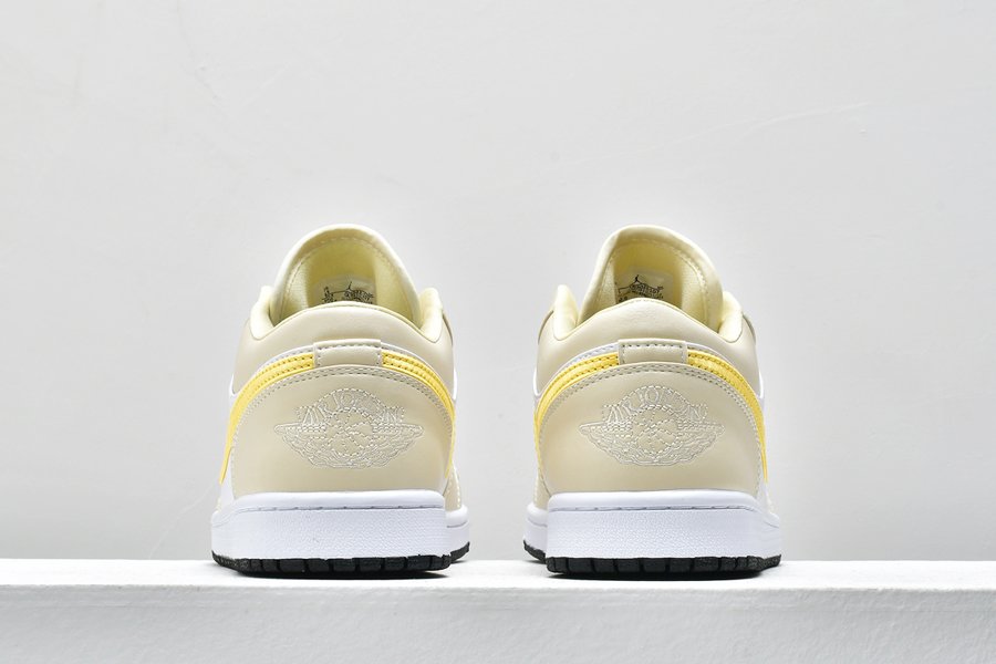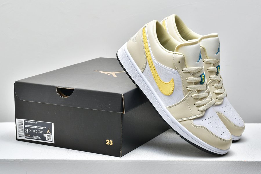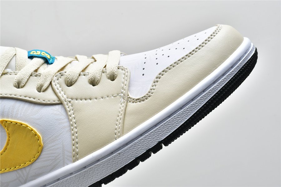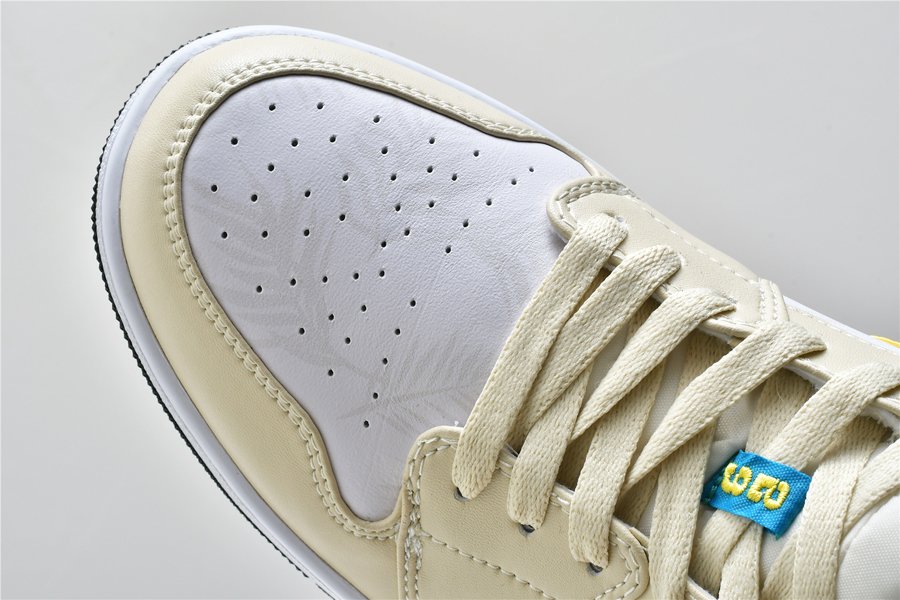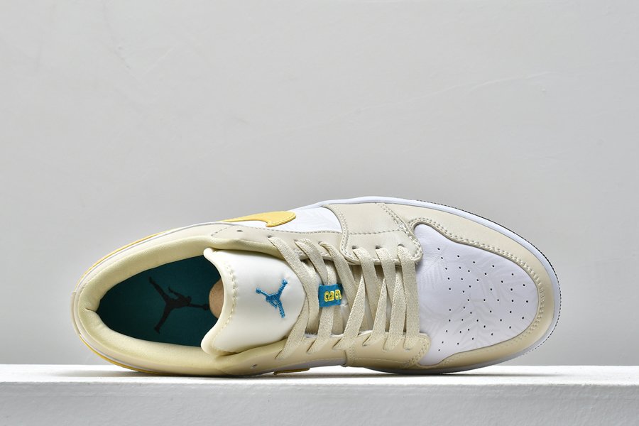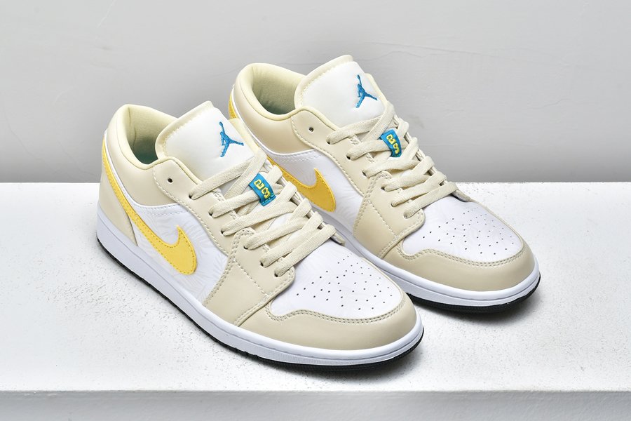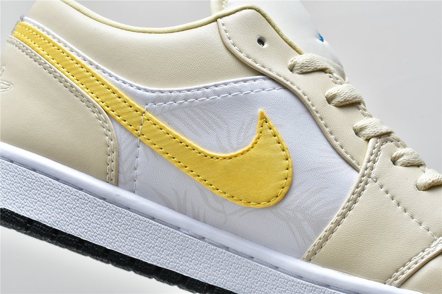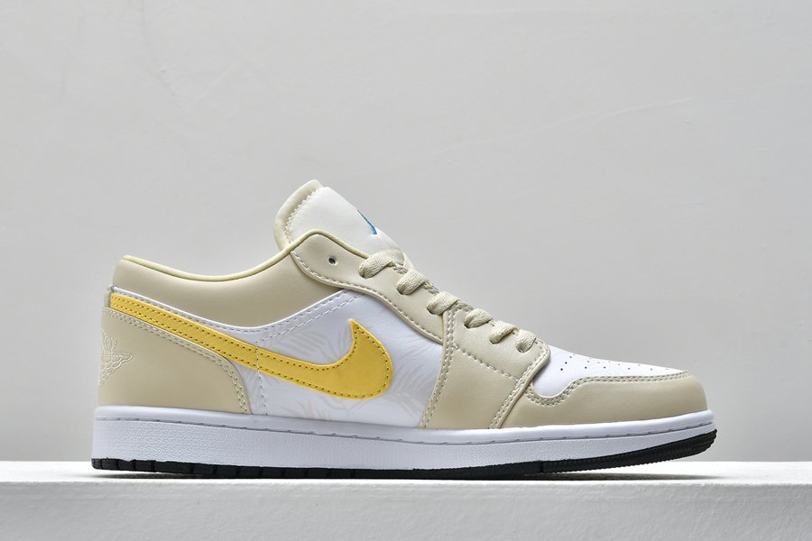 The Air Jordan 1 Low is this fresh new colorway done in a Light Orewood Brown, Amarillo, White, and Laser Blue color scheme. It starts off with a White base, but not just any White base. If you look closely you will see that the White underlays are covered with lines and palm tree silhouettes. Adding contrast to the shoe are the Light Brown hits on the leather overlays, liners and laces. The shoe also comes with neoprene tongues, silk Yellow Swooshes and Blue accents on the insoles and Jumpman on the tongue. A White midsole and Black rubber outsole round out the main features of the shoe.