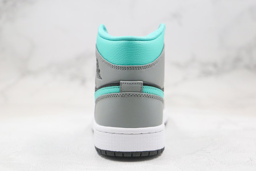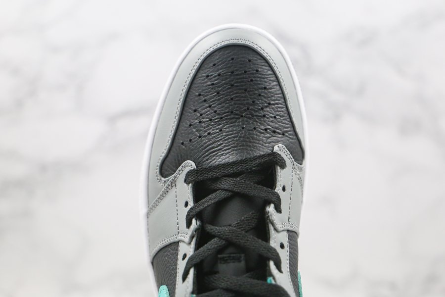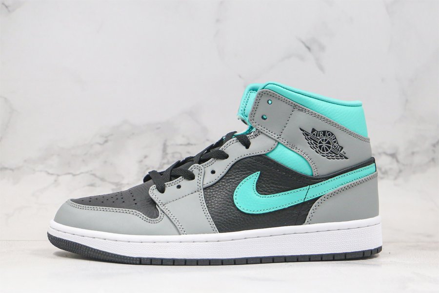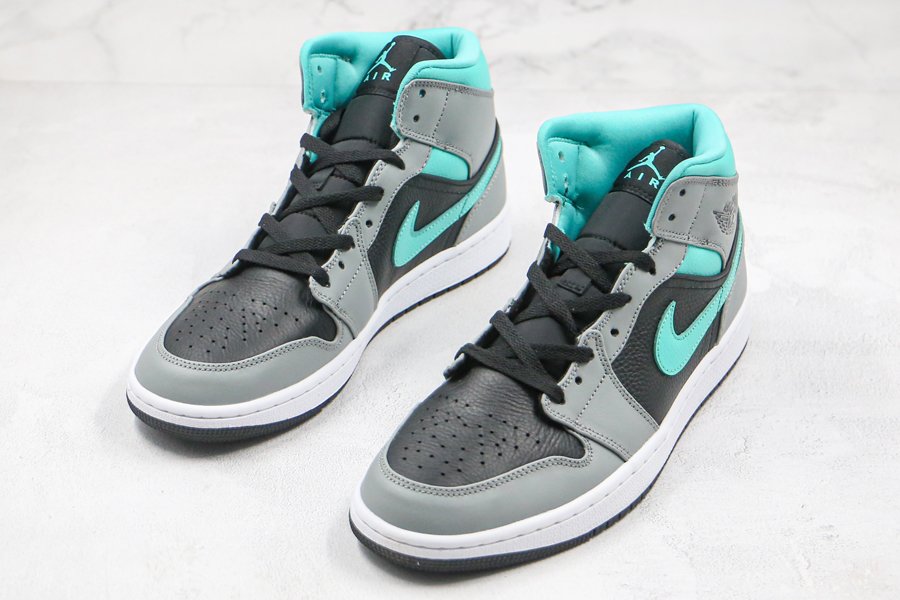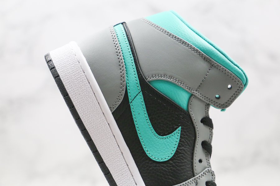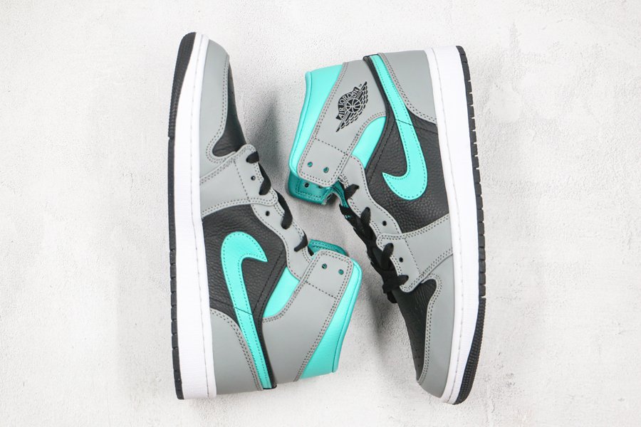 The Air Jordan 1 Mid Grey Aqua features a smooth leather upper with alternating black inserts in the toebox and quarter panel, turquoise blue on the Swoosh and ankle collar and grey on the rest of the pair. A blue branding on the tongue creates a reminder while laces and a toned-in black Wings logo refine the whole in all sobriety.