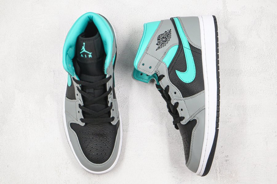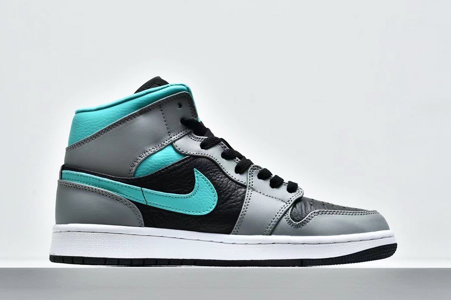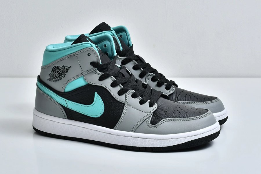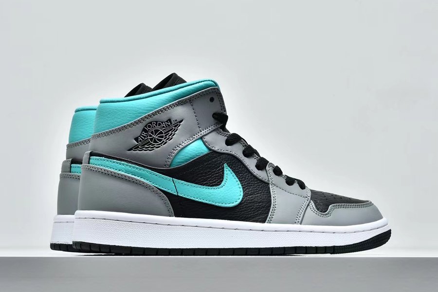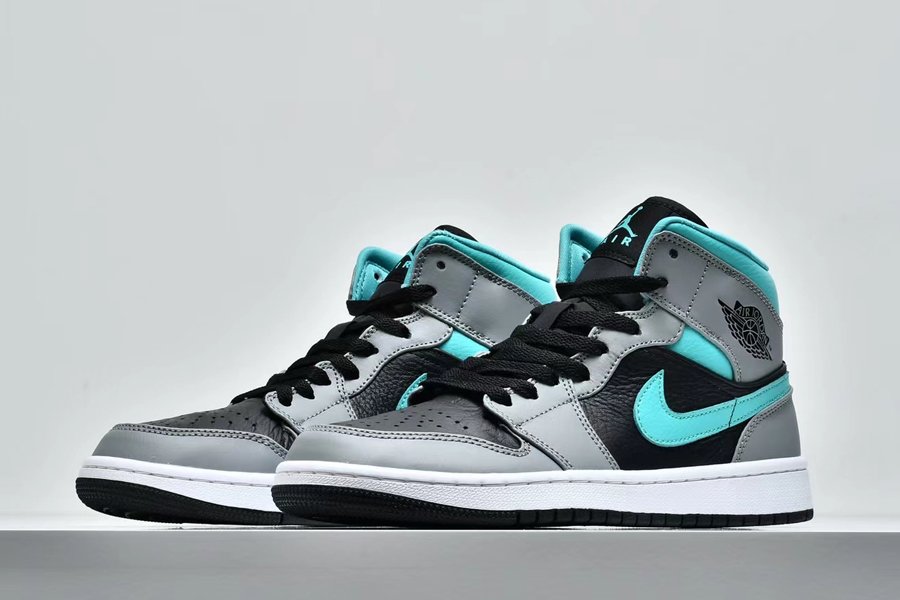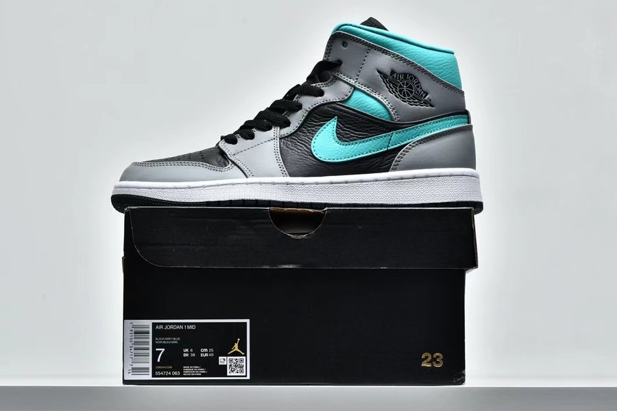 The Air Jordan 1 Mid Grey Aqua features a smooth leather upper with alternating black inserts in the toebox and quarter panel, turquoise blue on the Swoosh and ankle collar and grey on the rest of the pair. A blue branding on the tongue creates a reminder while laces and a toned-in black Wings logo refine the whole in all sobriety.