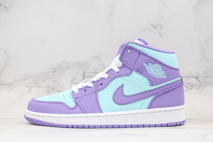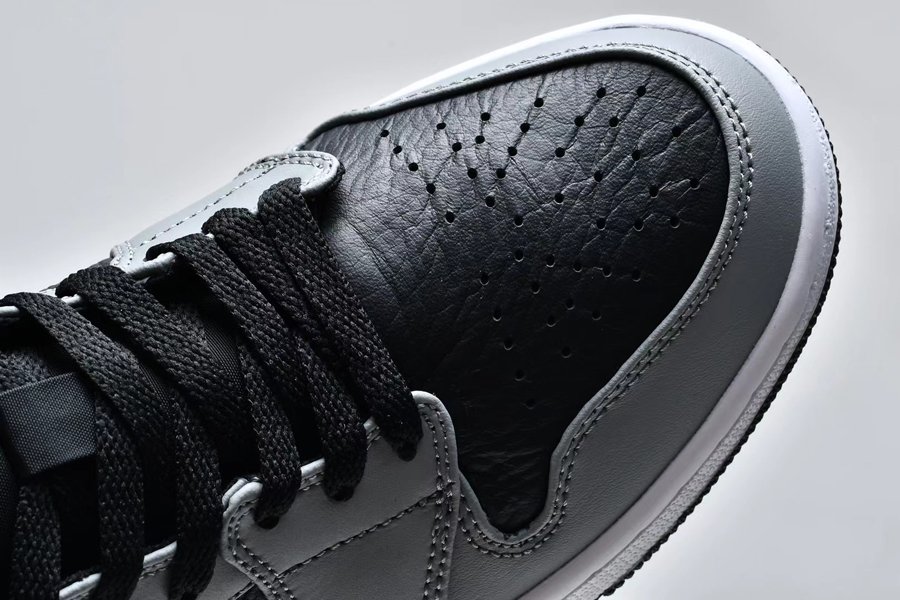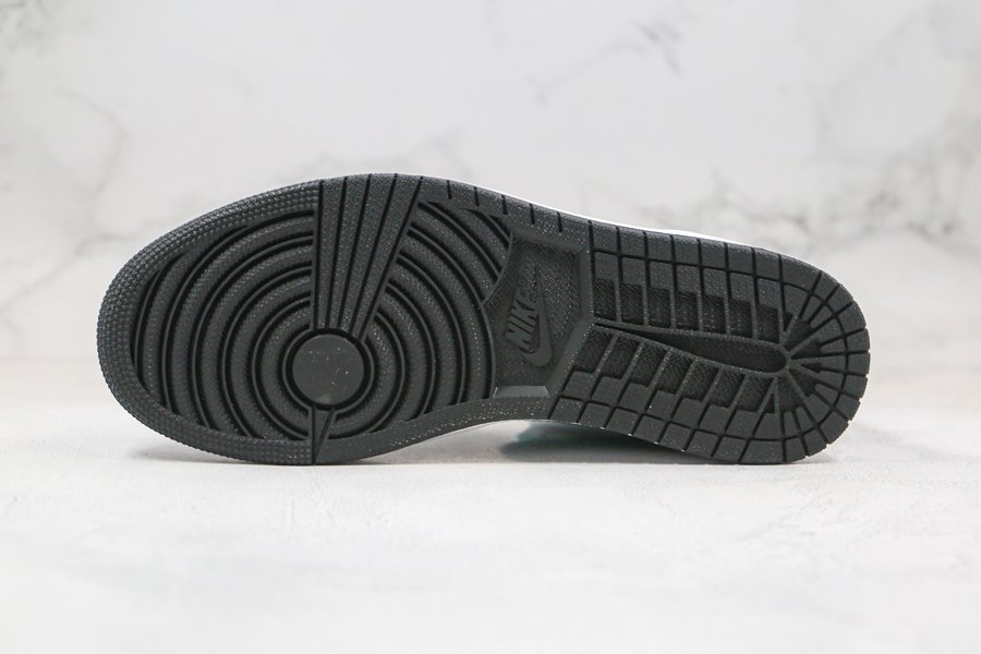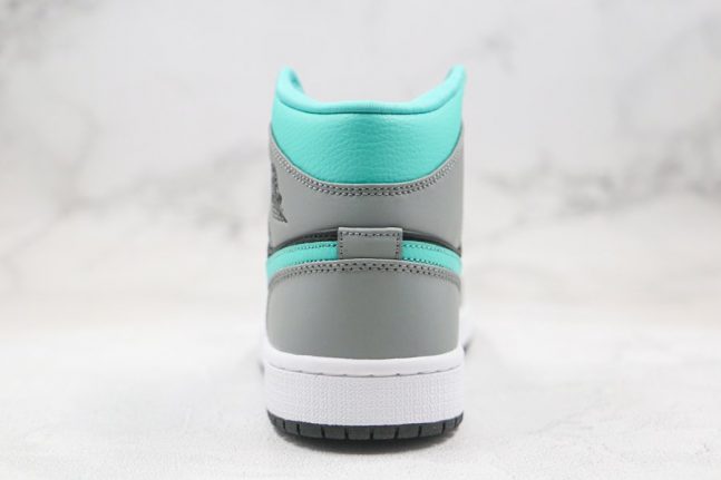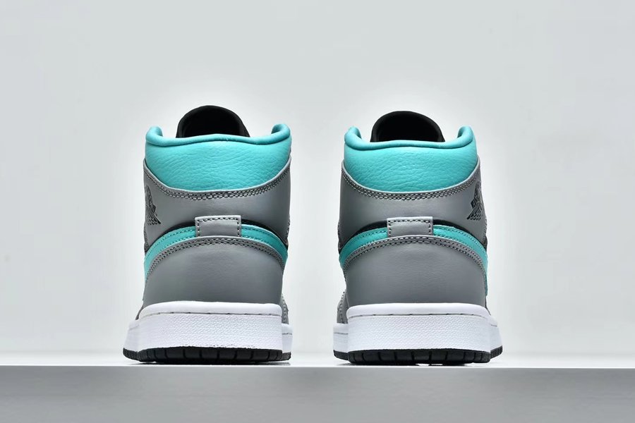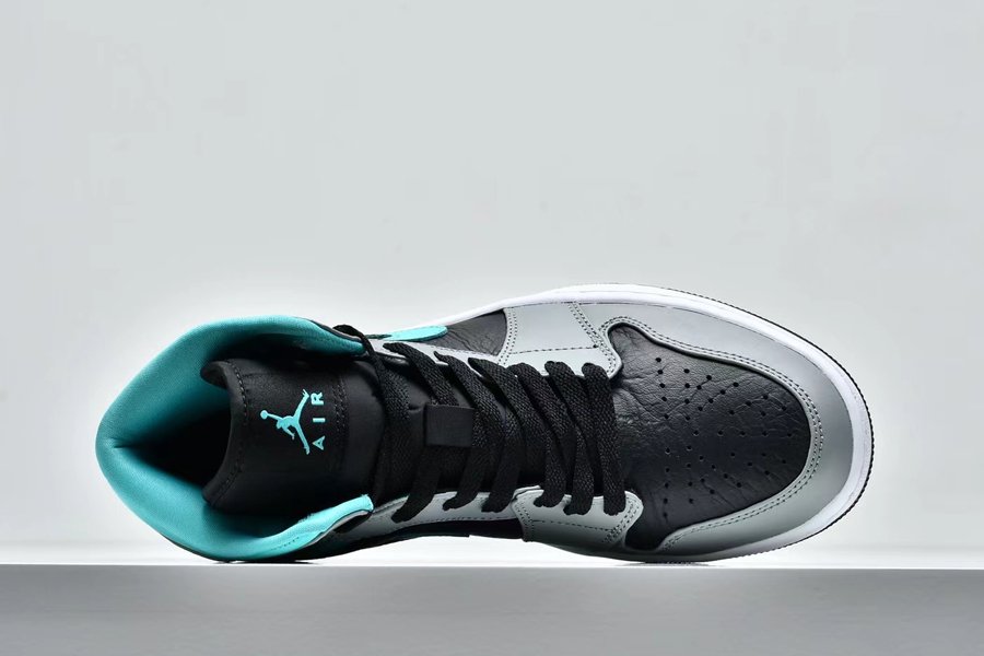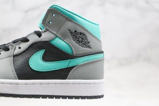The Air Jordan 1 Mid Grey Aqua features a smooth leather upper with alternating black inserts in the toebox and quarter panel, turquoise blue on the Swoosh and ankle collar and grey on the rest of the pair. A blue branding on the tongue creates a reminder while laces and a toned-in black Wings logo refine the whole in all sobriety.
