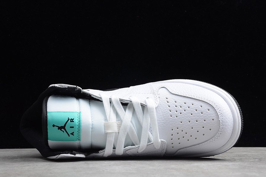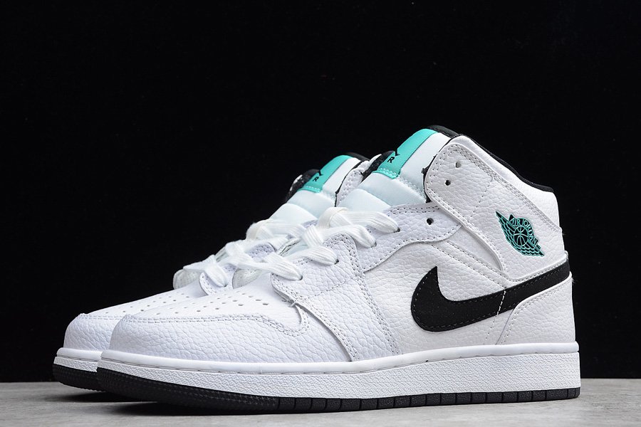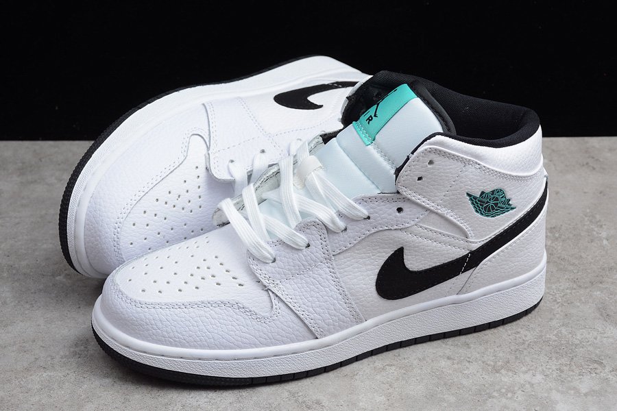 This latest Air Jordan 1 Mid in grade school sizes takes on a clean aesthetic as the shoe comes covered in white leather on the majority of the upper with black accents on the Swoosh logo, inner liner, and the Jumpman logos on the heel and tongue. A pop of color is seen on the Wings logo on the ankle as well as on the tongue patch courtesy of Hyper Jade. A white midsole and black rubber outsole complete the look on this pair of Jordan 1s.