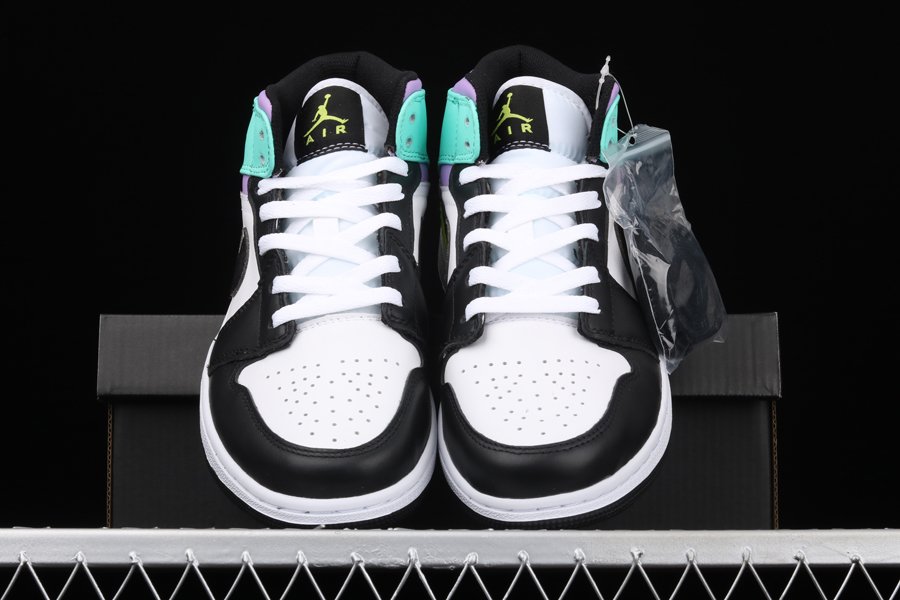 The mid-top Air Jordan 1 features White leather on the perforated toe box and side panels with matching laces, tongues, and midsole. Additional details includes Black overlays on the toe, forefoot, eyelets, and Swooshes. Highlighting the shoe are pastel tones in the rear as Black continues on the Wings logo and rubber outsole.