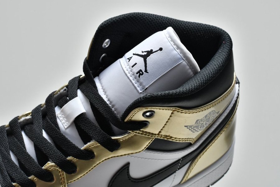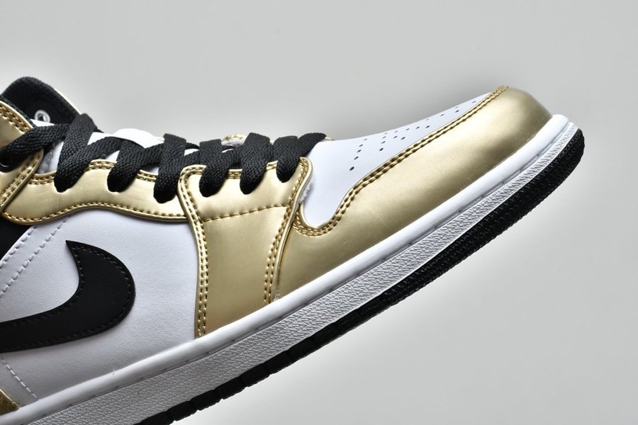 Eponymic “Metallic Gold” accents grace the mudguard, eyestays, heel and collar flaps, placed above a white leather quarter panel and toebox for maximum visibility. Further contrast is served up by the black collar and black Swooshes. Apart from these Swooshes, branded hits arrive via a Jumpman tag on the white nylon tongue and an OG ball and wings logo stamped on the lateral collar flap. Black laces bring the upper half together, and the timeless combo of a white midsole and black outsole rounds off the look.