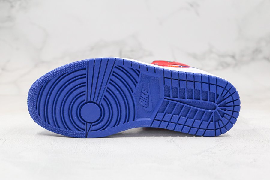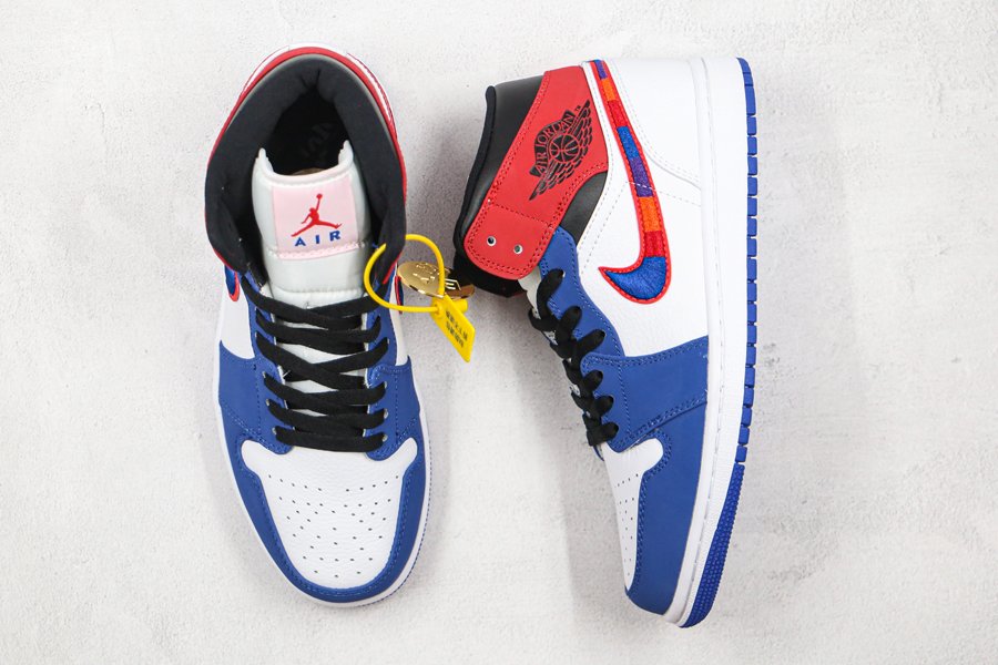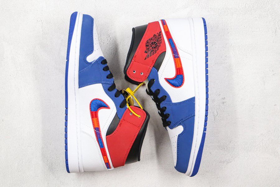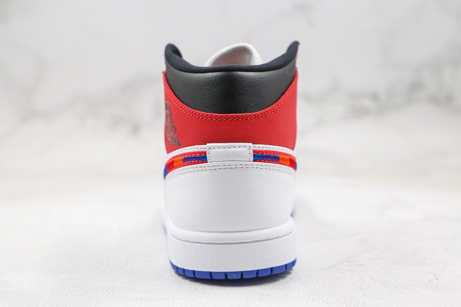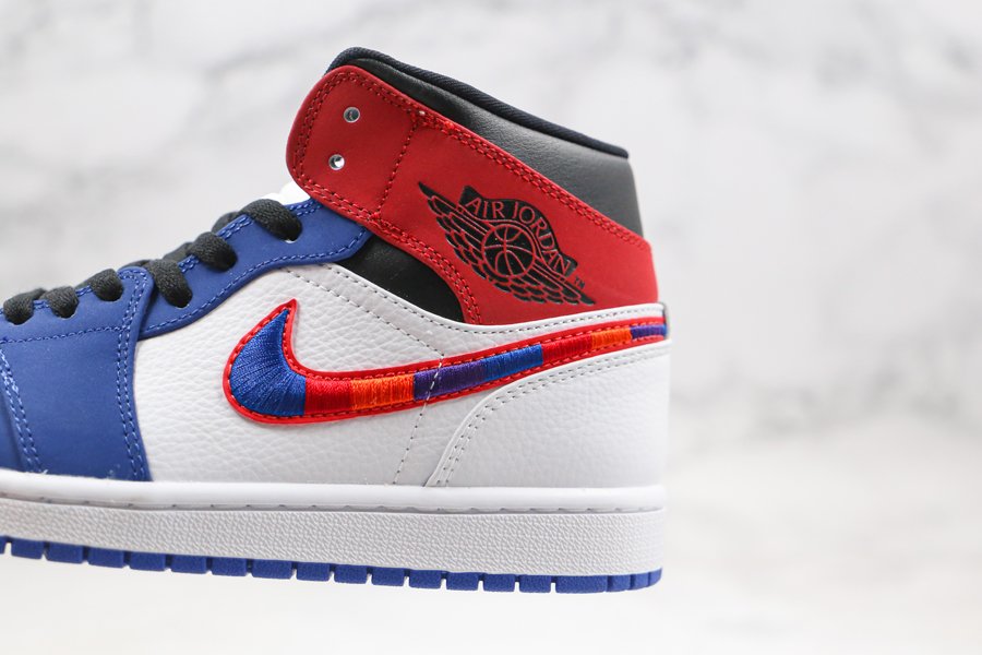 The Air Jordan 1 Mid brings a new design to sneaker fans with a multicolored Swoosh. The highlight of the sneaker entails a vibrant side Swoosh done up in a striped pattern of orange, blue, and red. The panels that construct the bold sneaker are just as colorful. Most of the upper and the midsole is white, while royal blue overlays and a red and black collar make up the rest of the Air Jordan 1 Mid’s color scheme.