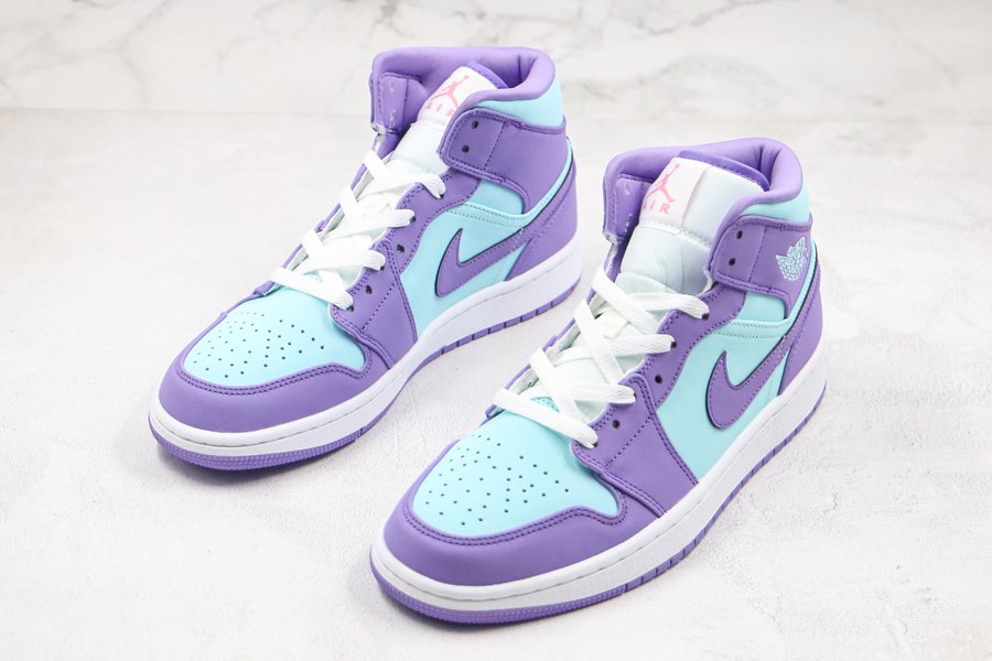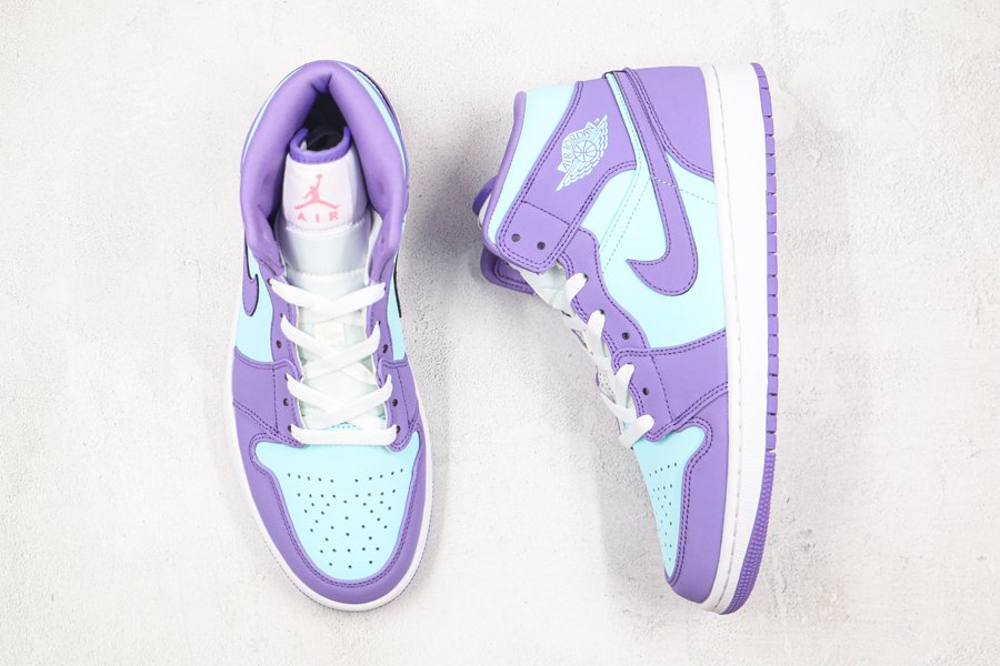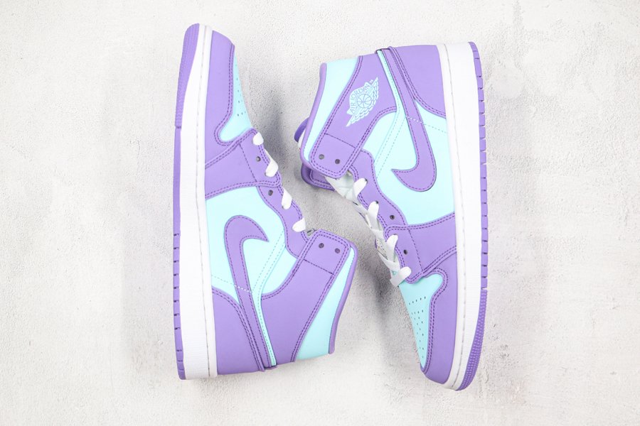 Covered in a full leather construction on the upper, this Air Jordan 1 Mid gets hit with a pastel blue on the side panels, toe, and ankle along with pastel purple on the overlays. Jumpman branding on the tongue, the Wings logo on the lateral ankle, a white rubber midsole and purple outsole wrap up the look on this Air Jordan 1 Mid.