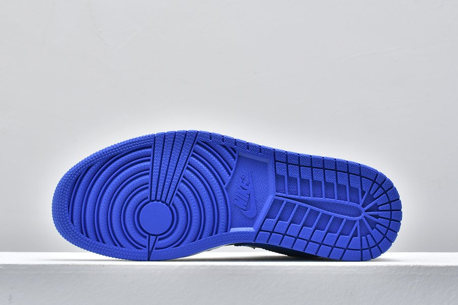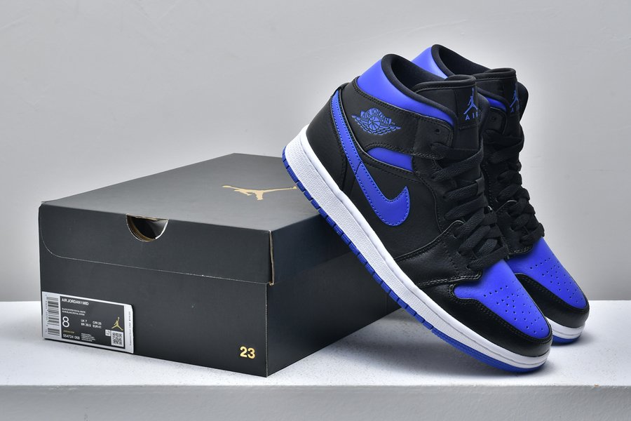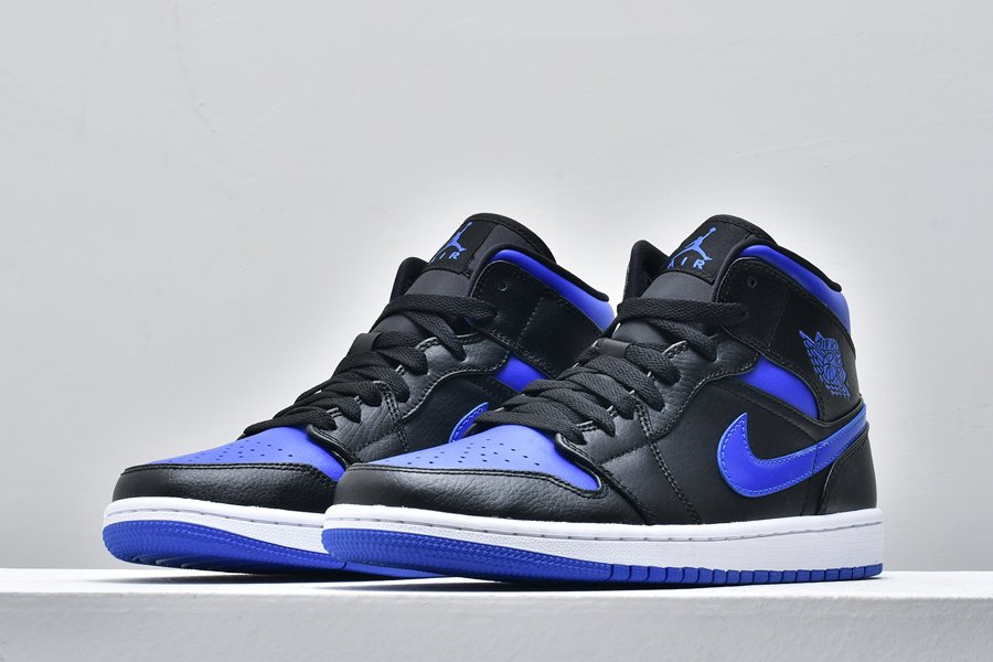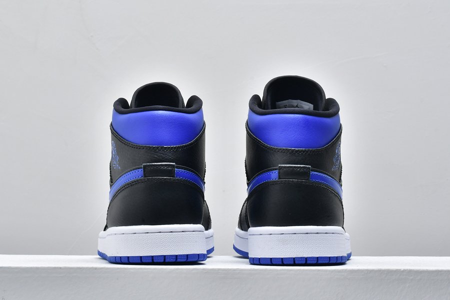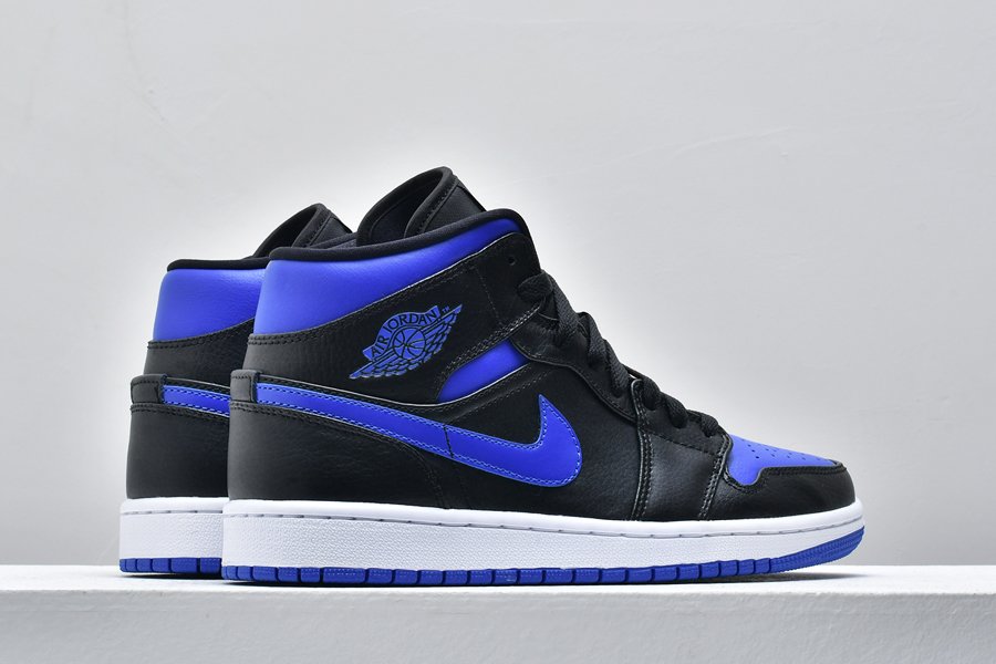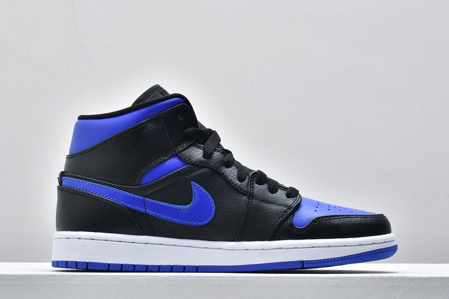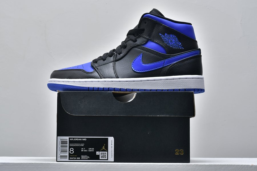 The Air Jordan 1 Mid ‘Black Hyper Royal’ makes use of a familiar color scheme that recalls the OG colorway of the AJ1 High. The upper is constructed from black leather with contrasting Hyper Royal on the collar and perforated toe box. The sneaker’s branding elements are similarly finished in royal blue, including a synthetic leather Swoosh, printed Wings logo on the collar flap and Jumpman trademark on the woven tongue tag.