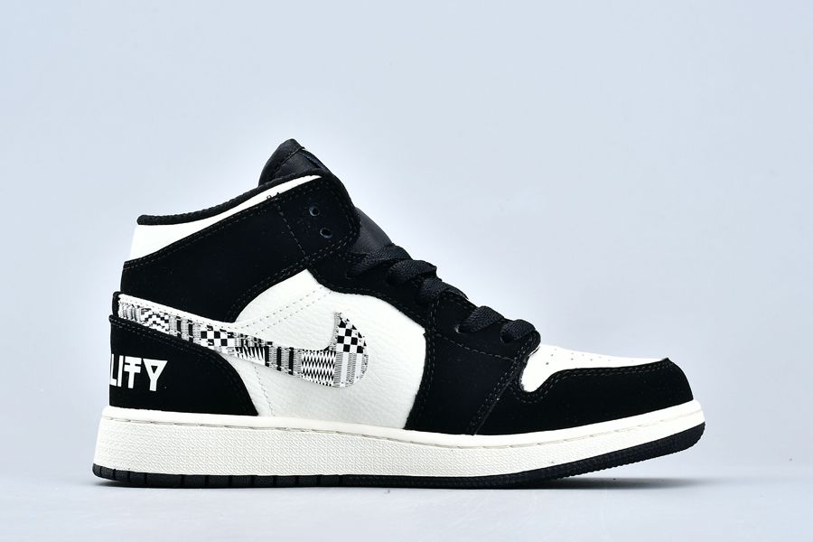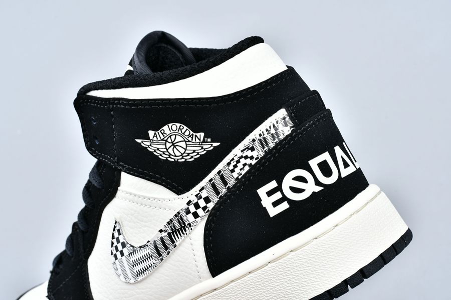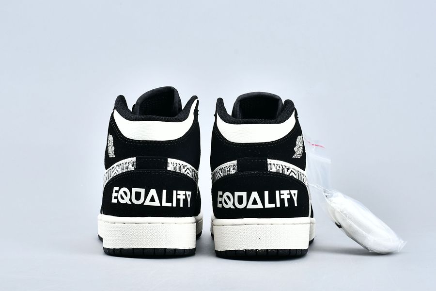 This year’s “Equality” Air Jordan 1 Mid comes dressed in the signature Black and White color scheme highlighted with a large “Equality” on the heel. Other interesting detailing includes special patterns on the Swoosh and Melo’s signature Jordan logo on the tongue and insole.