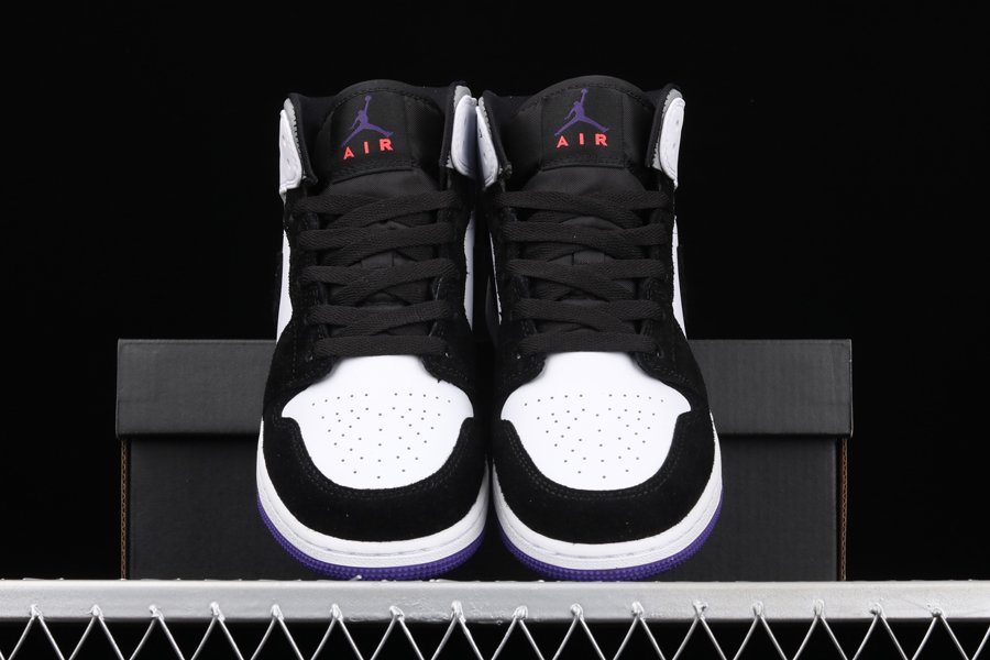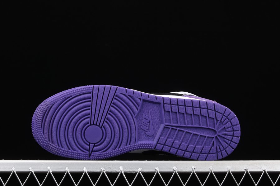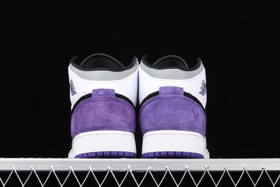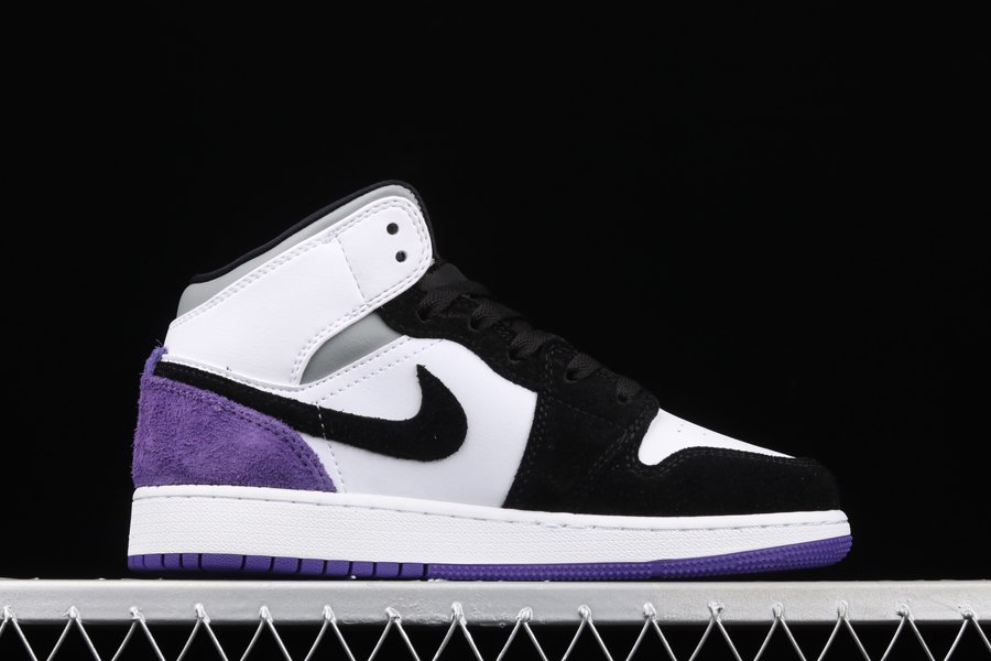 The Air Jordan 1 Mid GS “Court Purple Suede” is the youth sizing of Michael Jordan’s first signature shoe in a look reminiscent of the Sacramento Kings’ team colors. Despite having no association with the NBA franchise, the “Court Purple Suede” nonetheless features the team’s same white, black, and purple color palette in its design. A mixture of materials and textures highlight this release, including the smooth white leather perforated toe, mid-panel, and collar. Hairy black suede overlays can be found on the forefoot, eyelets, and Swoosh detailing on either side. The same fuzzy suede material appears in Court Purple on the back of the shoe. Additional purple accenting is located on the “Wings” branding on the collar and on the Jumpman on the black nylon tongue tag.