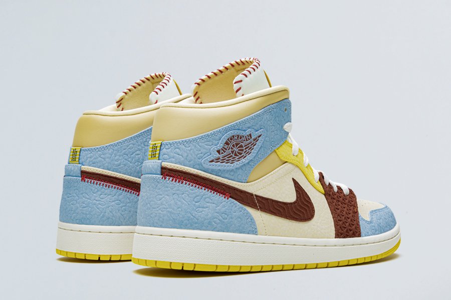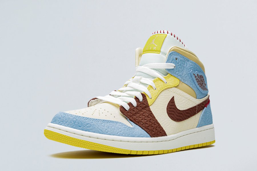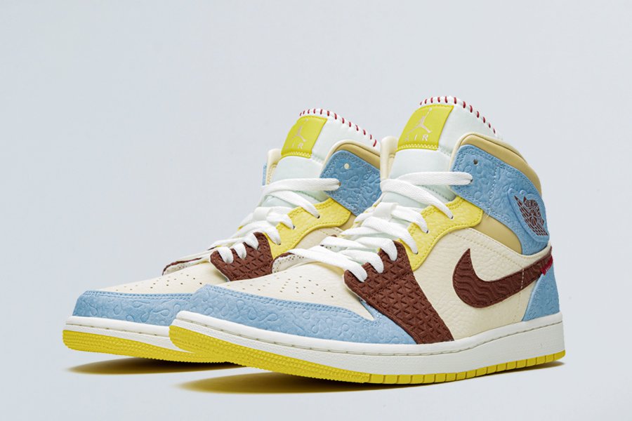 The Maison Chateau Rouge x Air Jordan 1 Mid “Fearless” is the Paris-based brand’s vision of the mid-top version of Michael Jordan’s first signature shoe. Maison Chateau Rouge is known for their African-inspired apparel for men and women and the collective applies its trademark designs liberally to the upper of the silhouette, via textured leather paneling. A tan leather base can be found on the mid-panel, perforated toe, and ankle collar, while dark brown textured leather covers the forefoot panel and Swoosh. Light blue debossed leather covers the toe, ankle collar and heel. Red exposed stitching outlining the tongue and at the heel enhances the hand-constructed theme of the shoe.