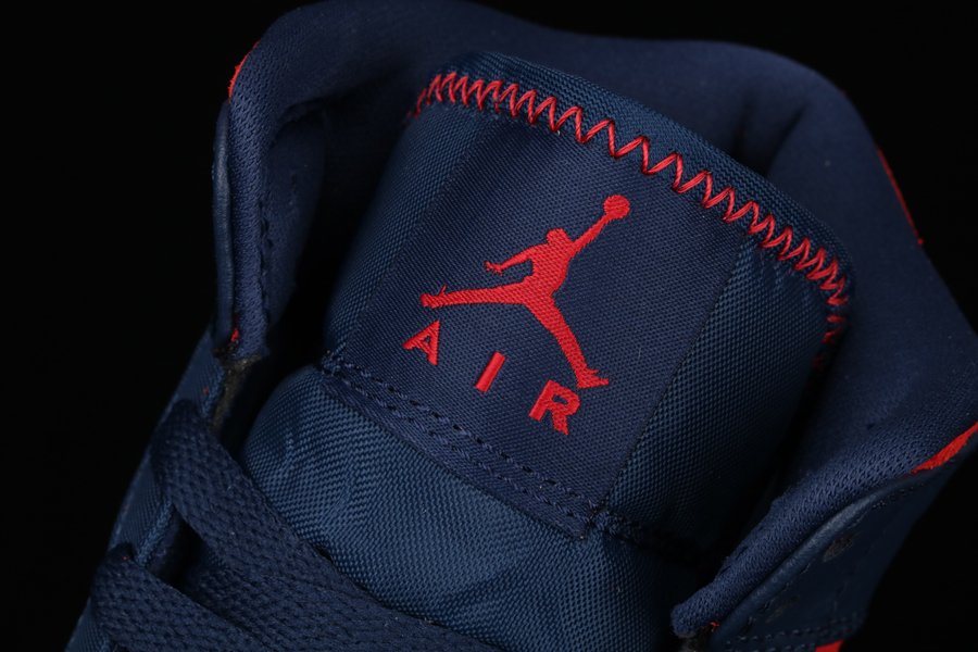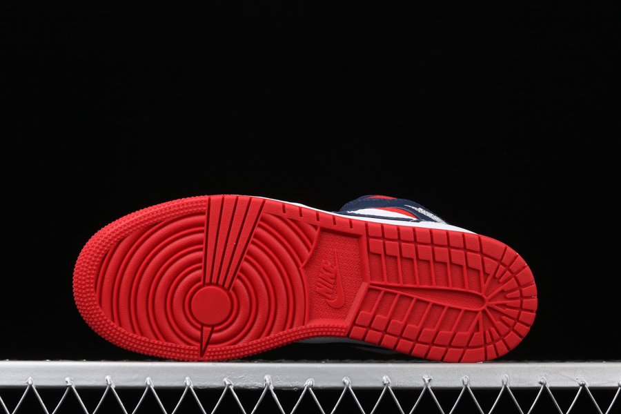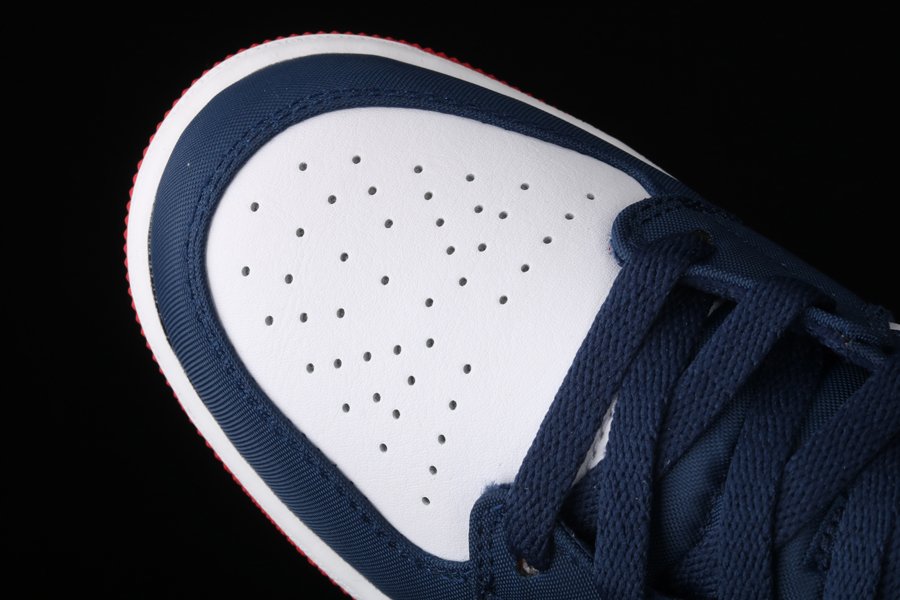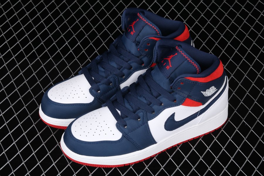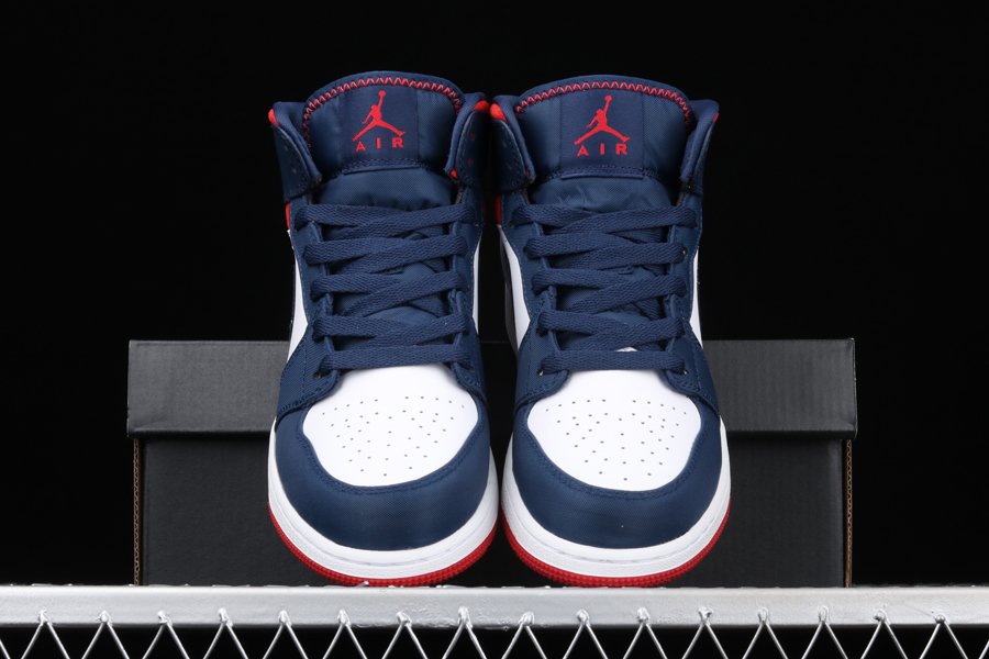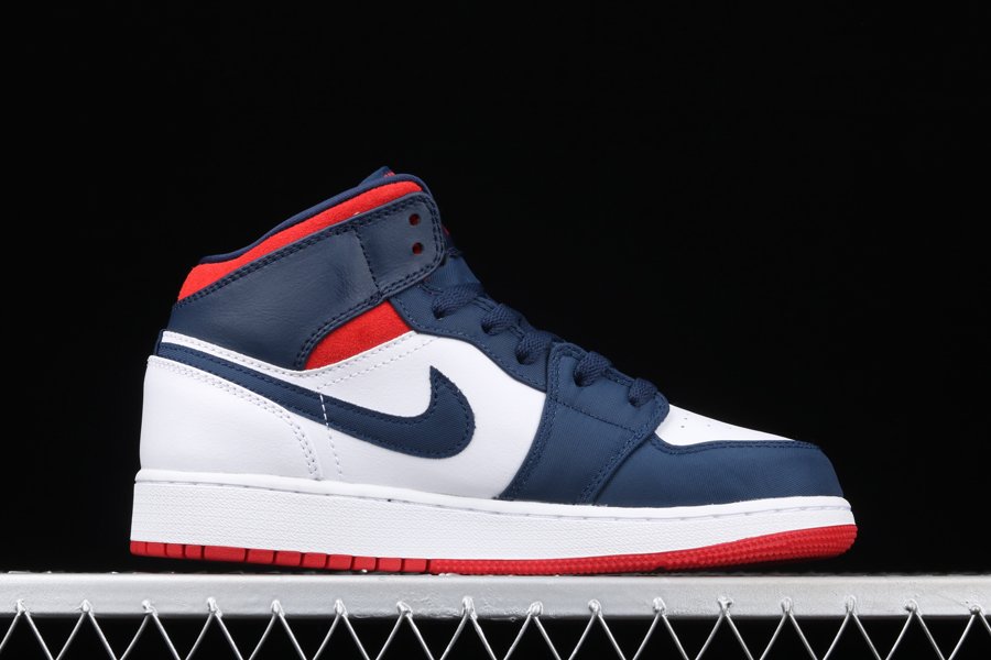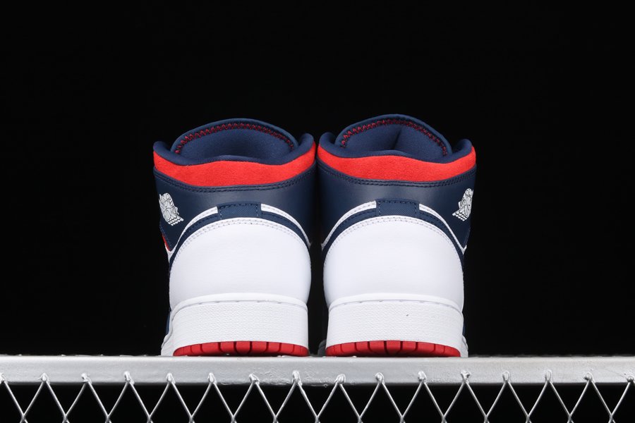 Dressed in USA-themed colors. This Air Jordan 1 Mid features a White leather upper with Navy overlays, Gold Swooshes and Wings logo paired with Red accents on the ankle collar, tongue, and rubber outsole.