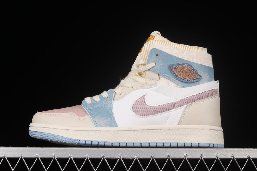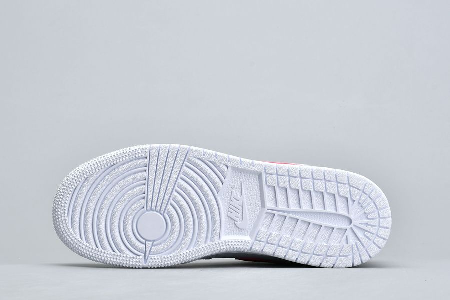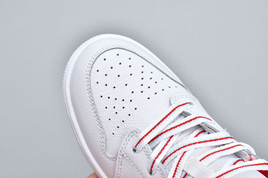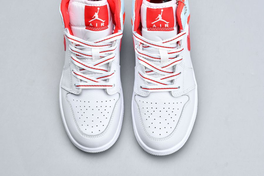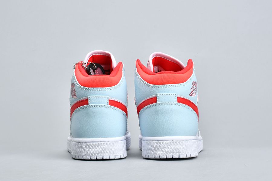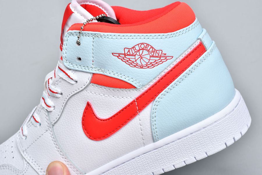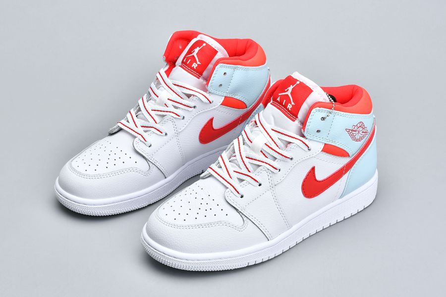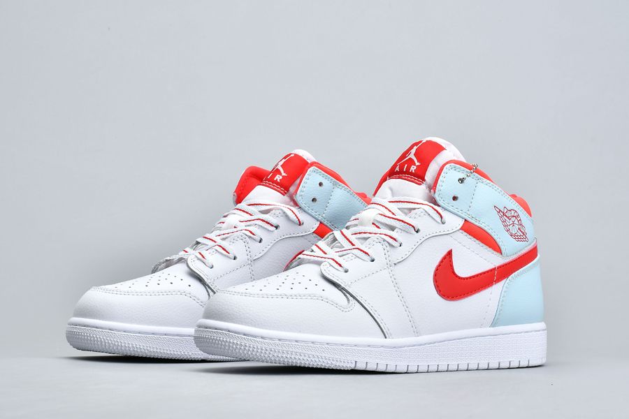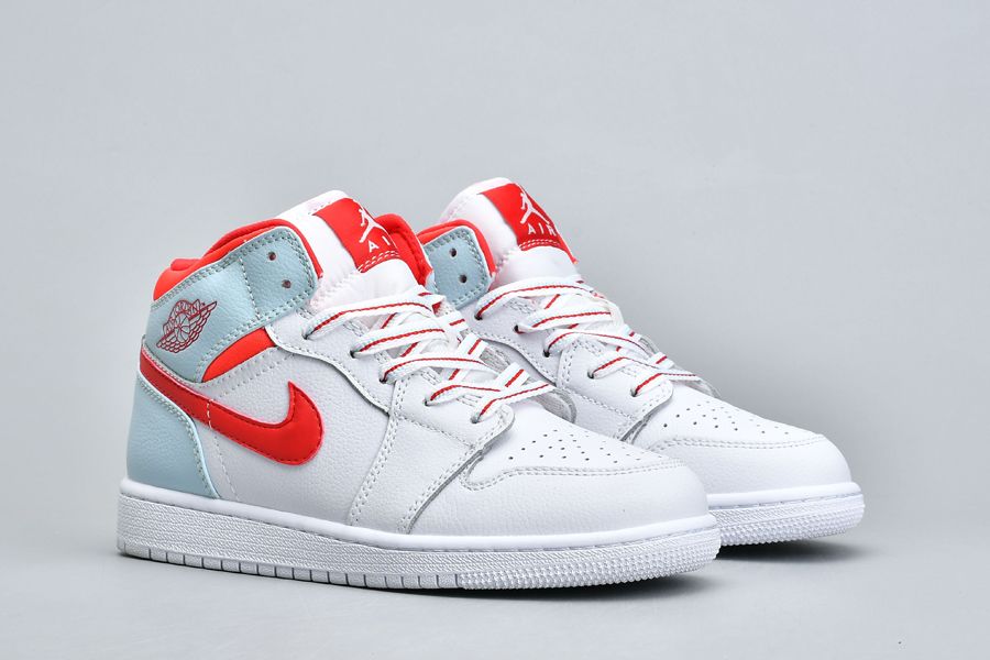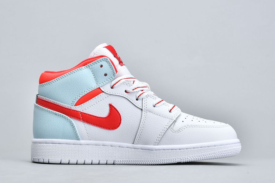 This Air Jordan 1 GS dressed in a White and Topaz Mist color scheme on an upper that is constructed out of a White leather and accented by the Red and Light Blue accents found on areas such as the heel, insoles, branding hits, lining, etc.