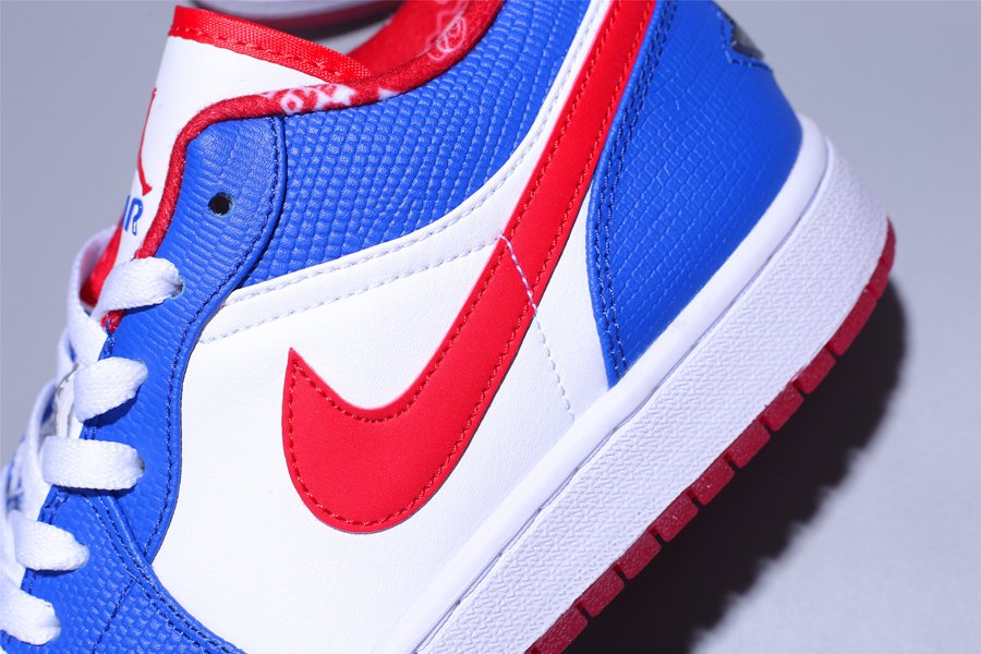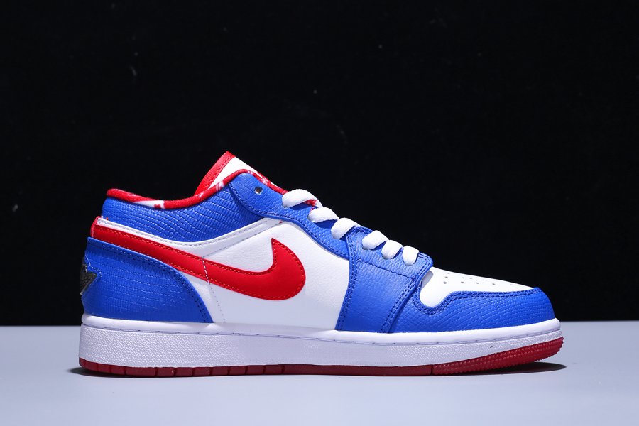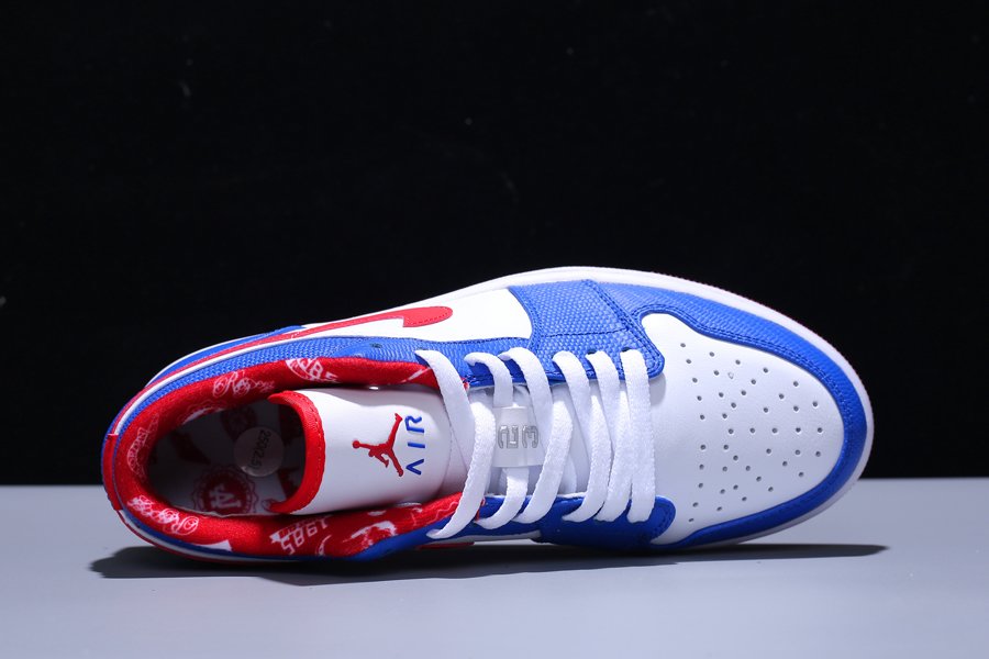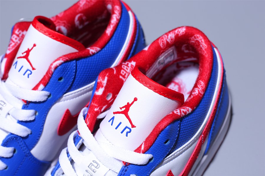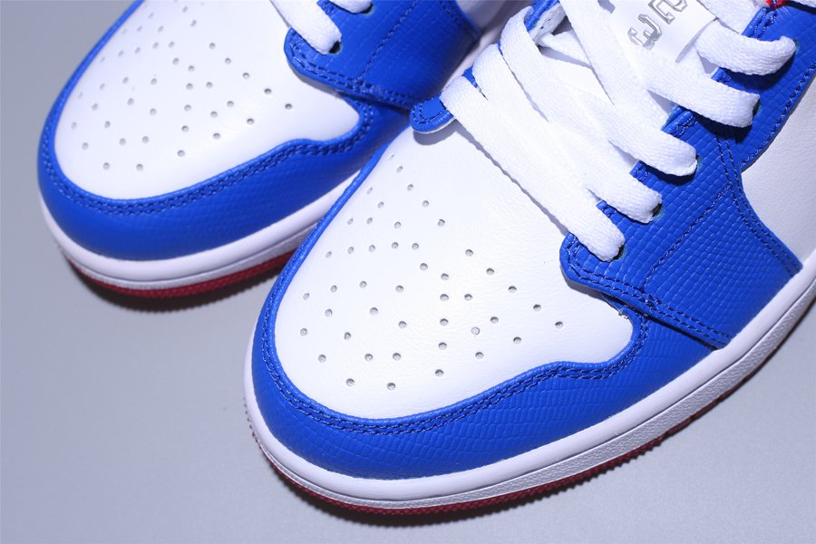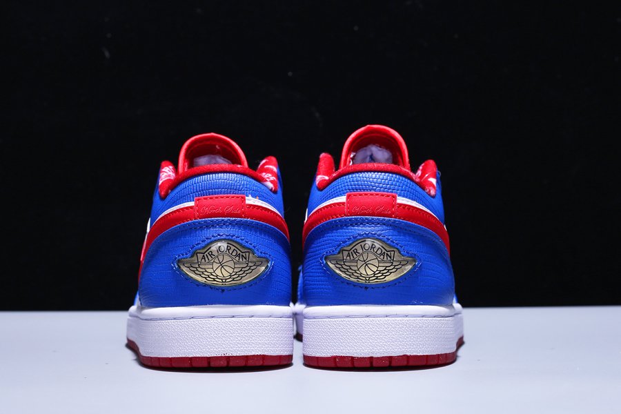 The Air Jordan 1 Low “East Side” features a white and blue upper with red accents on the inner lining, Nike Swoosh, and outsole. Adding depth to the design, the blue leather overlays bring a textured look and feel. A white midsole and red outsole complete the Jordan 1 Low “East Side.”