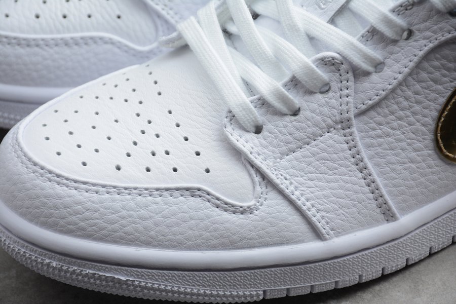 The clean pair dons white tumbled leather uppers that are punctuated with the highlight Metallic Gold hue adorning its tongues, Swooshes and the Wings logo embroidery on the heels. Finally, a solid white rubber sole tops off the design.