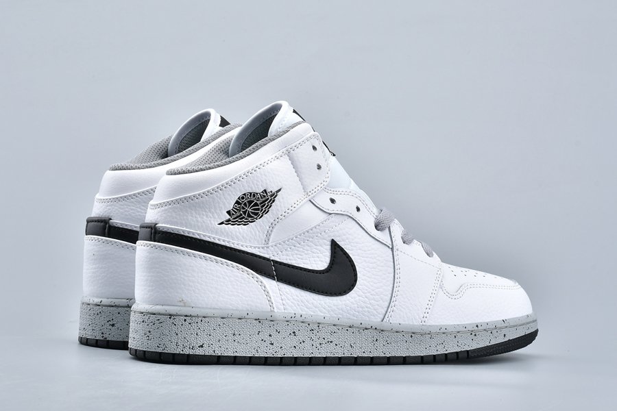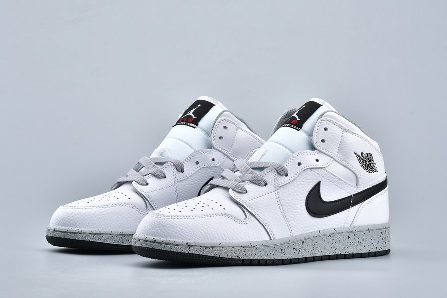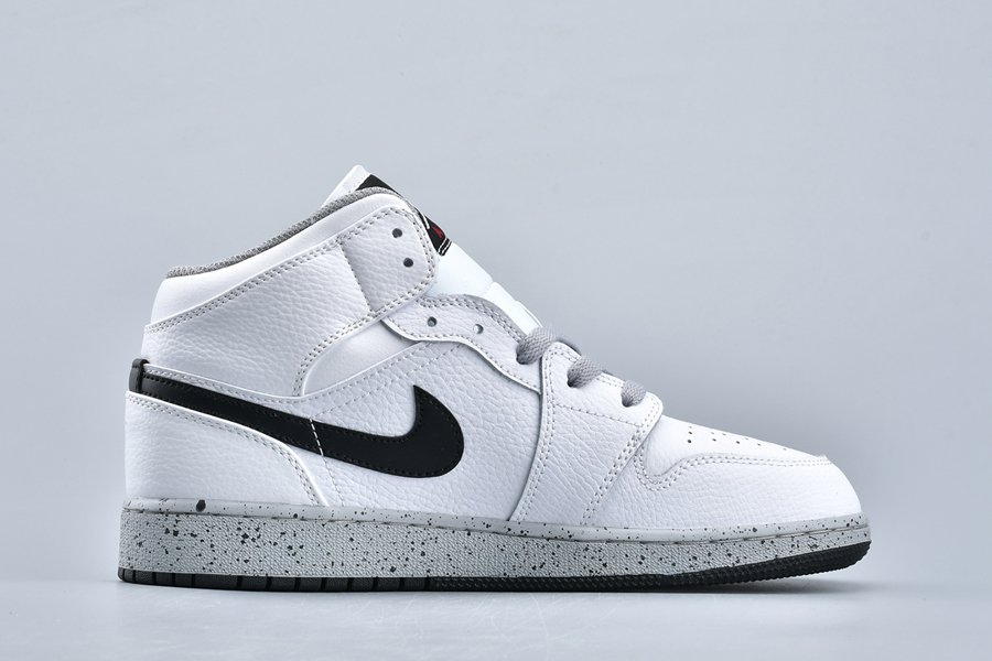 This mid-top sneaker dazzles with a clean white base. Black details can be found on the Nike Swoosh, Jordan Wings logo, and rubber outsole. Grey outfits the laces, sockliner, and speckled midsole. A bit of red is seen on the “Air” of the Nike Air tongue badge logo. A cupsole construction with an encapsulated Air-Sole unit and deep flex grooves complete the Air Jordan 1 Mid design.