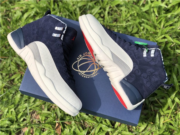 The Jordan 12 ‘International Flight’ shows us that it is much more than your standard blue AJ12. The navy blue Jordan 12 appears to pay homage to Japan, which is reflected in the Japanese art-style imagery used throughout the smooth blue suede upper. The heel tab of the shoe will also feature Japanese characters.