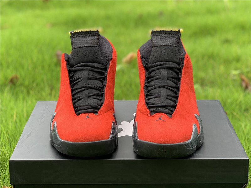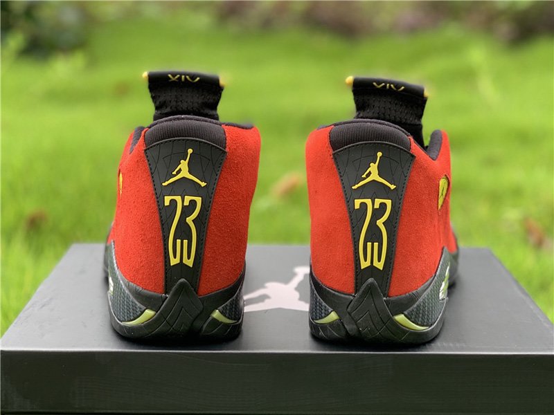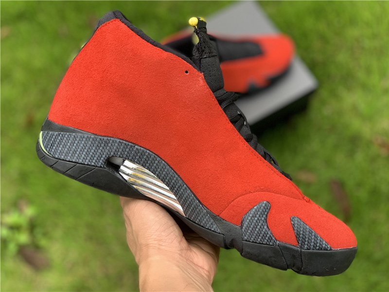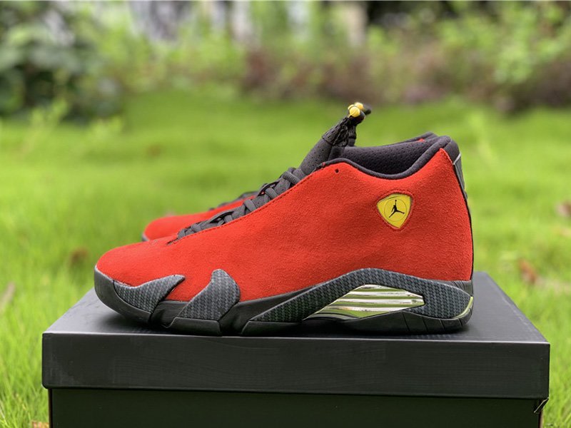 The Air Jordan 14 Retro “Ferrari” features a varsity red suede upper with black and vibrant yellow accents that were inspired by the luxury sports car. The design also includes Carbon Fiber shark teeth on the midsole and a chrome grill shank plate that also pay tribute to Ferrari.
