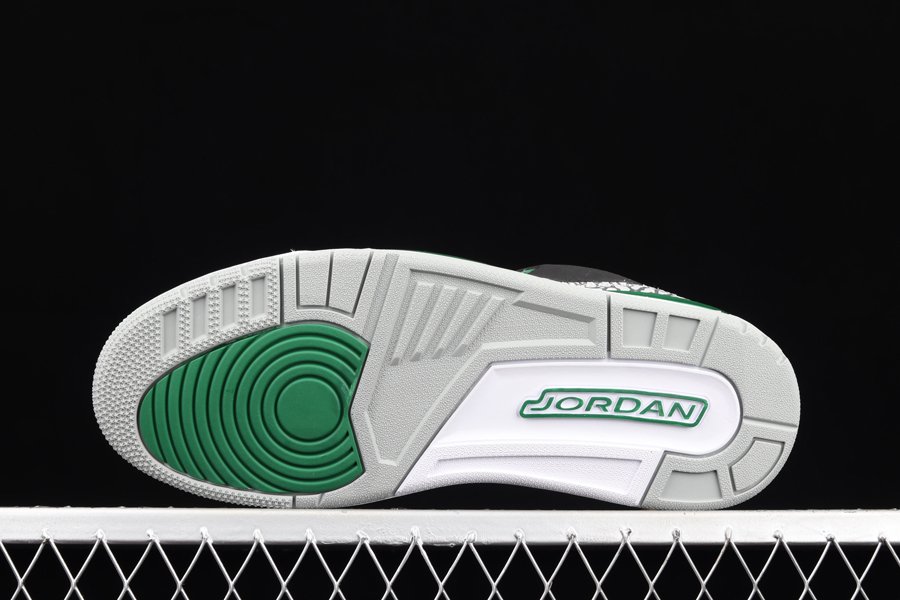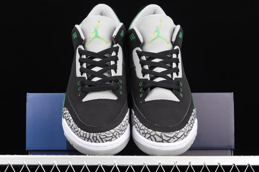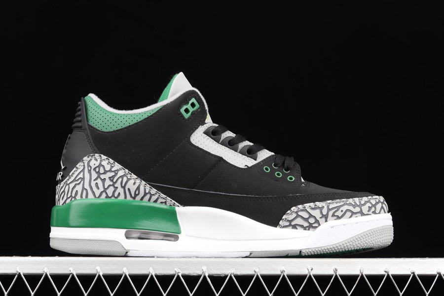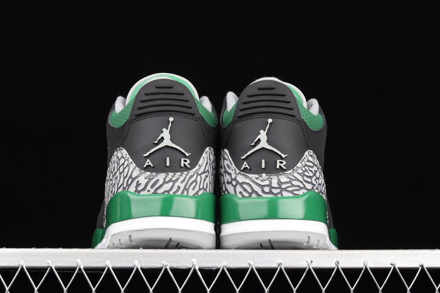 The Air Jordan 3 sports a Black, Pine Green, Cement Grey, and White color scheme. The traditional tumbled leather build will be replaced with a suede/nubuck upper while elephant print overlays adorn the toe cap and heels. Finally, Pine Green accents throughout, a white midsole and OG-styled rubber outsole.