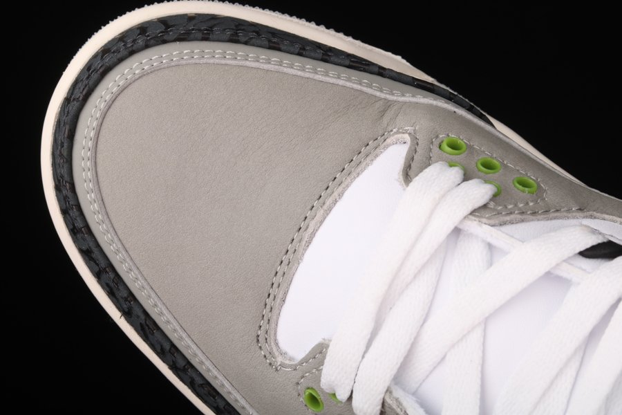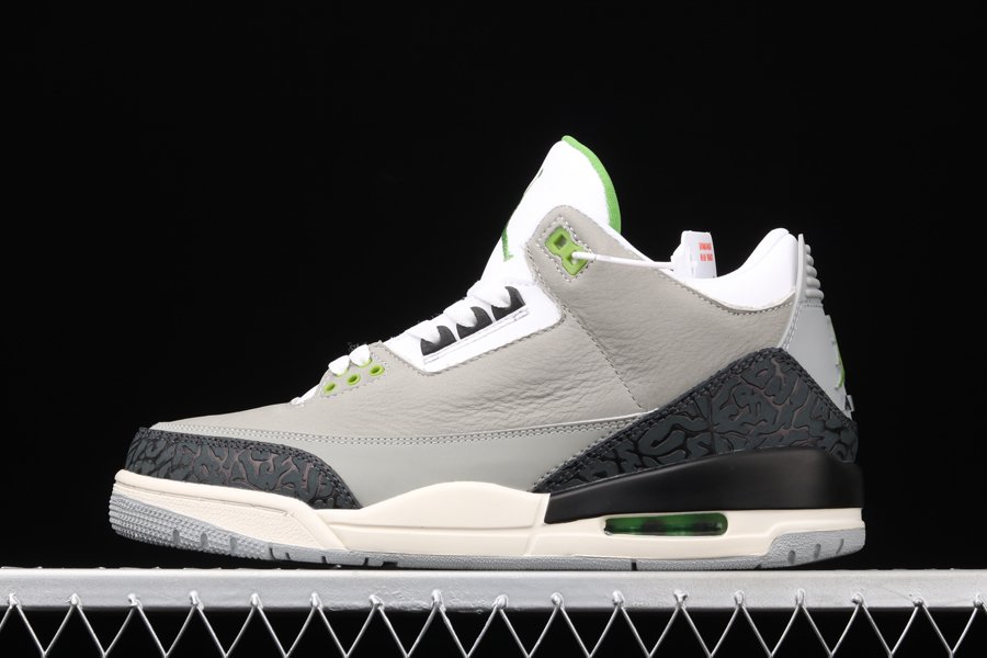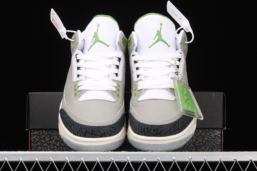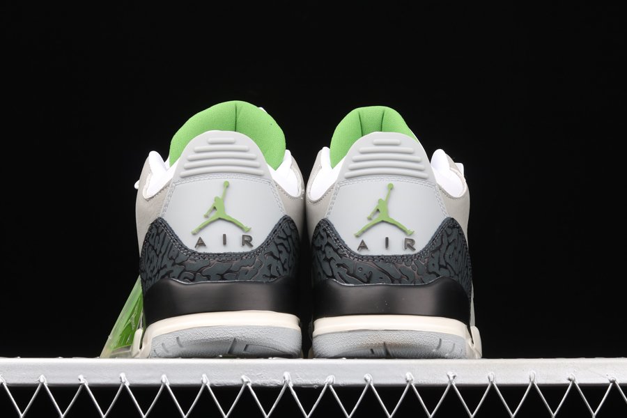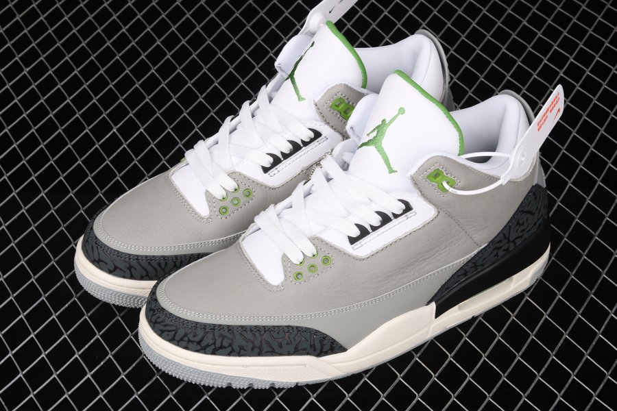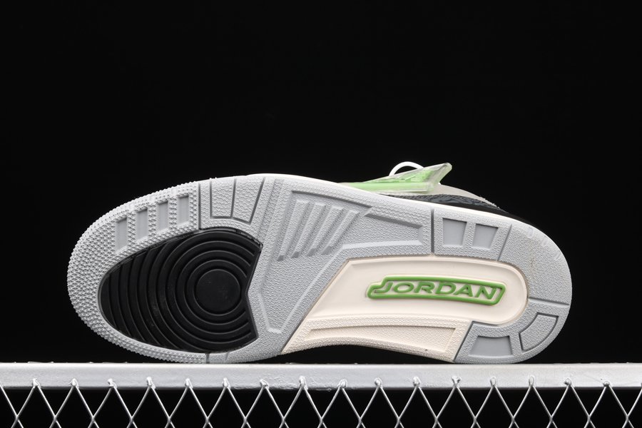 Part of a four-shoe “Nike Icons” Collection paying homage to some of Tinker Hatfield’s greatest non-Jordan designs, the “Chlorophyll” 3 draws cues from the Nike Air Trainer 1 in a colorway famously linked to tennis legend John McEnroe. The shoe features a mix of light and dark grey, white and black throughout. Light green accents hit the ‘Nike Air’ heel logo, tongue Jumpman branding and eyelets.