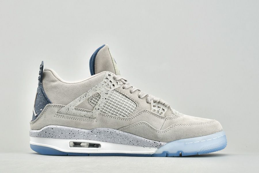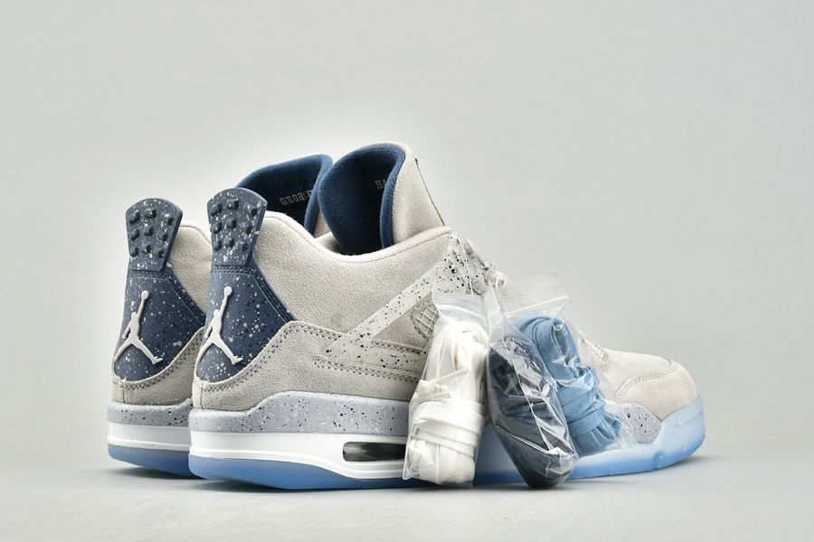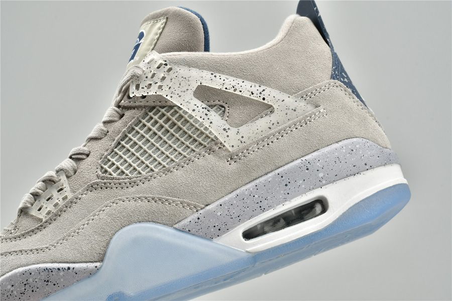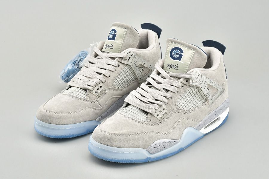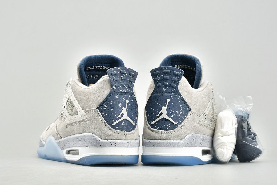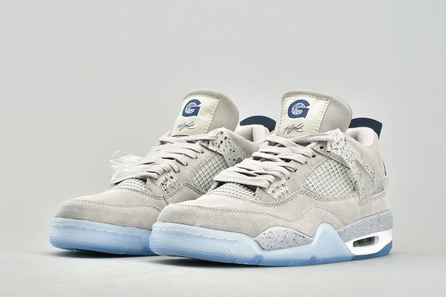 The Air Jordan 4 Georgetown PE pays special tribute to the Georgetown Hoyas basketball team. Exclusive to the players and staff, the model boasts light grey suede uppers that are detailed with semi translucent wings panels and eyelets, which are also covered with navy speckling. Other details include the Georgetown Hoyas logo on the tongue labels, navy colored behind the tongue and heel tabs that are speckled with grey, alongside a grey Jumpman logo. Finally, a white midsole, icy translucent outsole and more navy speckles on the midsole top it all off.