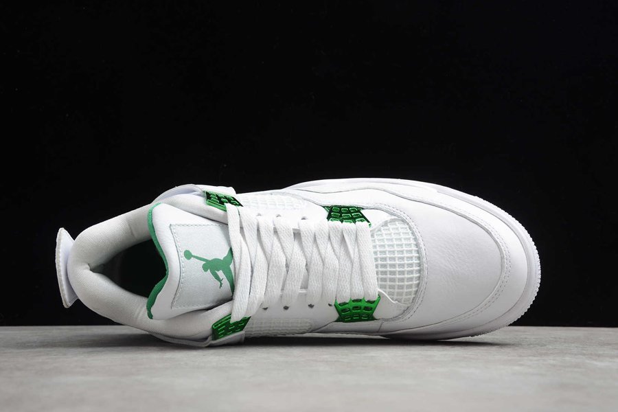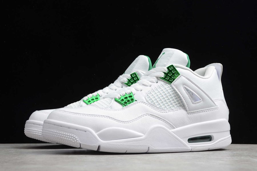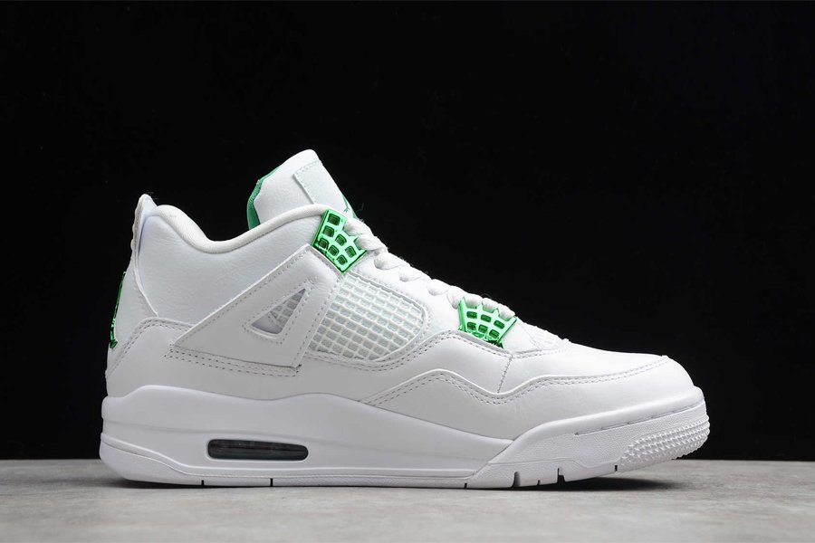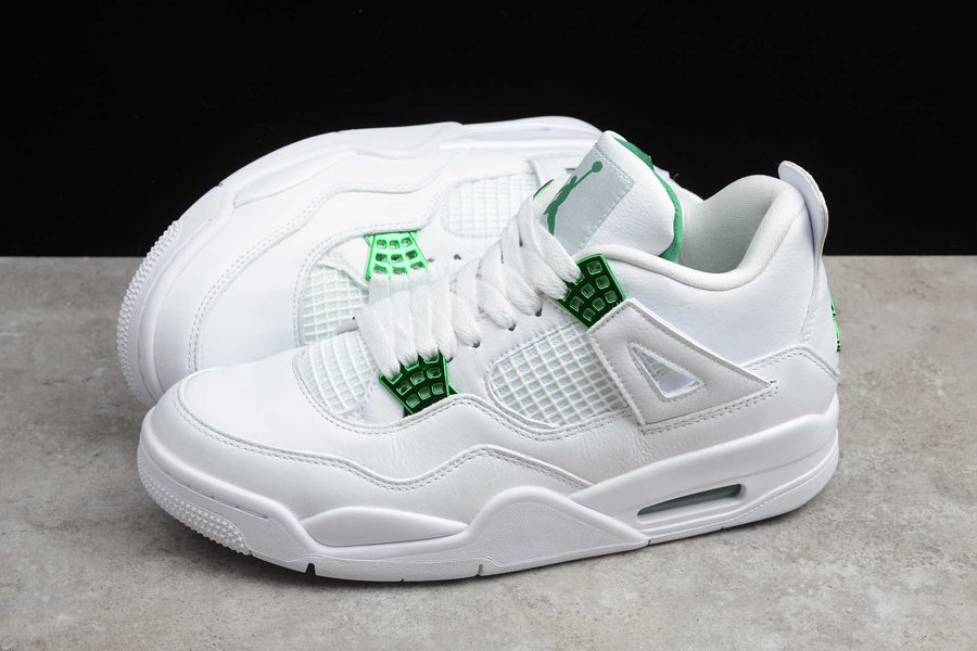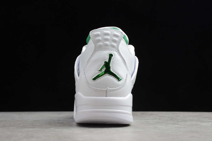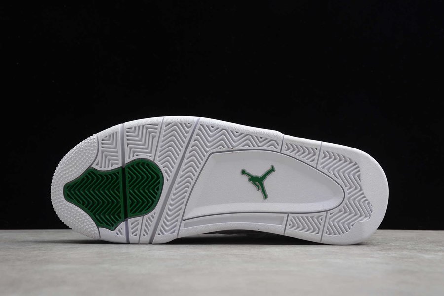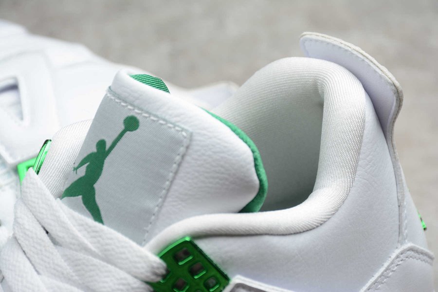 This clean offering of the Air Jordan 4 is dominated by an all-white leather construction on the upper with tonal detailing on the leather wings, tongue, inner liner, heel, midsole, and rubber outsole. For contrast we see Metallic Pine Green on the waffle eyelets, inner tongue, and the Jumpman branding on the tongues and heels.