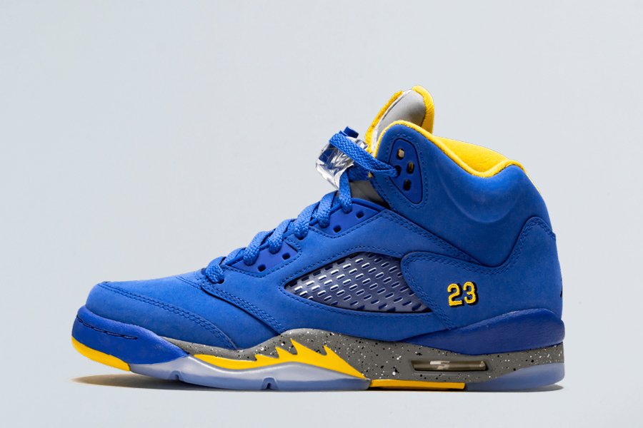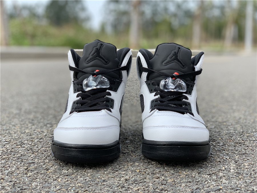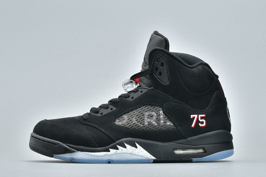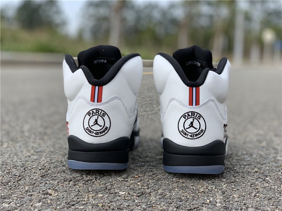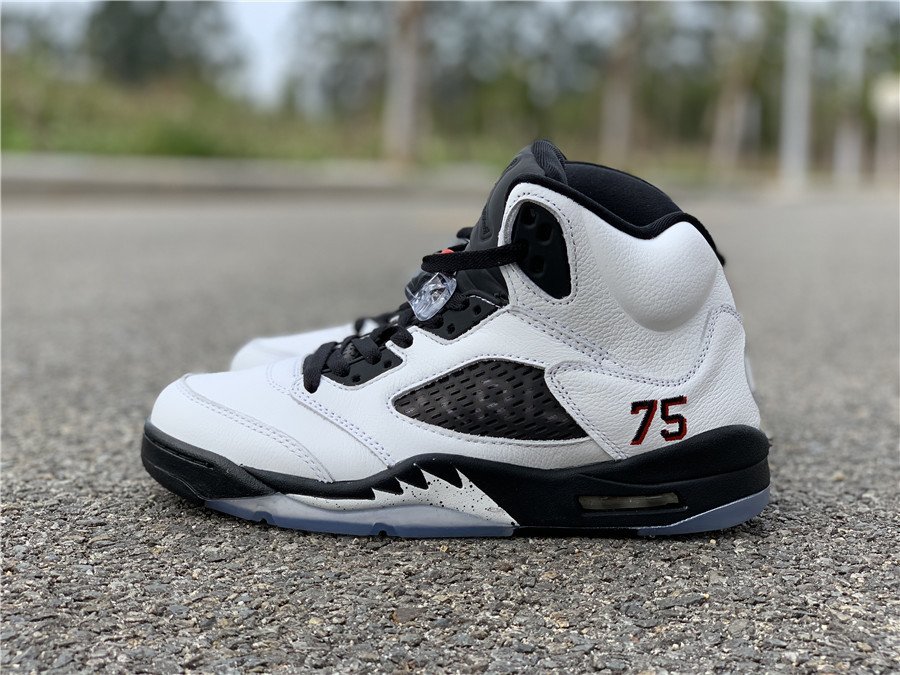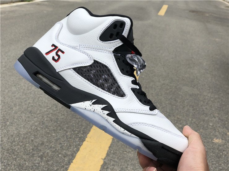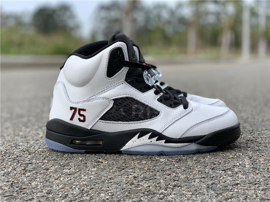 A new friends and family iteration of the team’s Air Jordan 5 surfaced today. The special-edition colorway sticks with many of the same details seen on the retail Jordan 5, but swaps out the black nubuck upper for white leather.