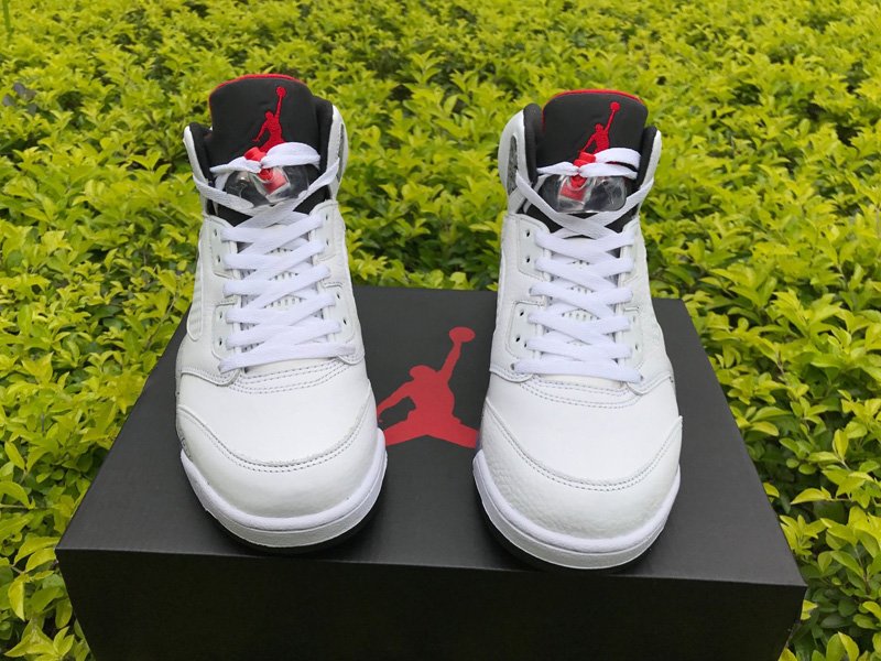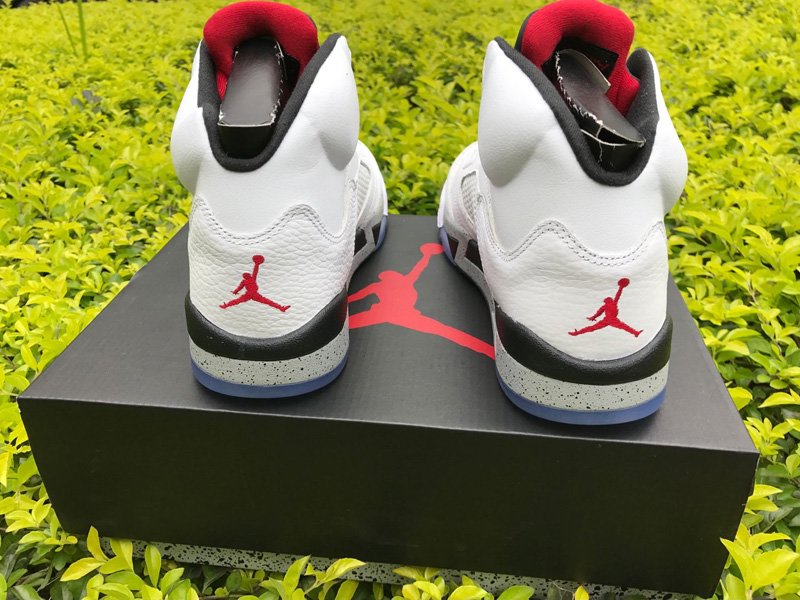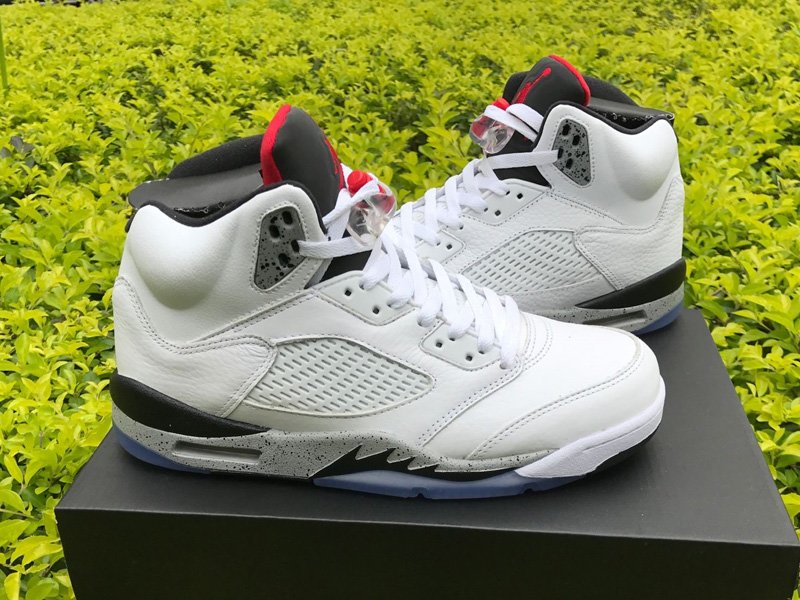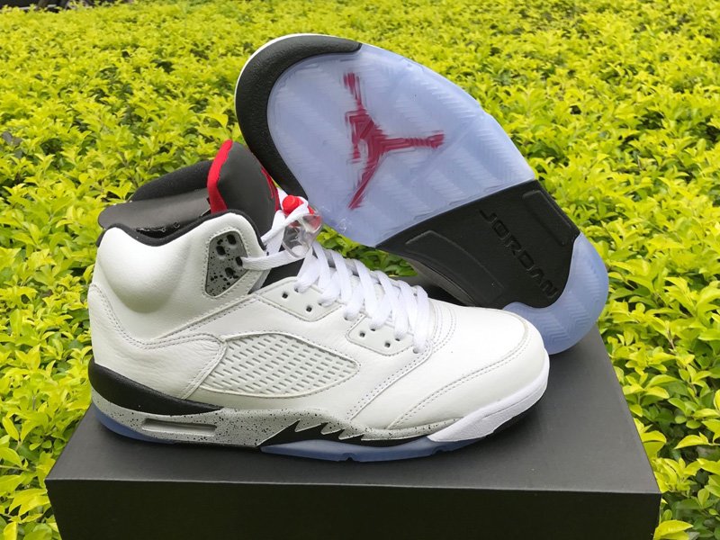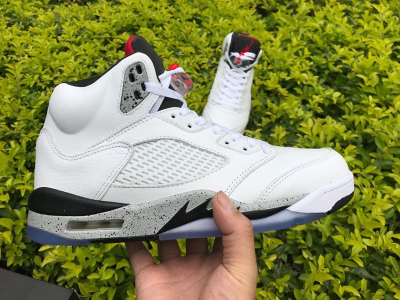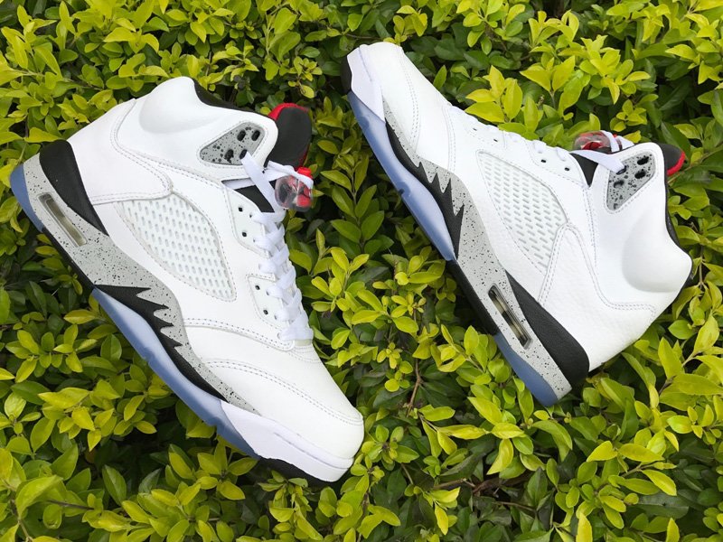 The Air Jordan 5 “White/Cement” features a white leather upper and white netting on the sides and tongue, which is very simliar to the Air Jordan 4. Cement accents are found on the midsole and top eyelets, while a black and red tongue add bold color. A traditional icy translucent midsole completes the sneaker.