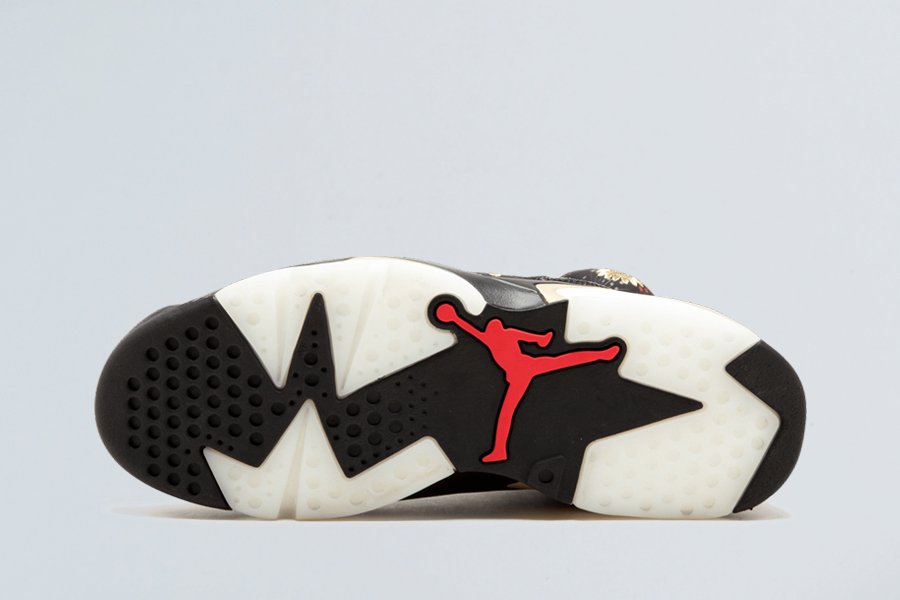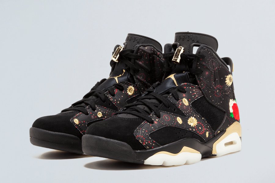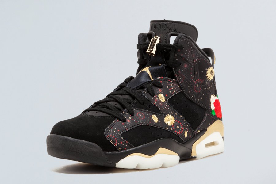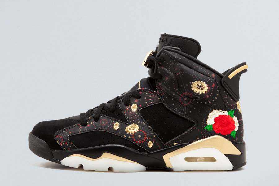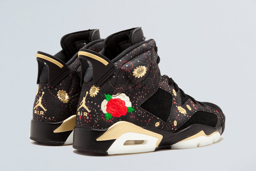 The Air Jordan 6 CNY features an all-over multicolor design across its black upper made of nubuck and leather, while floral embroideries highlight the look and are applied with a patterned overlay throughout. Contrasting metallic gold accents, a milky white translucent outsole with black and red hits are also used across to finally complete the design altogether.