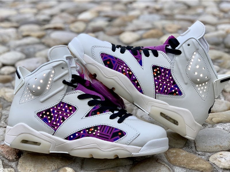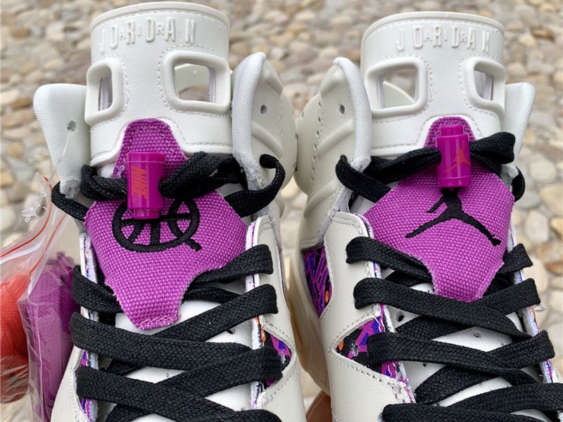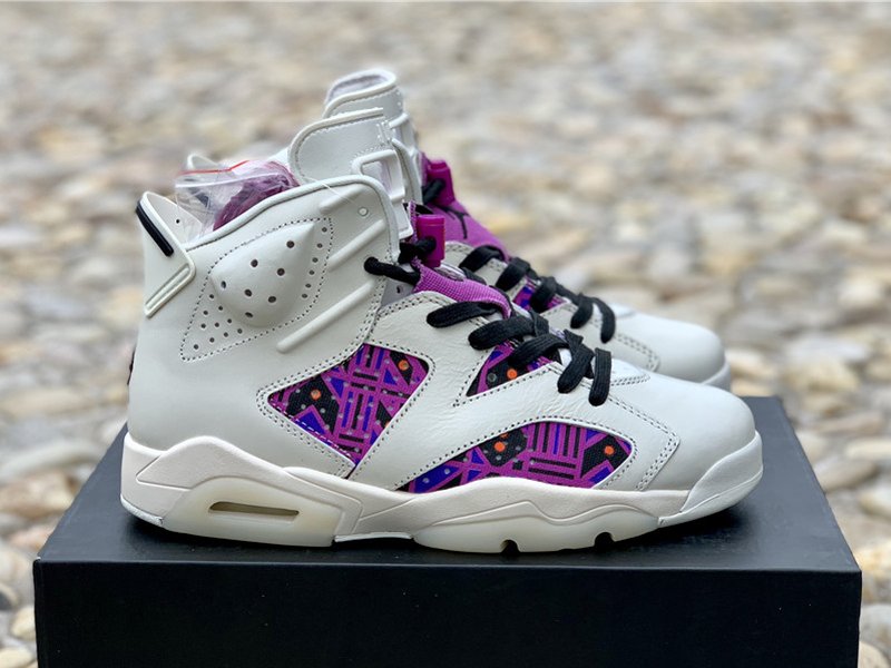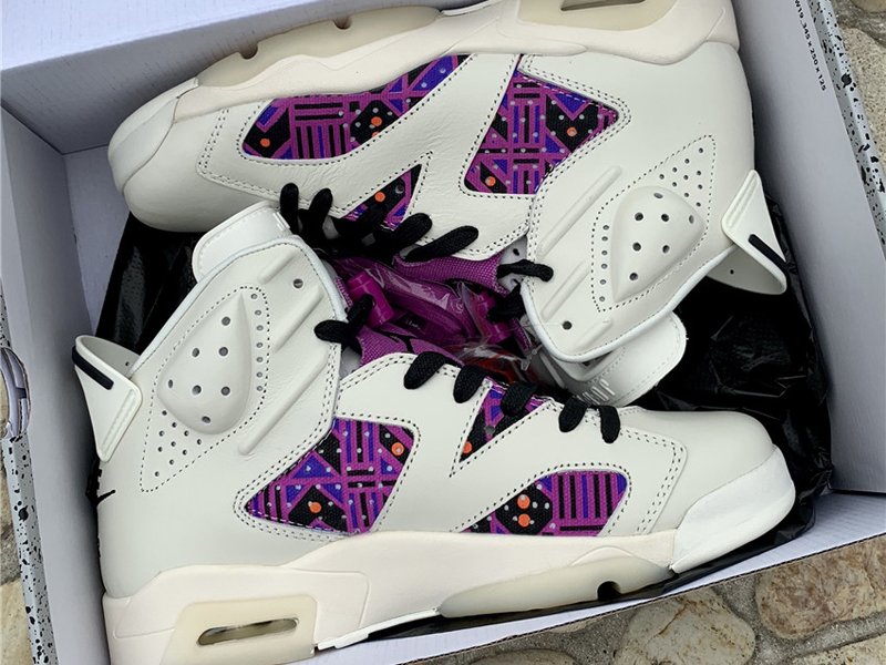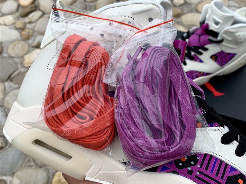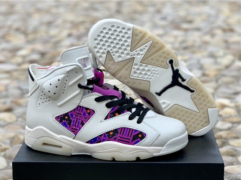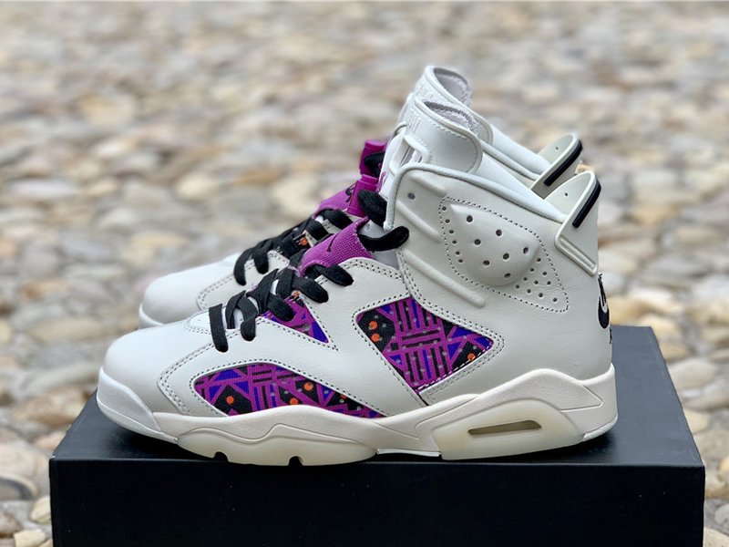 Uppers flip between elegant and flamboyant, mixing a supple sail leather build with vibrant prints on both the lateral and medial quarters. This print is essentially a color-shifted take on the graphics used for the collection’s other Air Jordan 6 and Air Jordan 1 Low, thanks to a mix of purples, blues, oranges and browns. The left shoe retains standard Jumpman branding on the throat overlay and a Nike Air hit on the heel, while the right shoe swaps both for Quai 54 graphics.