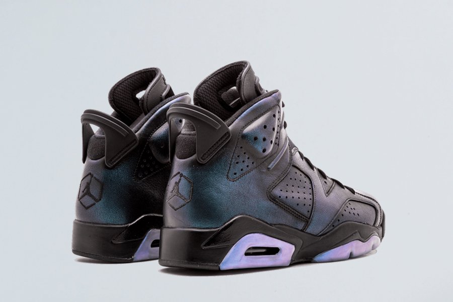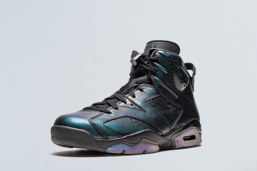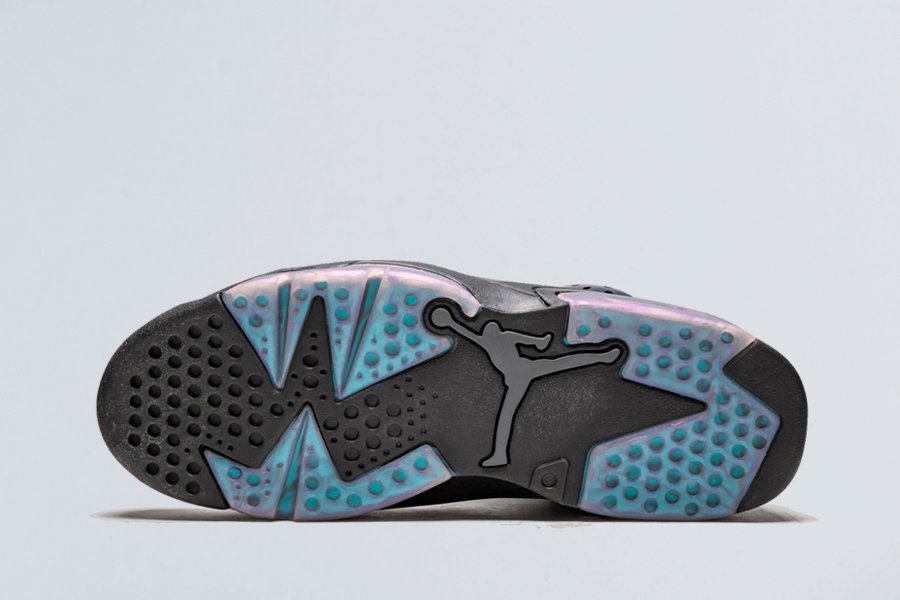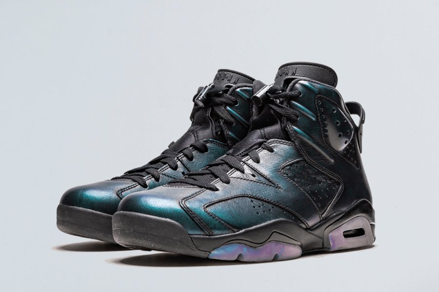 Sporting a stealthy black leather upper which reveals an iridescent finish that shifts in colors depending on certain lighting conditions, it’s suggested that this shimmering element is achieved when rubbed off, which was a prominent feature that was first found on the Air Jordan 12 Wings.