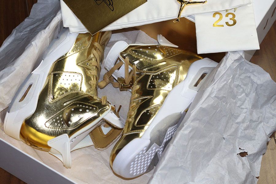 The Jordan 6 gets the high-end treatment with the release of the Air Jordan 6 Retro Pinnacle “Metallic Gold.” Previously believed to be a Spike Lee Oscars PE, the sneaker is done in a full shiny metallic gold upper with white accents sitting on a white midsole and icy outsole.