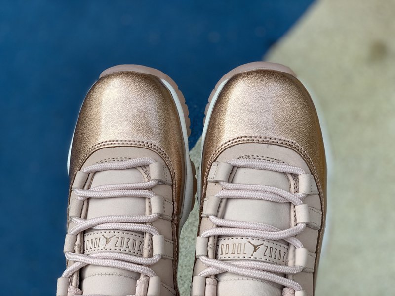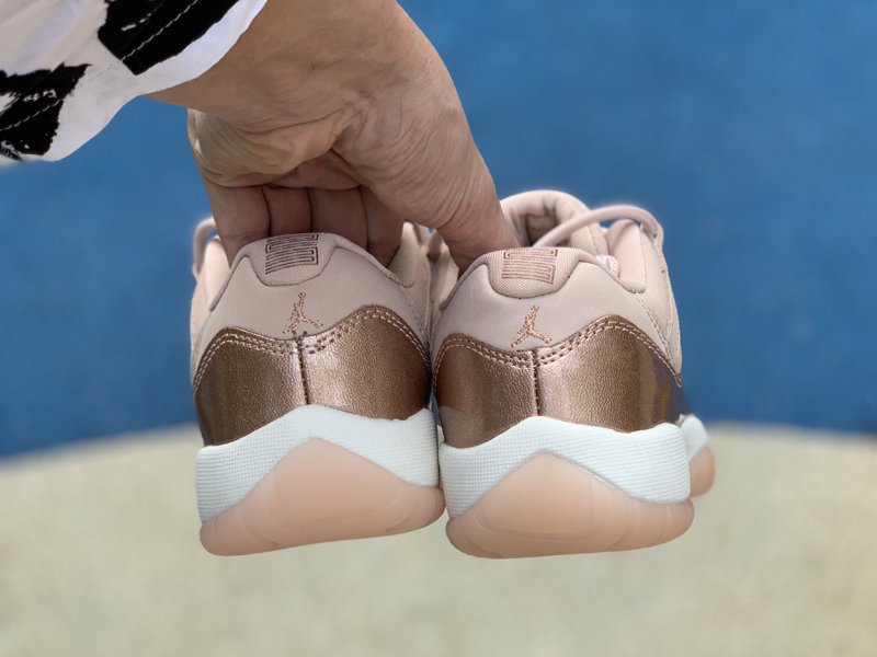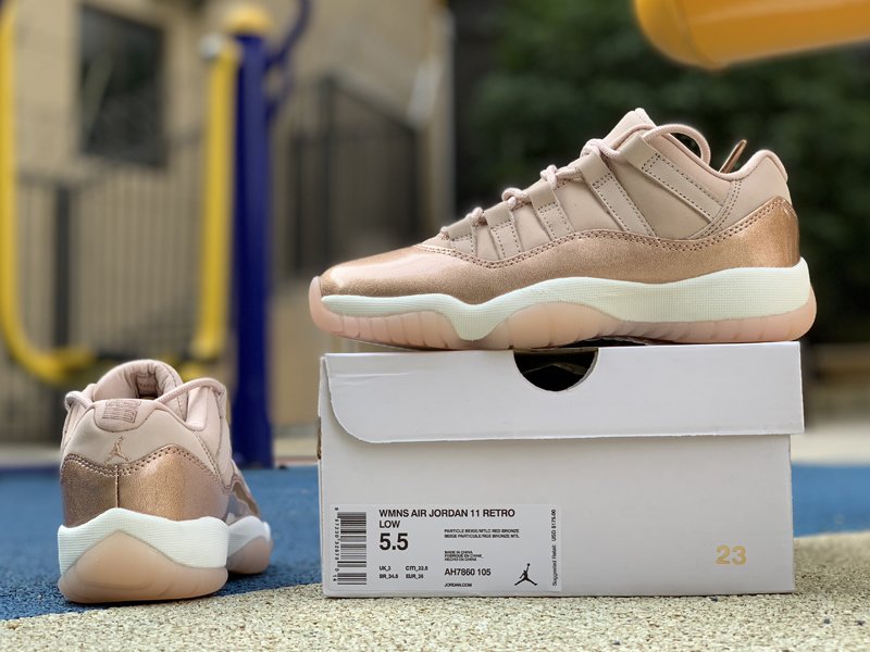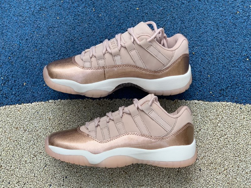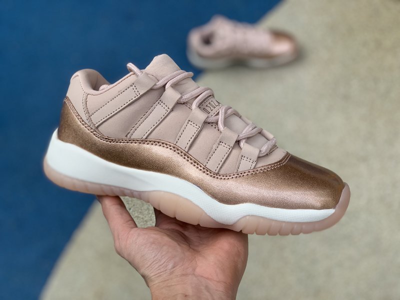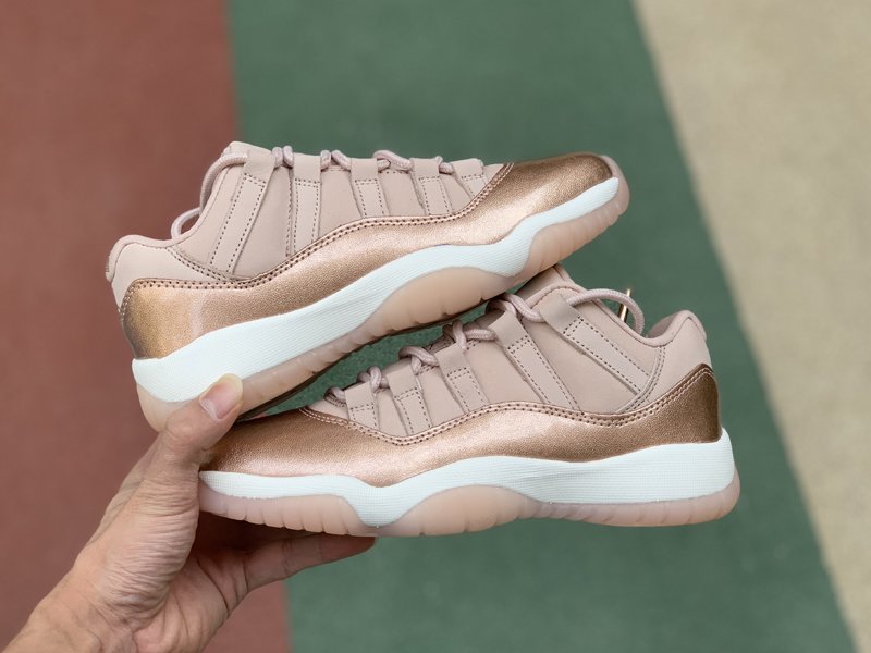 This Jordan 11 Low rocks Rose Gold-like upper, the usual mesh has been replaced with suede. The highlight of this colorway is the shiny pink leather replacing the usual patent leather. Finished off with an all-White midsole and Pink translucent outsole.