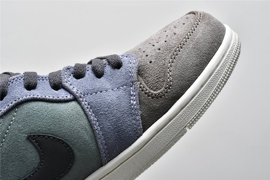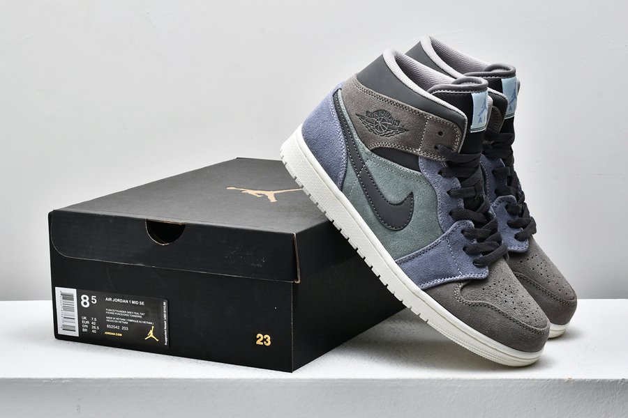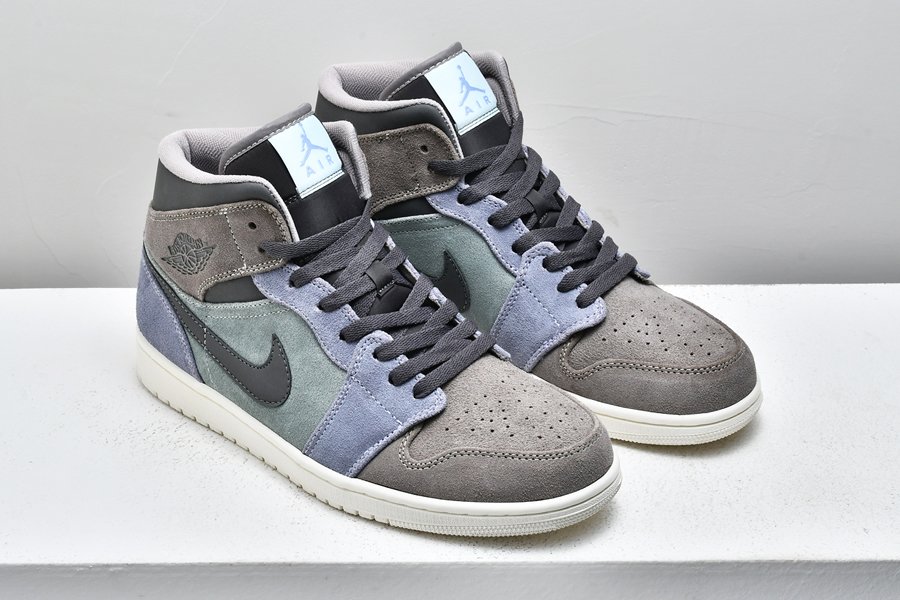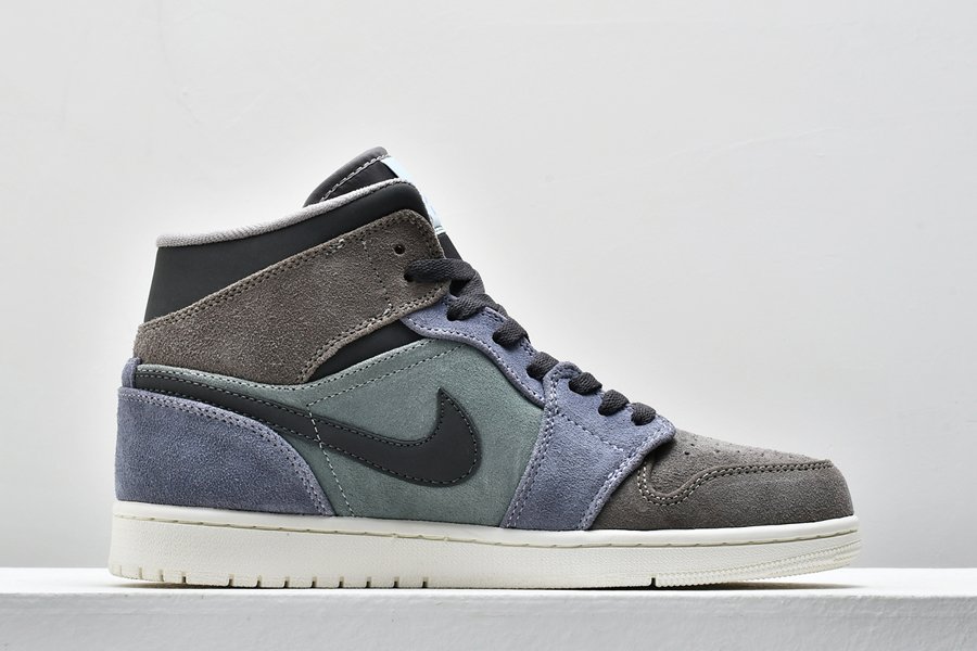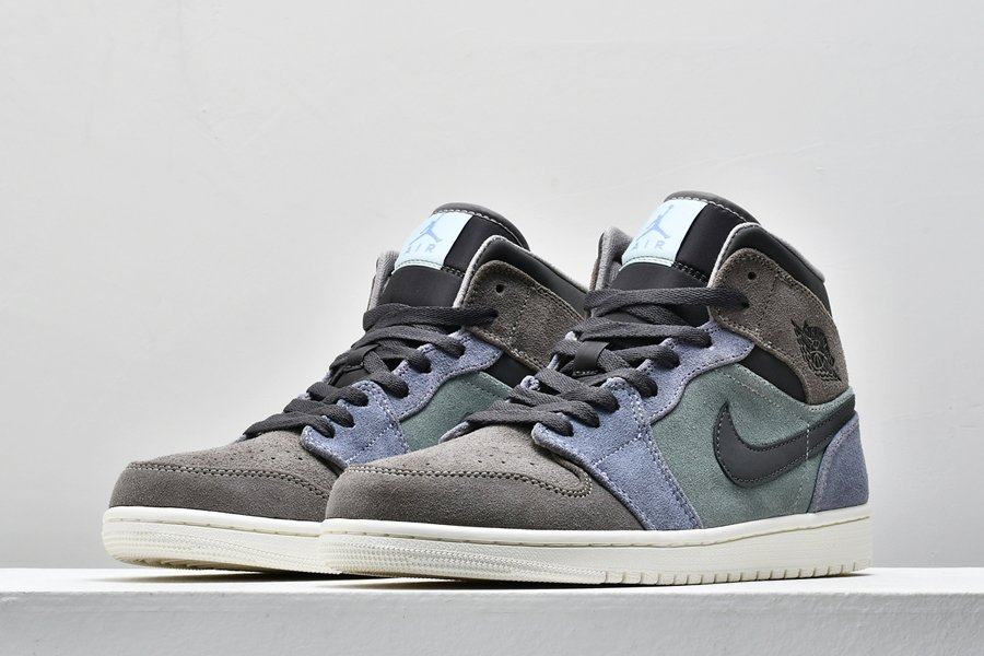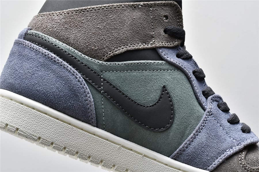 This Air Jordan 1 Mid uses earthy shades of Green, Purple, Dark Grey and Brown all over the suede upper complimented by Black laces, an off-White sole unit and Jumpman branding on the tongue consisting of a Teal tongue tag and Blue Jumpman. Inside you will find a Lavender insole with even more Jumpman branding on it.