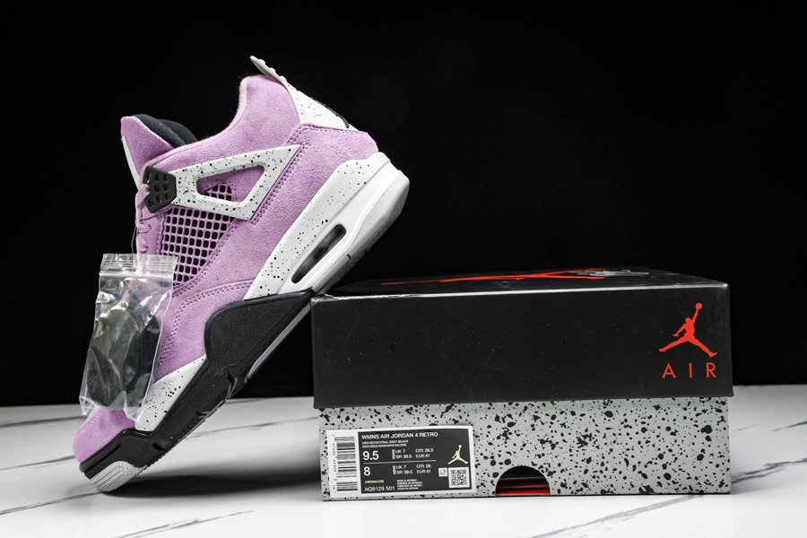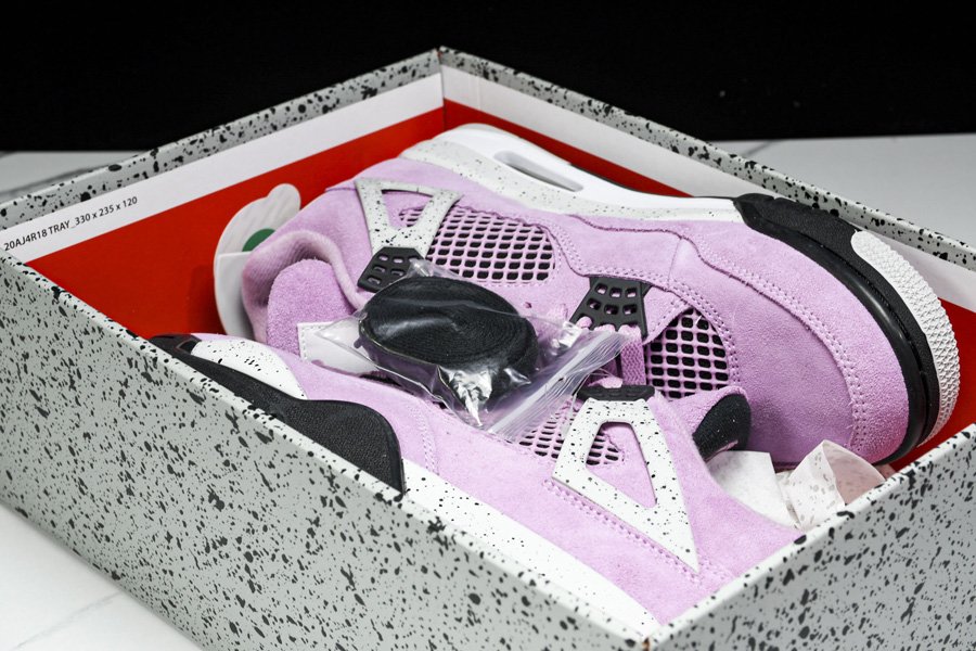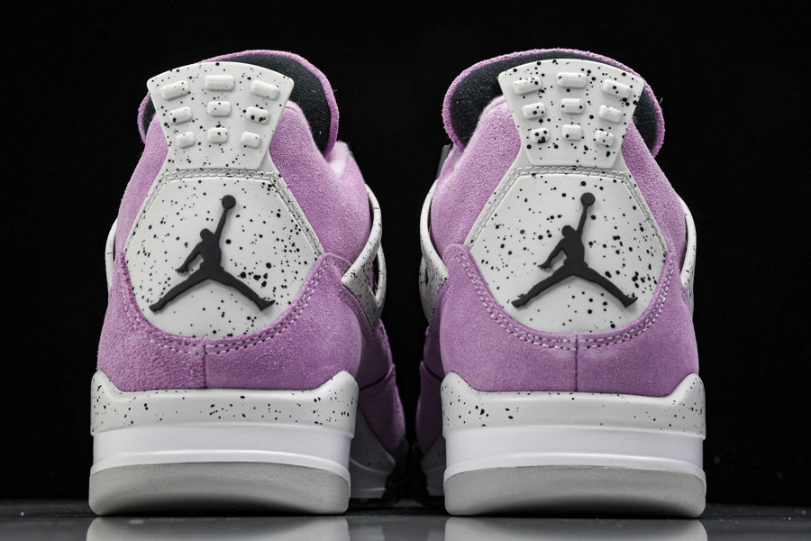 This Air Jordan 4 comes dressed in an Orchid, Neutral Grey, Black, and White color combination. The shoes features the same color blocking as the “University Blue” Air Jordan 4, except highlighted in Pink. Orchid suede drapes the entire upper with Grey cement print on the Wing eyelets, part of the midsole, and heel tabs. We also have Black accents and White around the Air unit. Lastly, the Jumpman logo is placed on the tongue and heels.