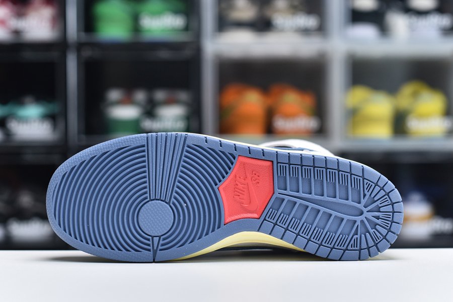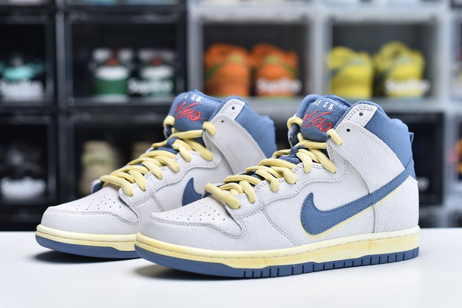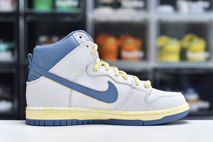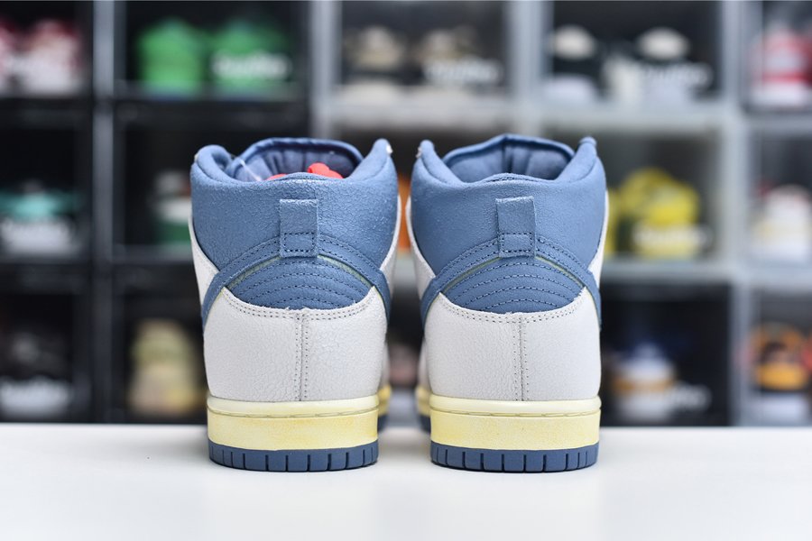 The Atlas x Nike SB Dunk High “Lost at Sea” is draped in a nautical-inspired color scheme that blends blues with tan and sail. Composed of weathered, cracked leather uppers, the notable light blue hue adorns the Swooshes, collar and tongue, while aged cream detailing is evident on the laces and outlining of each Swoosh. Additionally, the tongues bear special co-branding, as down above, intentionally yellowed midsoles with Zoom Air cushioning in the heel complements the laces, while light blue outsoles top off the style.