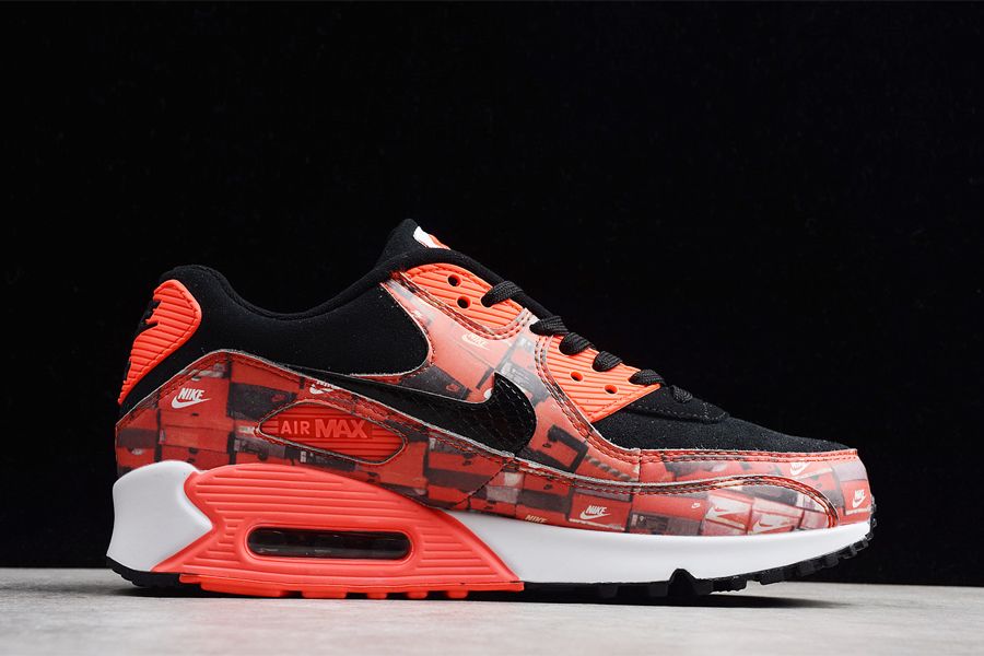 Dressed in a ‘Black’, ‘Bright Crimson’, and ‘White’ colour scheme. This Nike Air Max 90 is highlighted with an all-over Nike box graphics on the mid panel and mudguard as well as the insole. A black snakeskin texture features on the Nike Swoosh logo, while ‘Crimson’ accents and a white midsole complete the design.