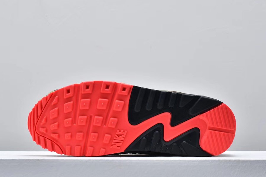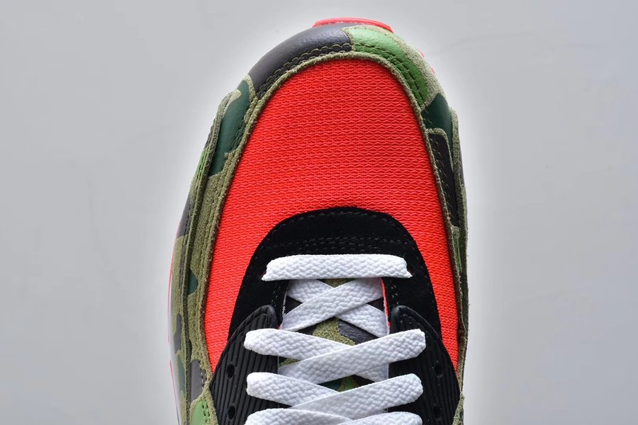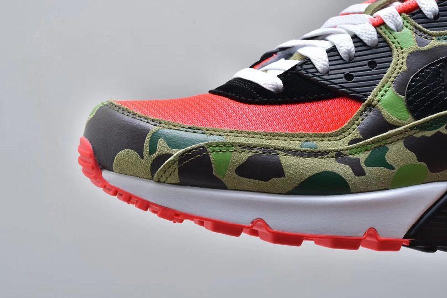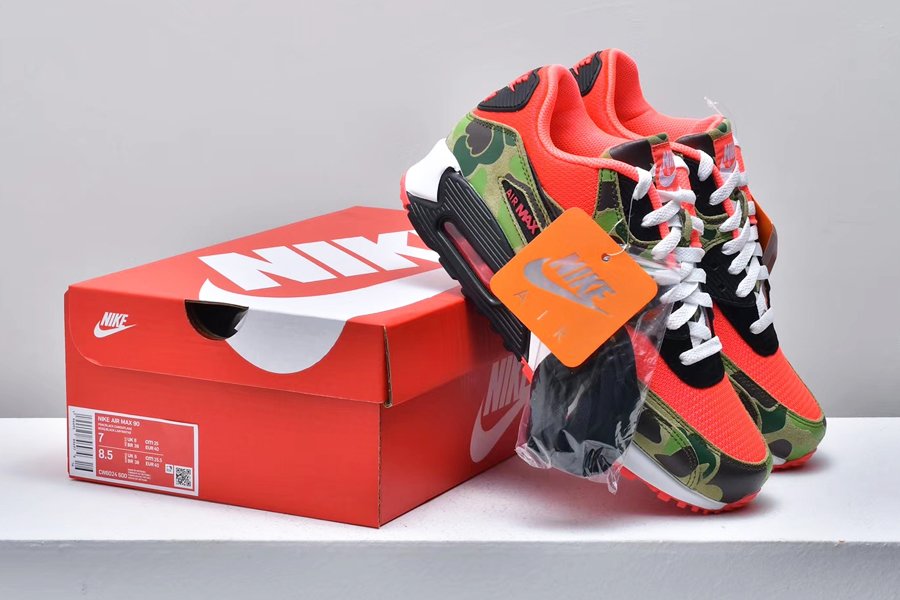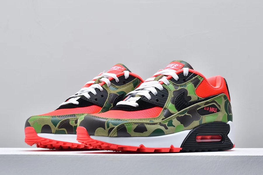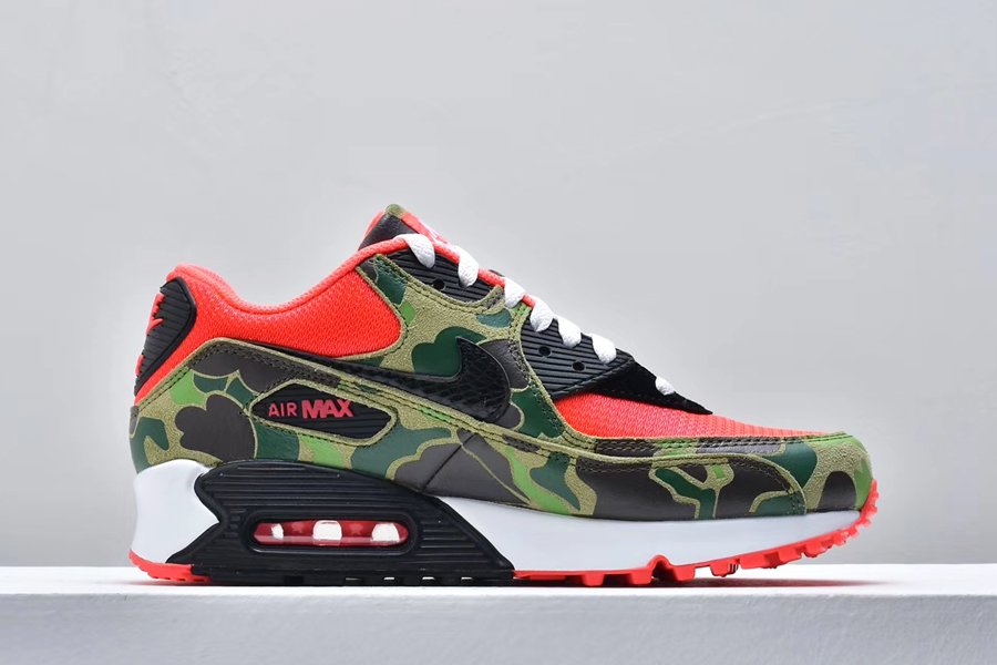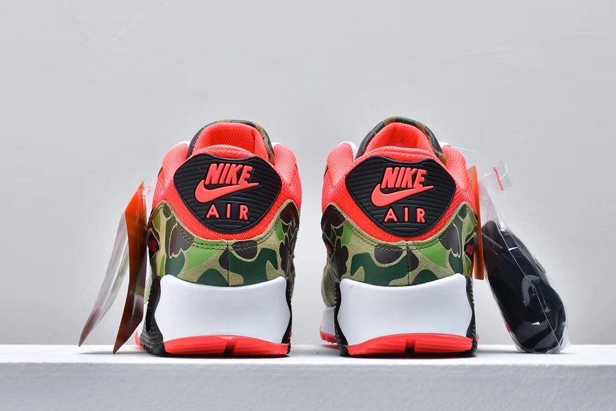 Nike continues to celebrate the Air Max 90s 30th anniversary by looking back at iconic pairs of the past and adding a touch of contemporary flair. Heavily influenced by the 2013 Duck Camos that released in partnership with Japanese retailer Atmos, this pair has the green-based camo pattern across the uppers and a reptile-like Swoosh to the sidewall. Bringing it back to Beaverton, Nike ramps up the infrared inclusions. It adds the model’s iconic hue to the mesh and branding throughout while exposed Air cushioning sits underfoot, just as it has since 1990, to provide unrivalled street comfort.
