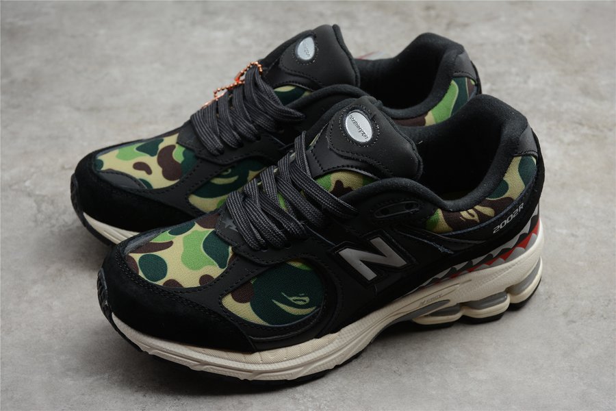Launching as part of the ‘Apes Together Strong’ capsule collection, the BAPE x New Balance 2002R ‘Camo’ dresses the retro runner in the Japanese streetwear brand’s signature flourishes. BAPE’s ABC camo in green and brown floods the textile upper, fortified with black and charcoal overlays in suede and nubuck. Silver reflective detailing is applied to the ‘N’ logo and the shark tooth detailing that wraps around the heel. The sneaker is mounted on an off-white ABZORB midsole, featuring ABZORB SBS heel cushioning for added stability.