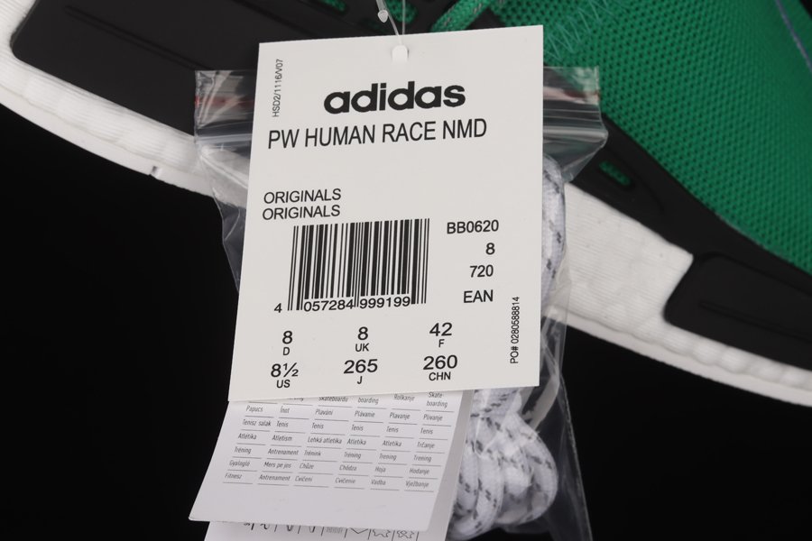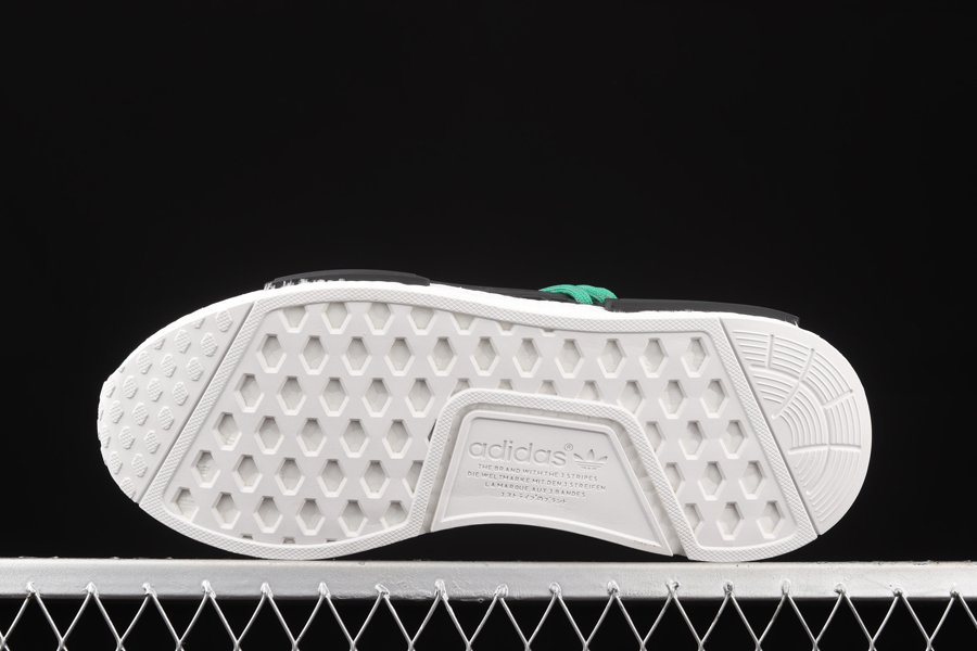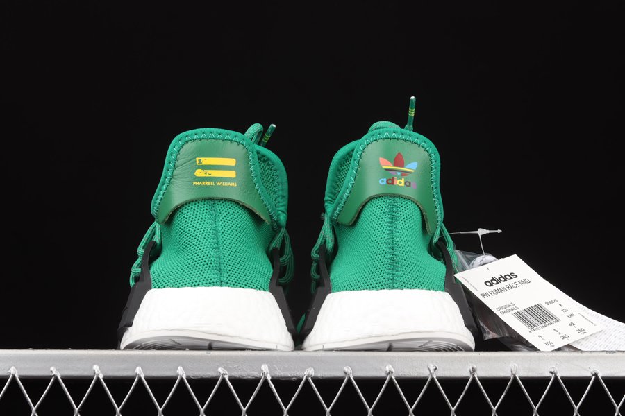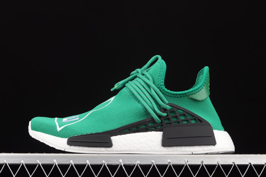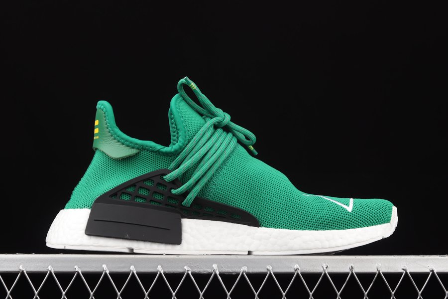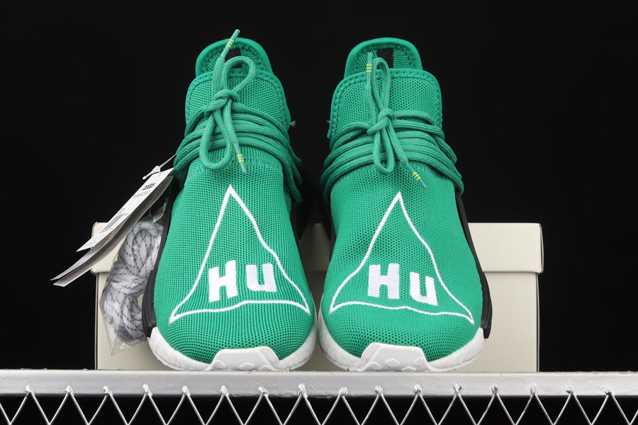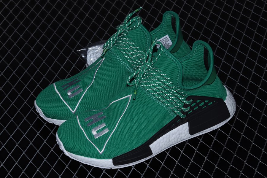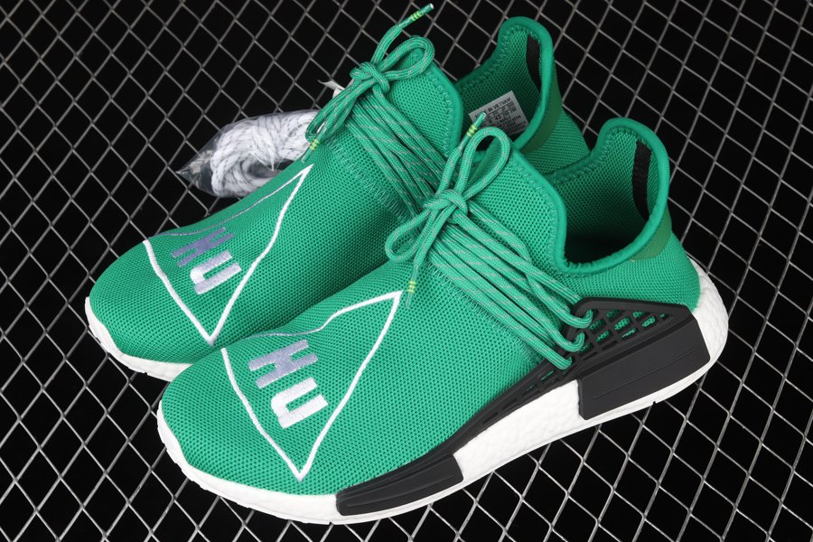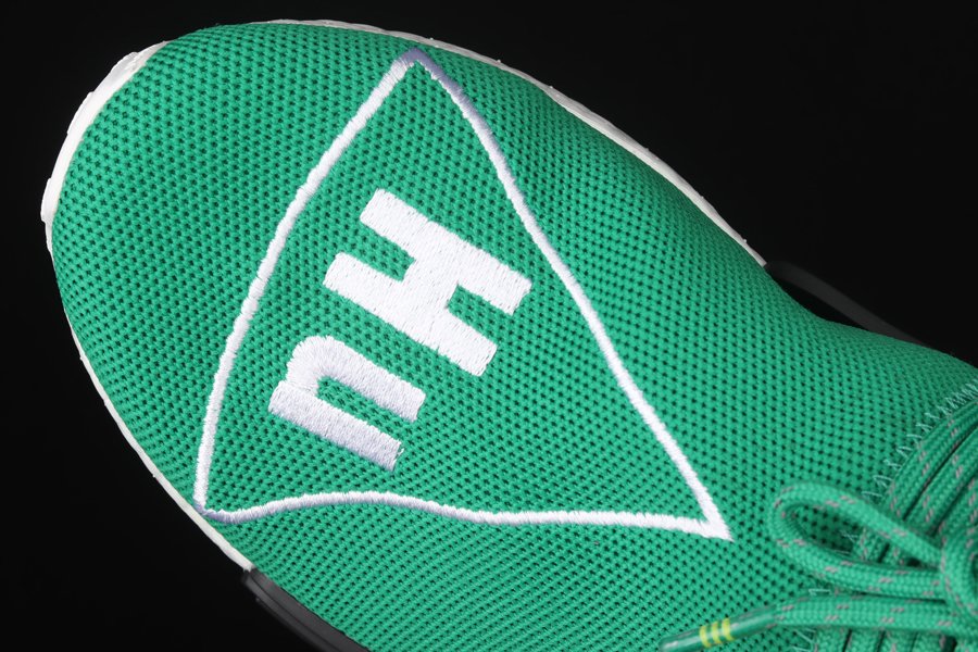 The Pharrell x NMD ‘Human Race’ ‘Green’ has green Primeknit uppers with white embroidered triangles featuring the words ‘HU’ on both feet. Released in September of 2016, the design also includes a black foot cage, white Boost midsoles, black bumpers, and a white outsole.