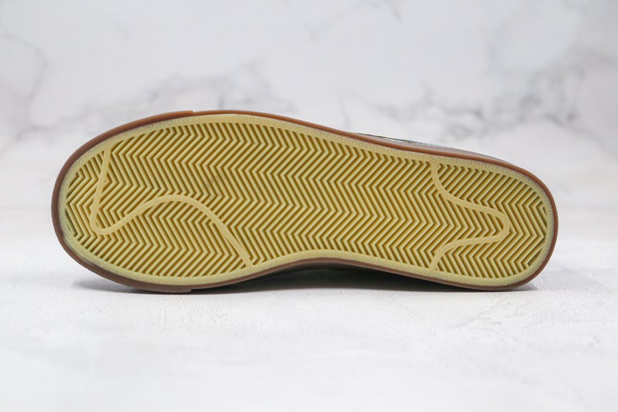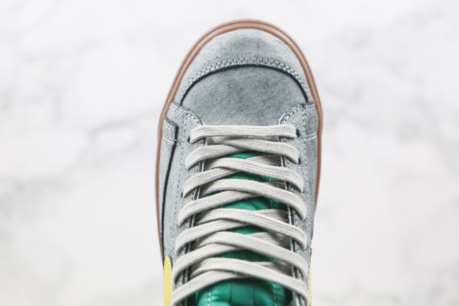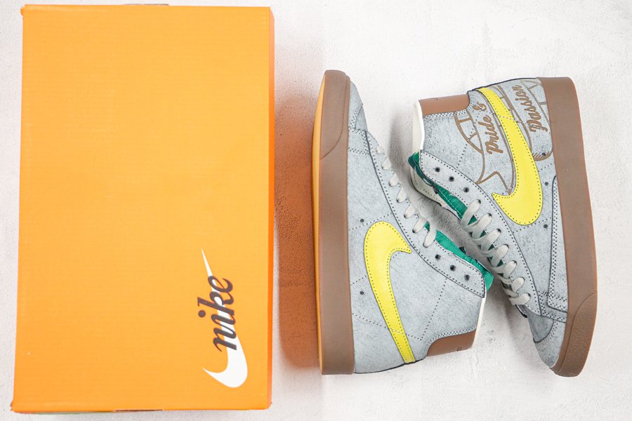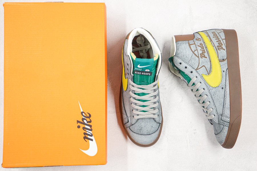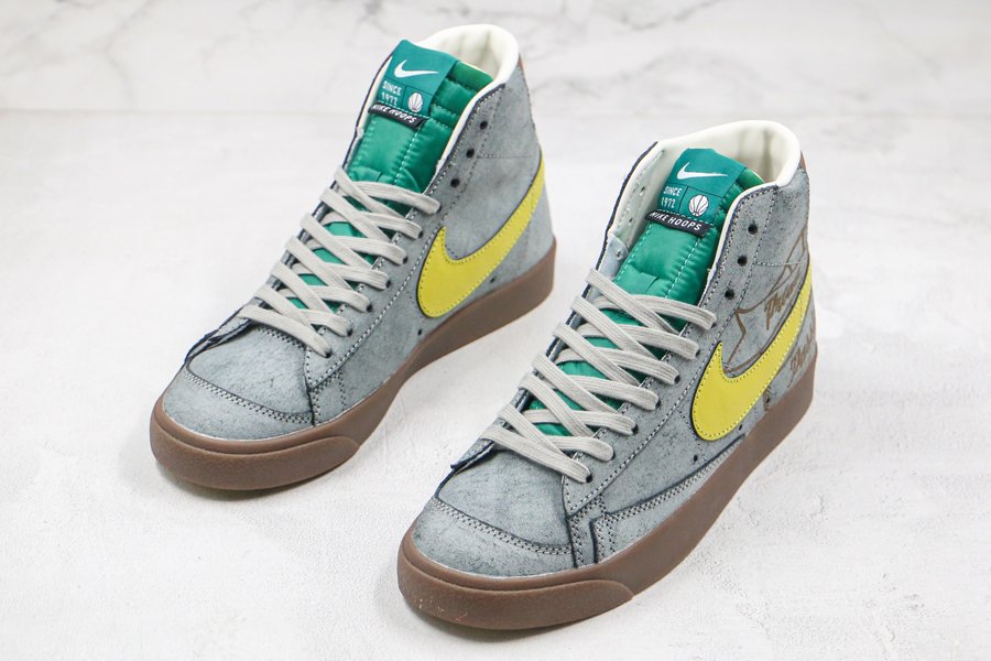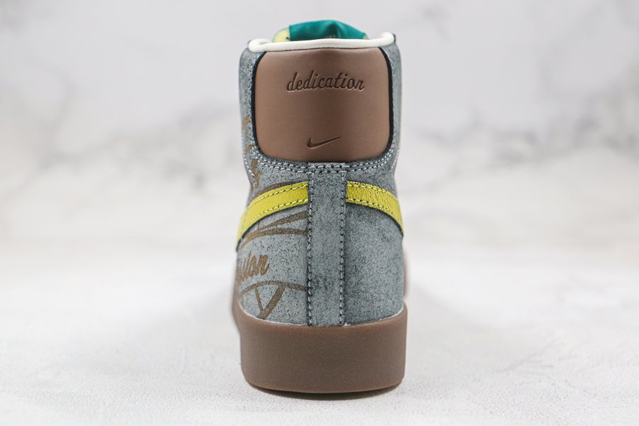 Drawn from a Pregame Pack that explores how athletes get ready for the big game, the Ben Simmons x Nike Blazer Mid ’77 ‘Motivation’ features a unique design that focuses on the NBA star’s drive to succeed. The mid-top features a grey cracked suede upper, accented with a yellow Swoosh and inspirational phrases on each lateral side: ‘Pride Passion’ on the left shoe, ‘Heart in the Game’ on the right. ‘Dedication’ and ‘Motivation’ are stamped across the brown leather heel tabs.
