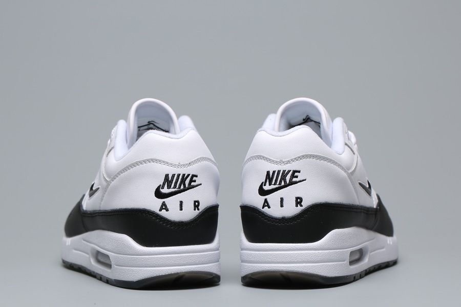 The Nike Air Max 1 Premium SC Jewel ‘Back Swoosh’ takes on a simple two-tone design, highlighted by a white leather upper with contrasting hits of black. The black appears on the mudguard, Nike Air branding at the tongue and heel and on the jewel Swoosh that gives the shoe its name. A smoky translucent outsole, complete with a modified waffle tread, reveals a large black Swoosh underneath.