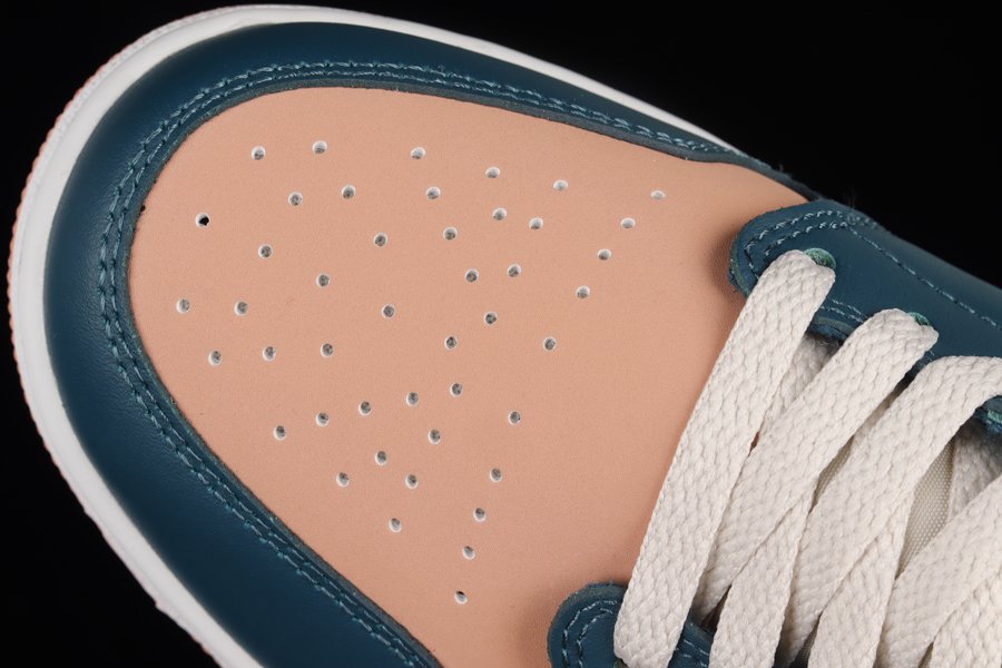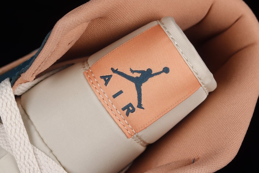 The sneaker features a dark emerald green upper with salmon pink featured on the toebox, Swoosh, Wings logo, and ankle collar. The nylon tongue is seen in taupe with a salmon pink tongue tag featuring the Jumpman in dark emerald green. A white midsole and salmon pink outsole finish off the sneaker.